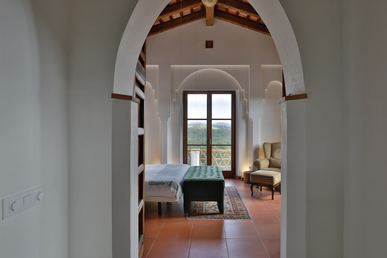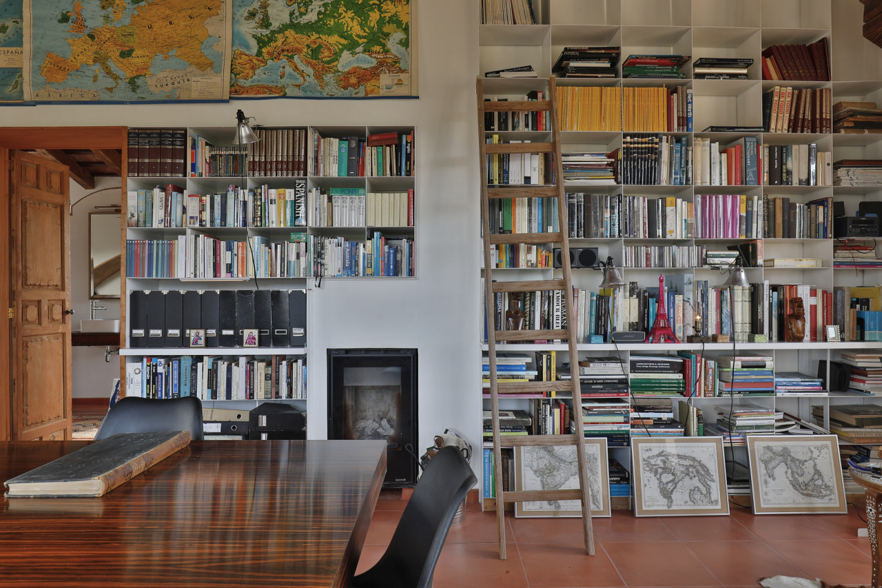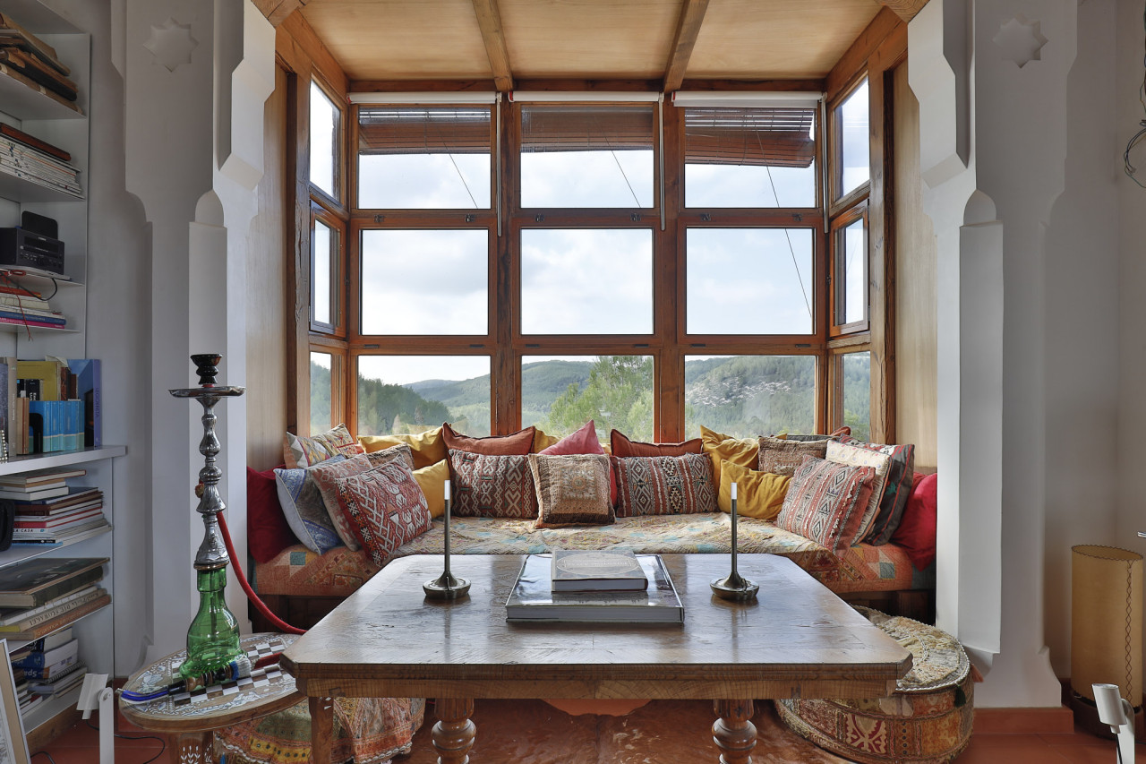 The interior continues the warm, handcrafted aesthetic with terracotta floors, exposed timber beams, carved wooden doors, and a striking library filled wall-to-wall with books — ideal for editorial portraits, brand campaigns, or atmospheric storytelling scenes. A sun-drenched reading nook framed by panoramic windows overlooks the surrounding hills, adding a serene and intimate space for shoots.