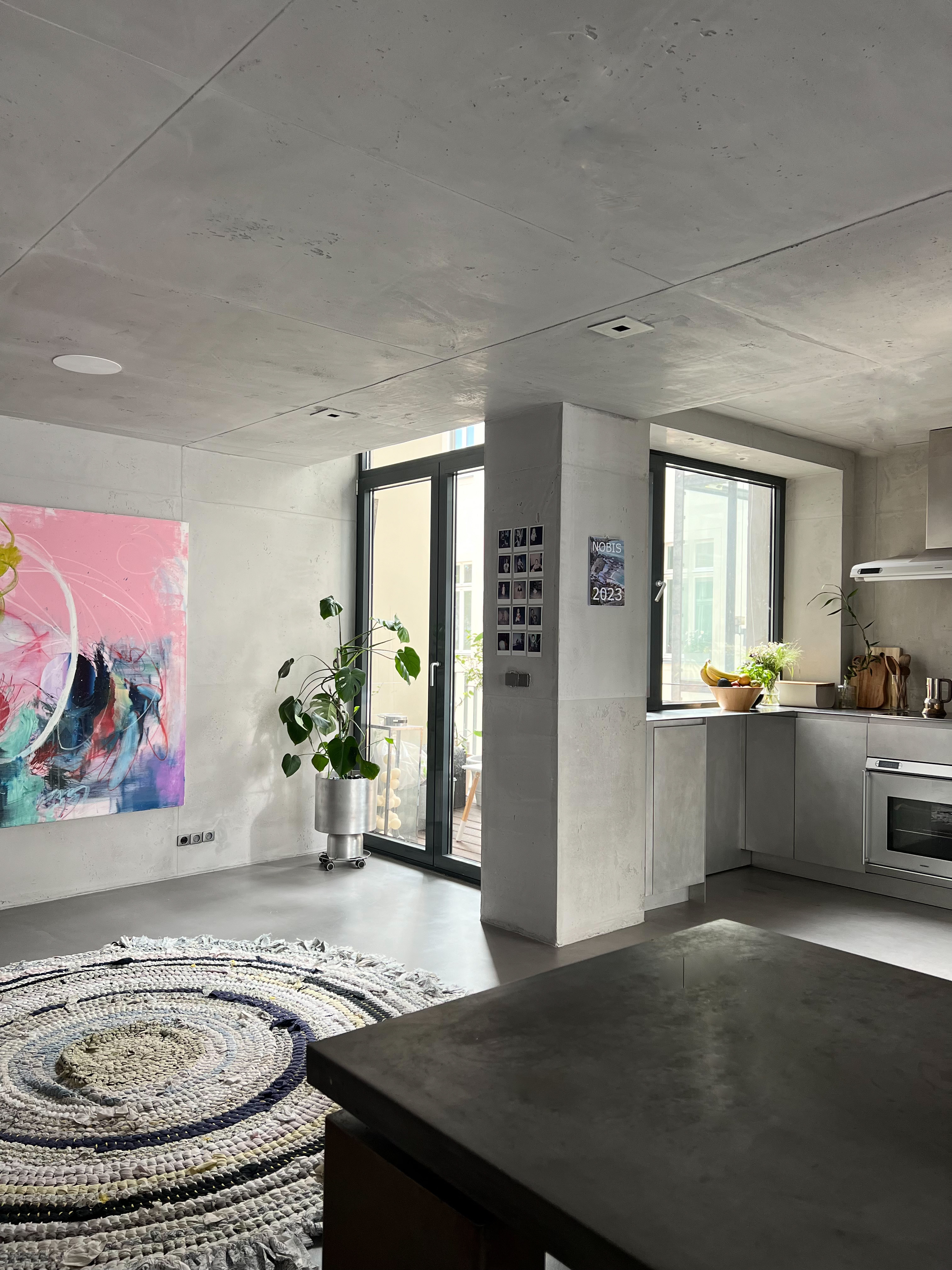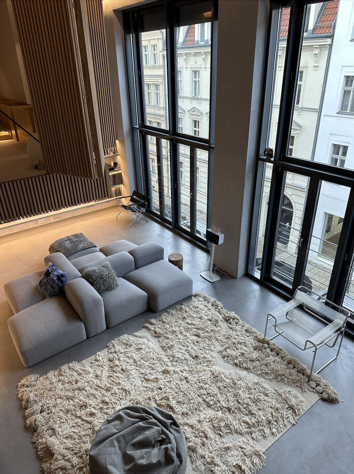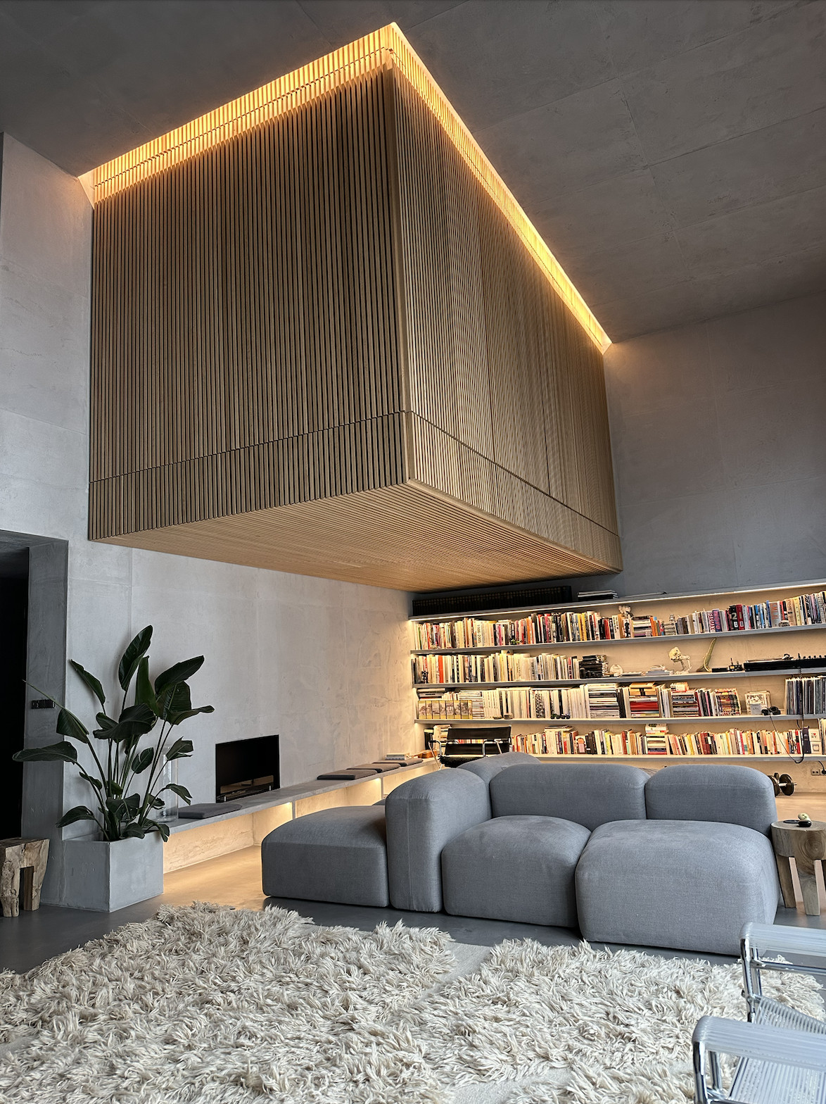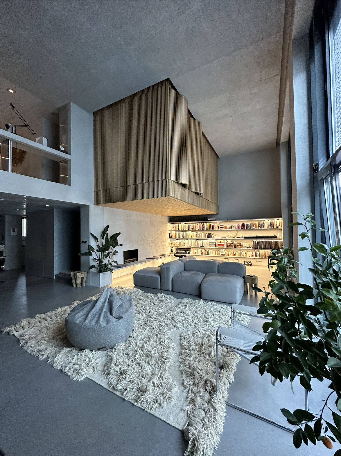 Experience the epitome of urban living in this meticulously designed minimalist apartment. The heart of this home is a sunlit kitchen featuring stainless steel appliances, neat jar arrangements, and a stunning abstract painting, complemented by a chic round rug. Flowing into the living areas, you'll find plush gray sofas, expansive bookshelves, and tasteful green accents, creating a serene yet inviting atmosphere. Each room boasts an airy, open space design, with large windows that bathe the interiors in natural light, enhancing the modern aesthetic and tranquil vibes. The bedrooms and bathrooms follow a minimalist theme with sleek wooden paneling, soft lighting, and high-end fixtures. The master bathroom is particularly impressive with a large window and red-lit shower, providing a unique touch of luxury and drama.