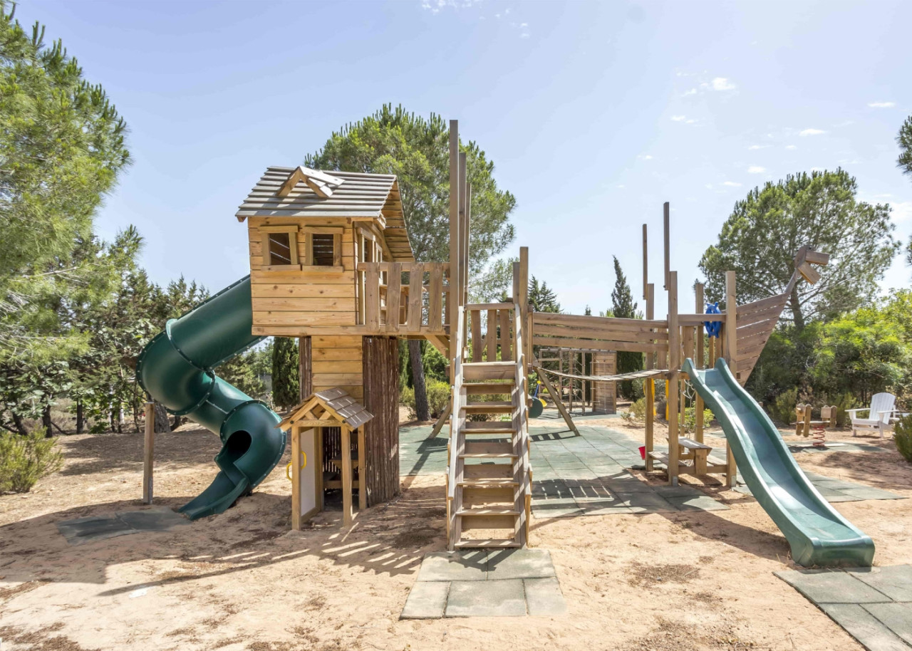 Playground with swings, slide, trampolin and 2 small wendy houses