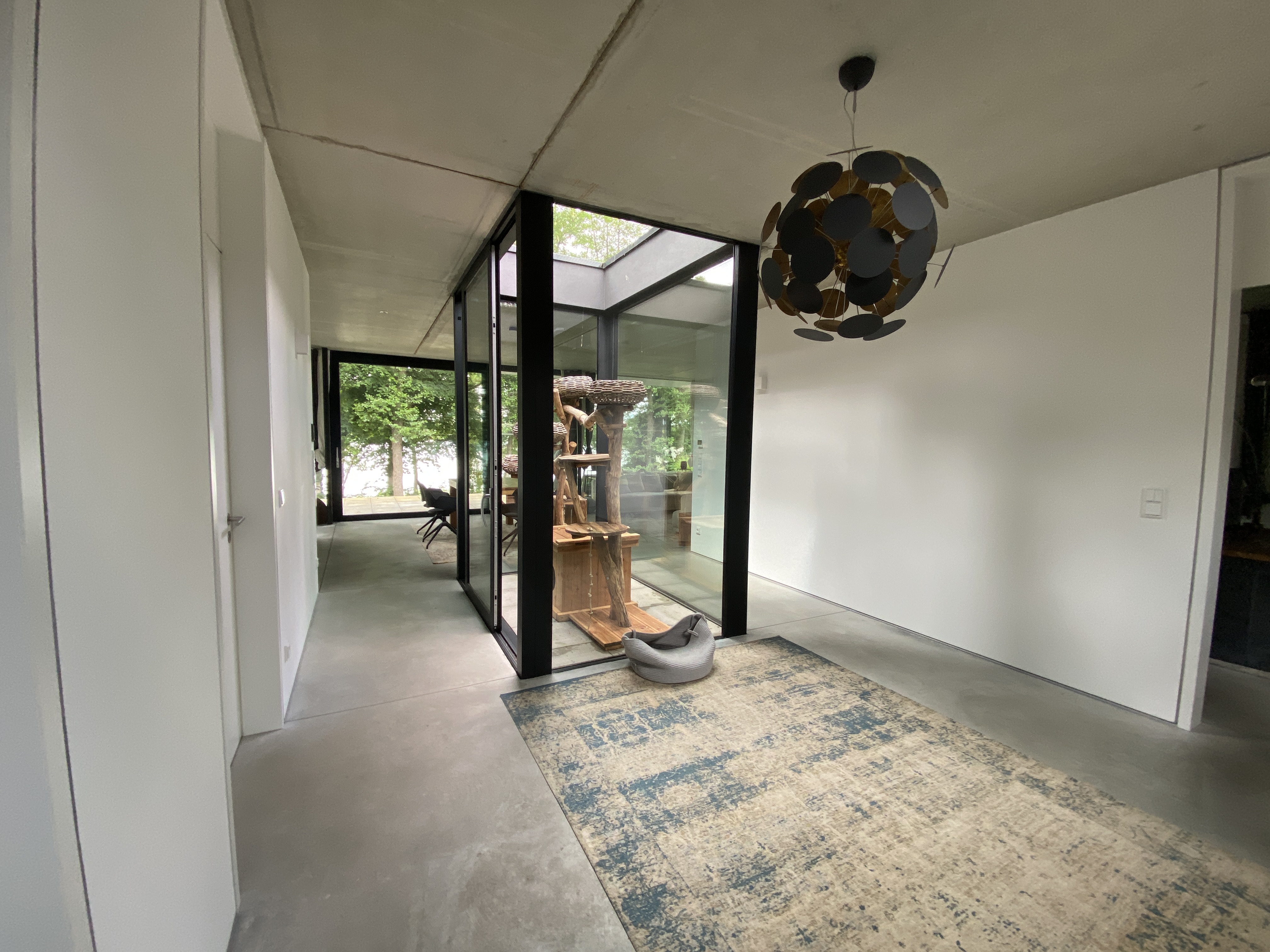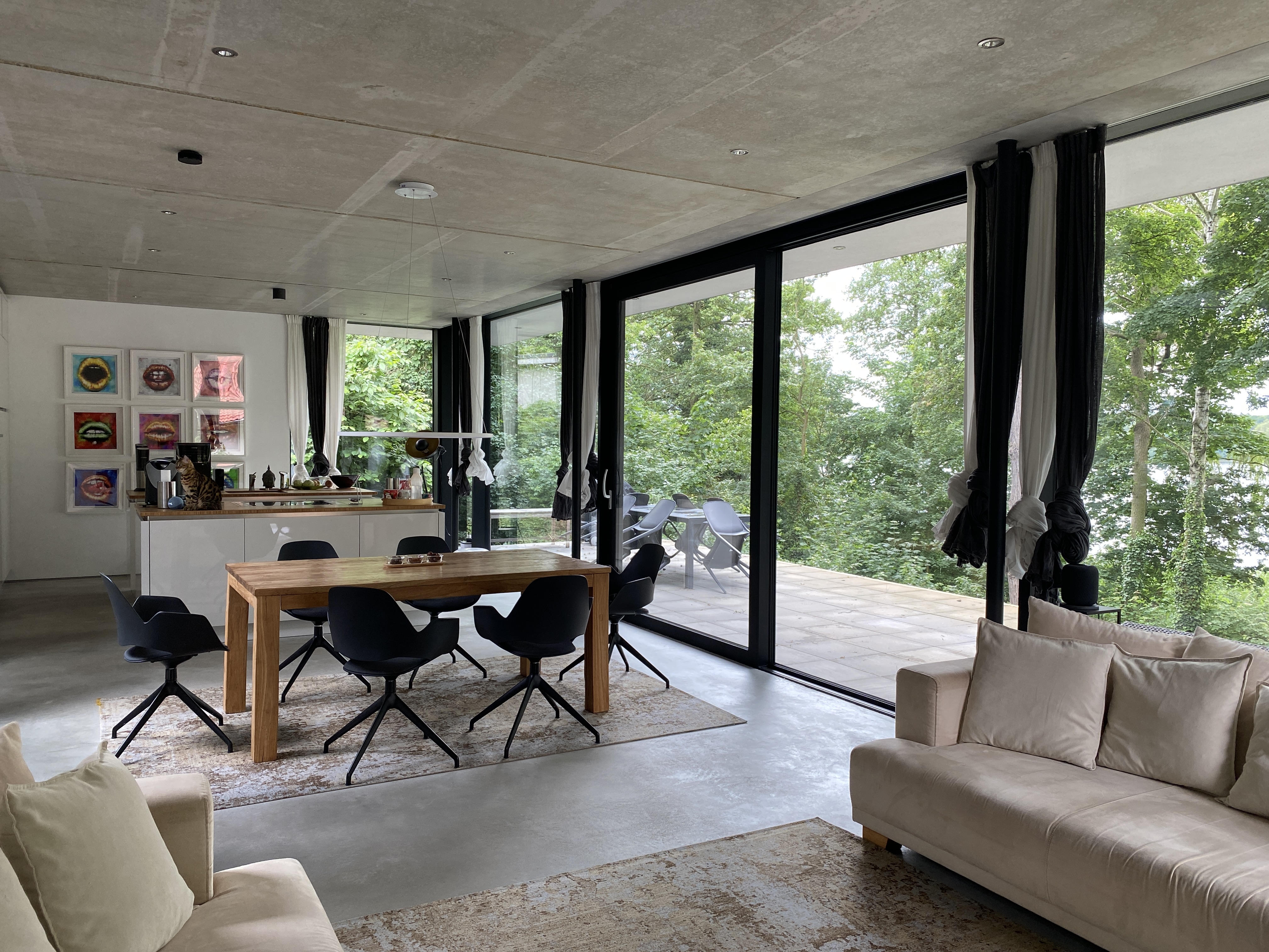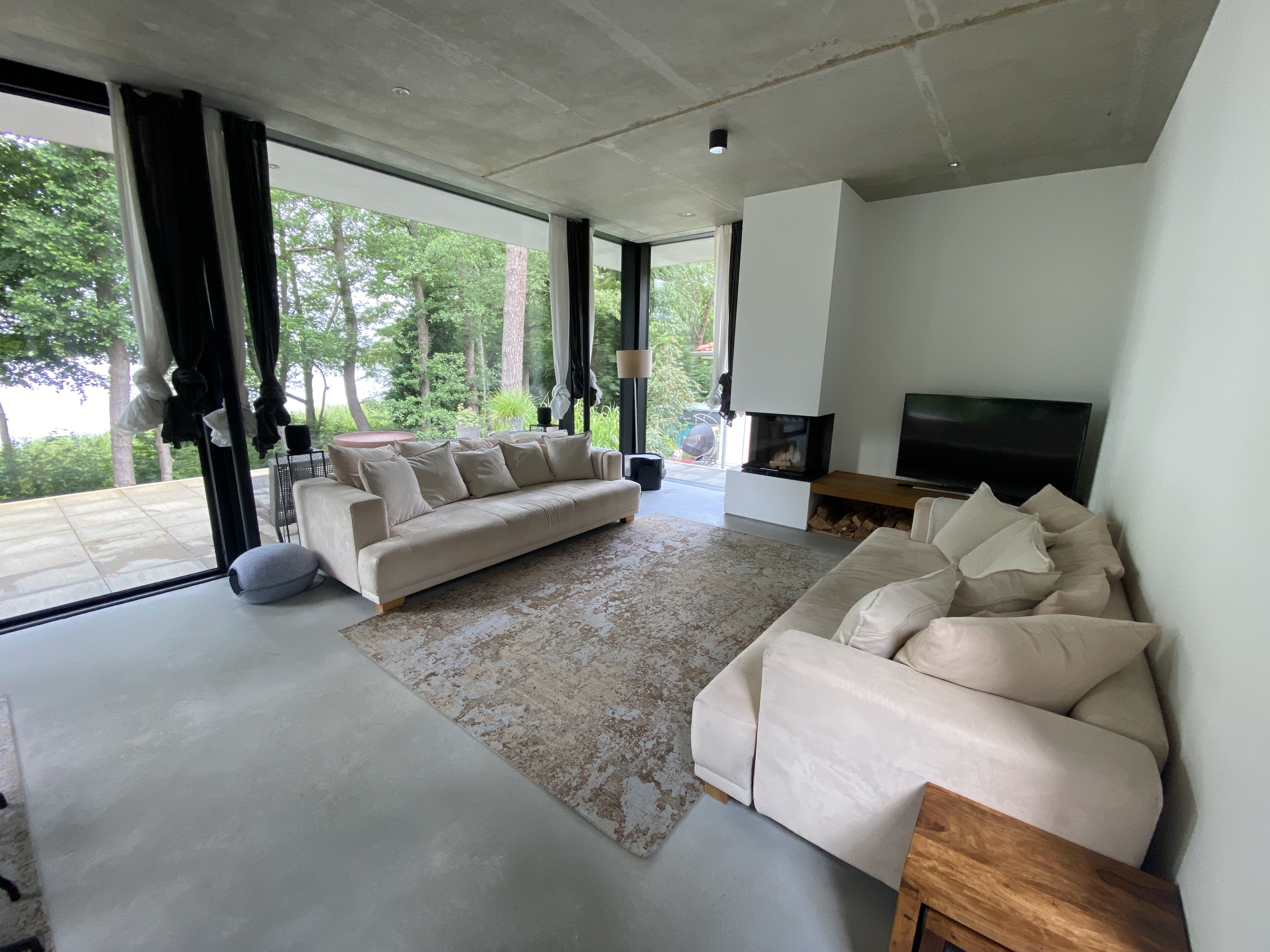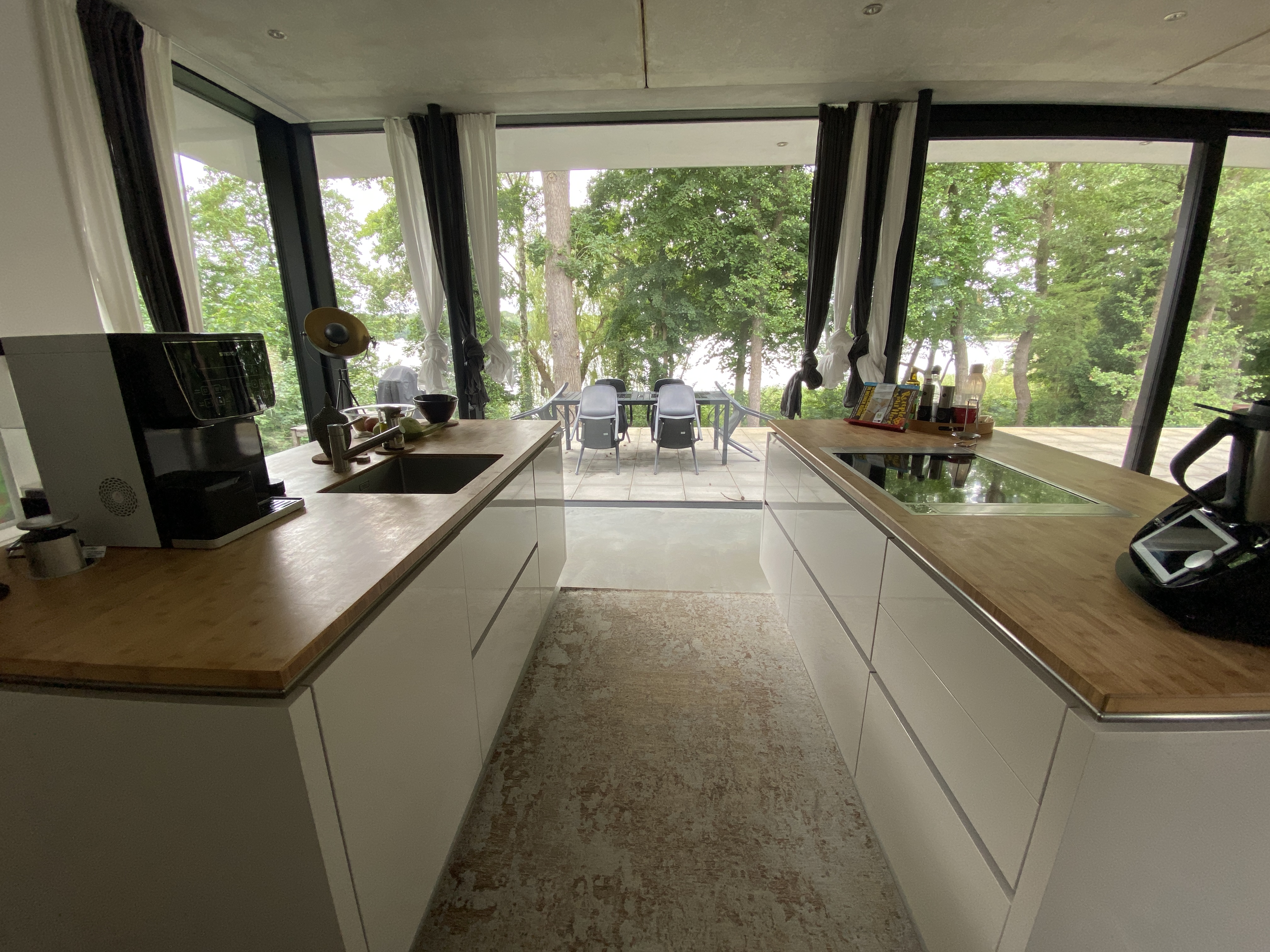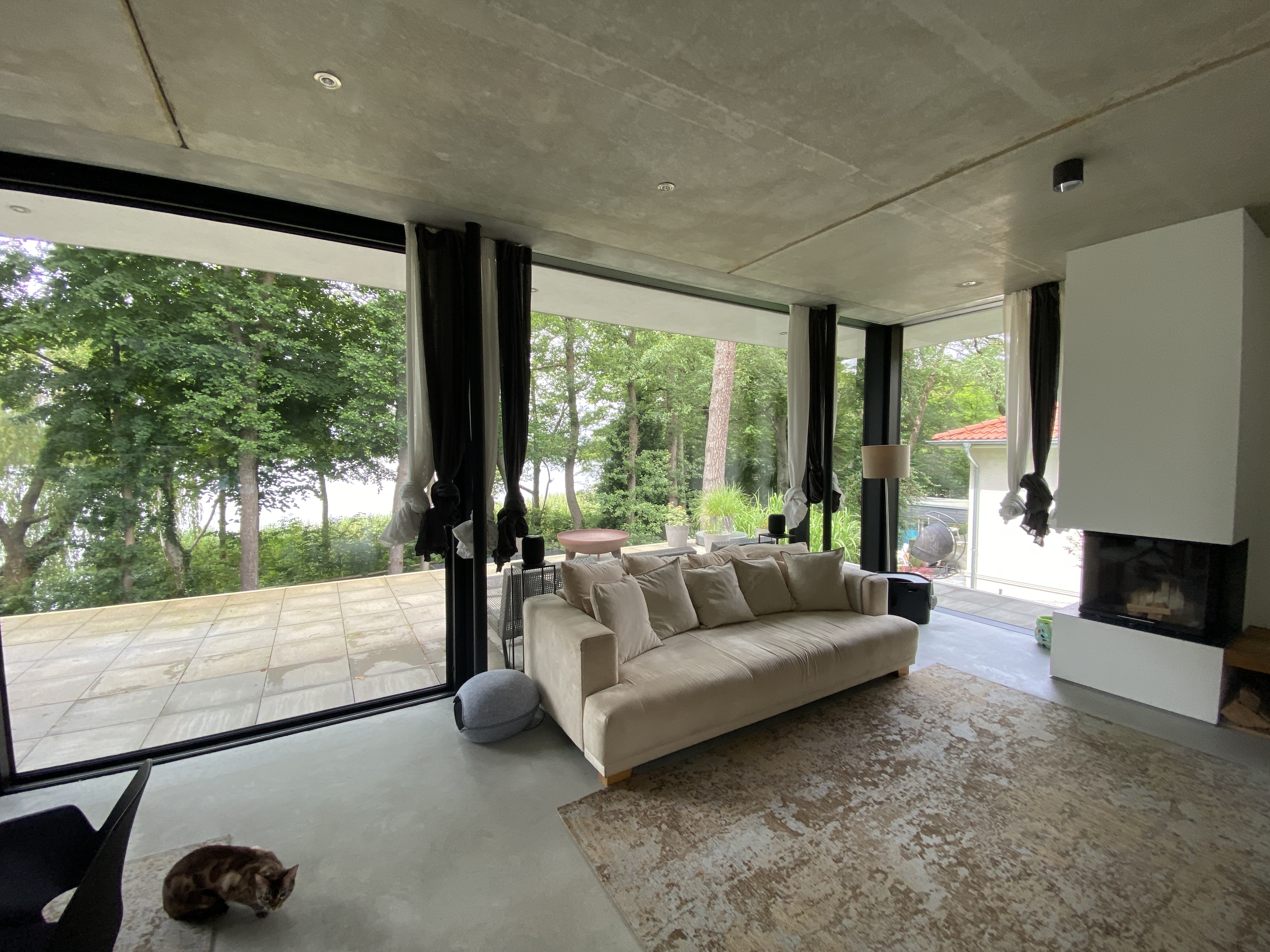 Nestled in a serene forest and bordered by a tranquil lake, this stunning modern home offers a perfect blend of natural beauty and architectural elegance. The house features expansive glass walls that provide unobstructed views of the lush greenery and silhouetted sunset over the lake, creating an environment of peace and calm. This home is designed with a modern minimalistic approach, integrating high-end finishes like polished wood, sleek kitchen appliances, and large, airy spaces that blend seamlessly with the outdoor surroundings.