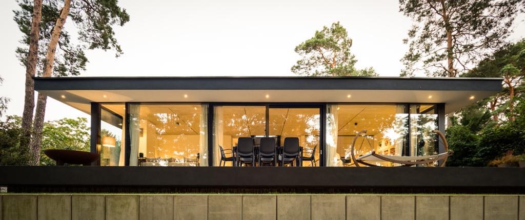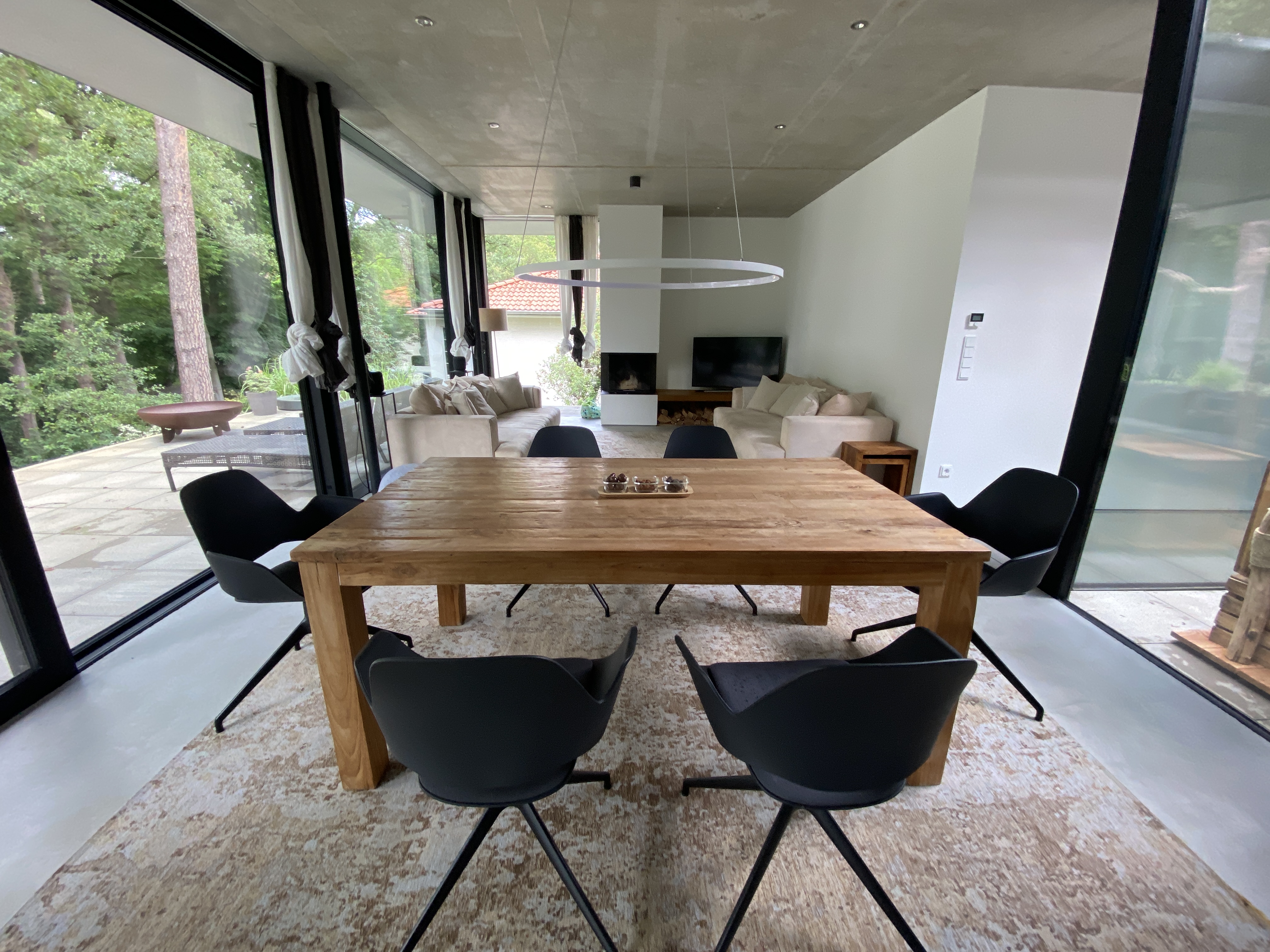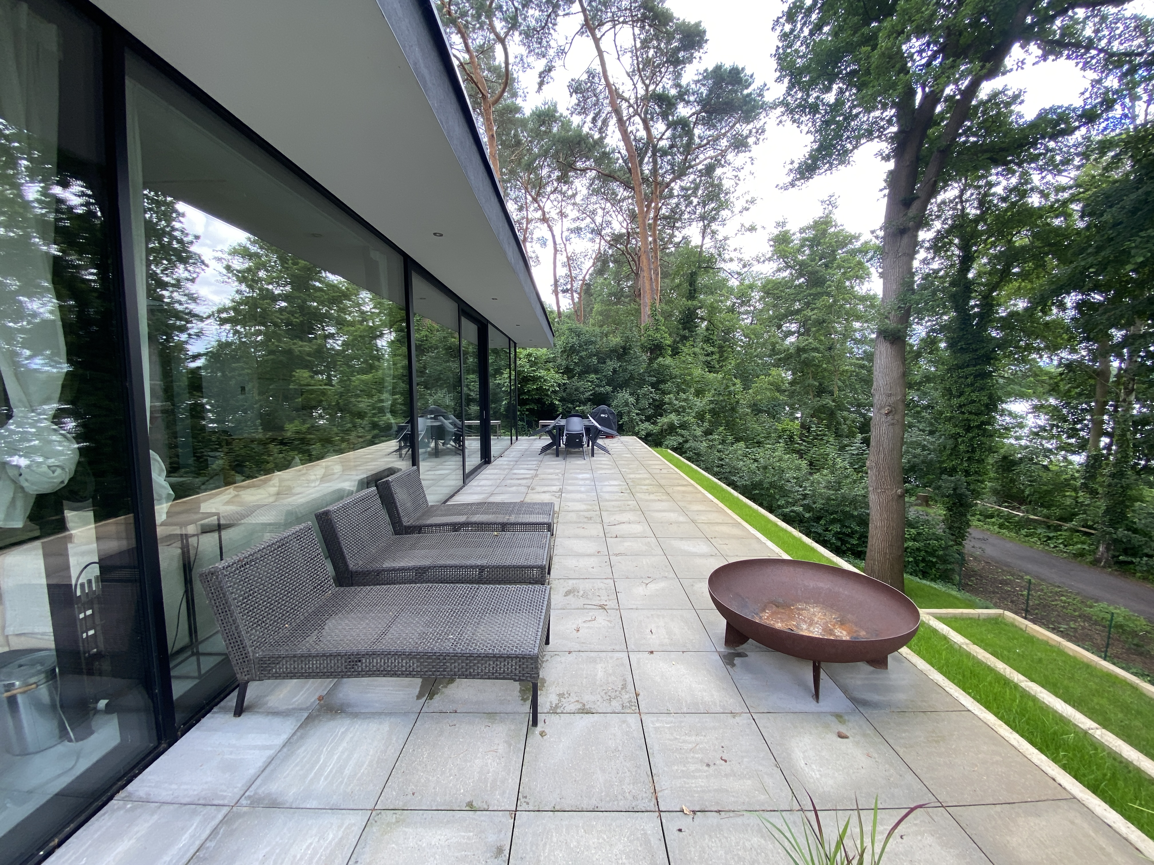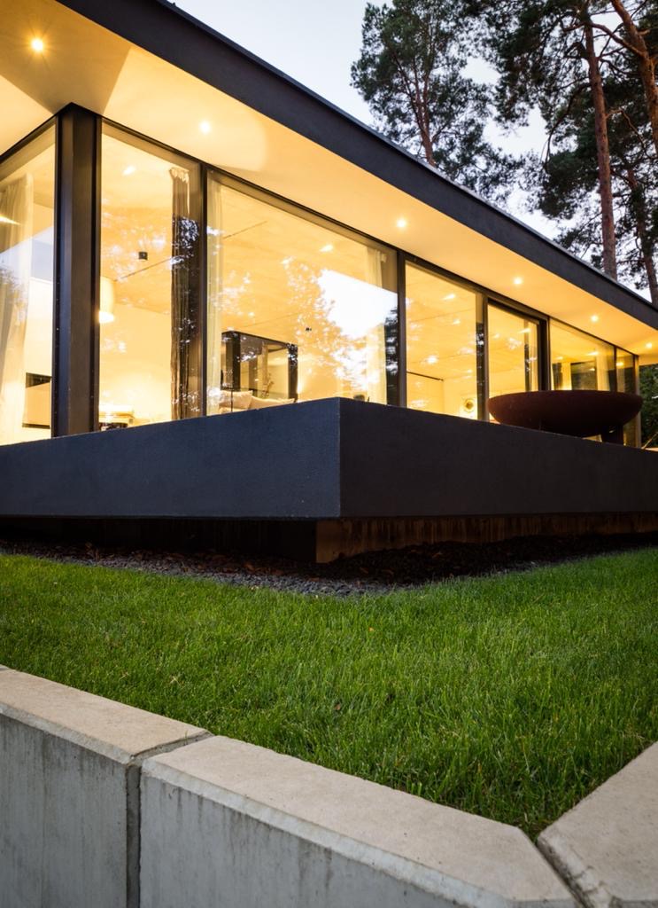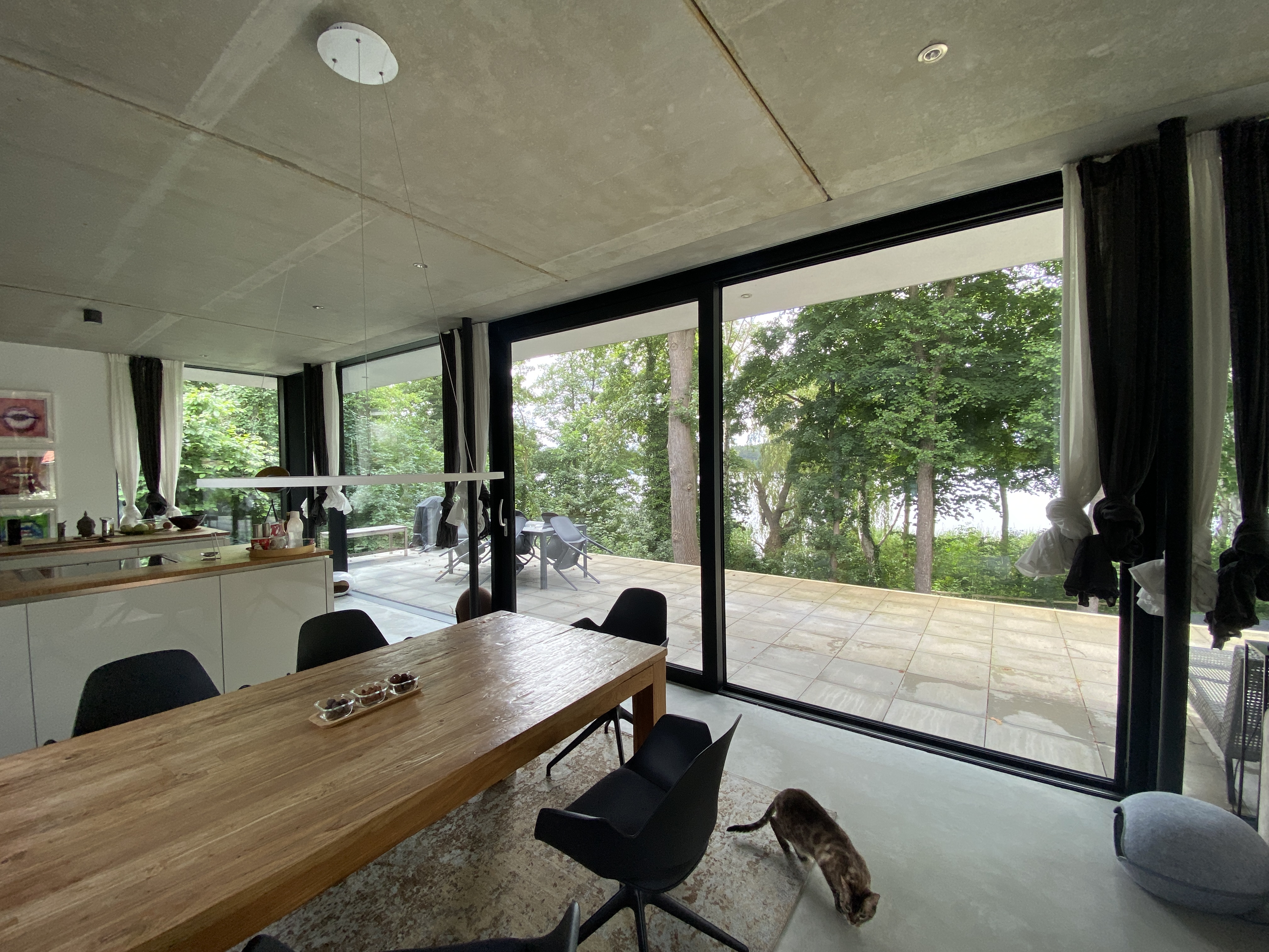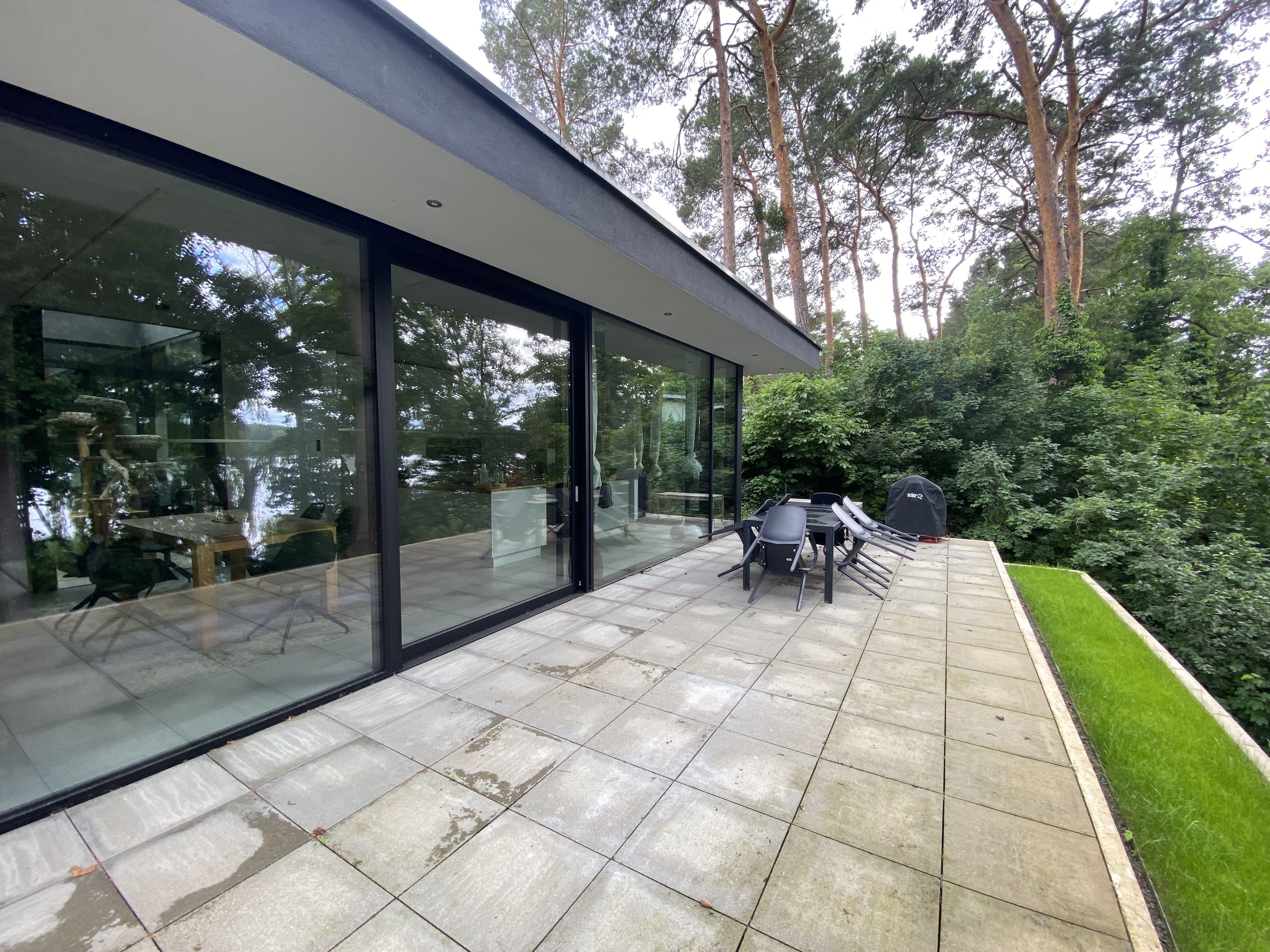 Nestled in a serene forest and bordered by a tranquil lake, this stunning modern home offers a perfect blend of natural beauty and architectural elegance. The house features expansive glass walls that provide unobstructed views of the lush greenery and silhouetted sunset over the lake, creating an environment of peace and calm. This home is designed with a modern minimalistic approach, integrating high-end finishes like polished wood, sleek kitchen appliances, and large, airy spaces that blend seamlessly with the outdoor surroundings.