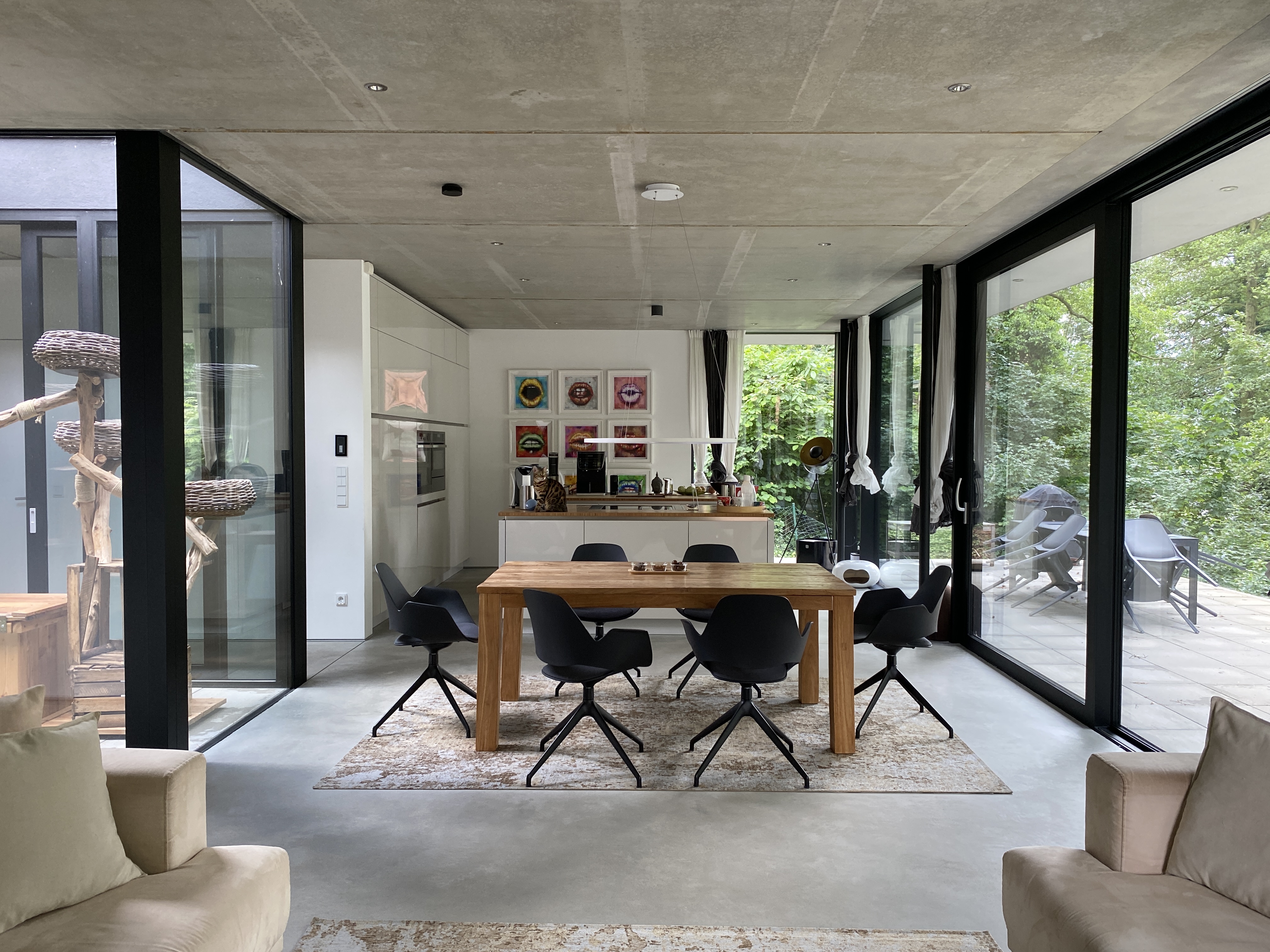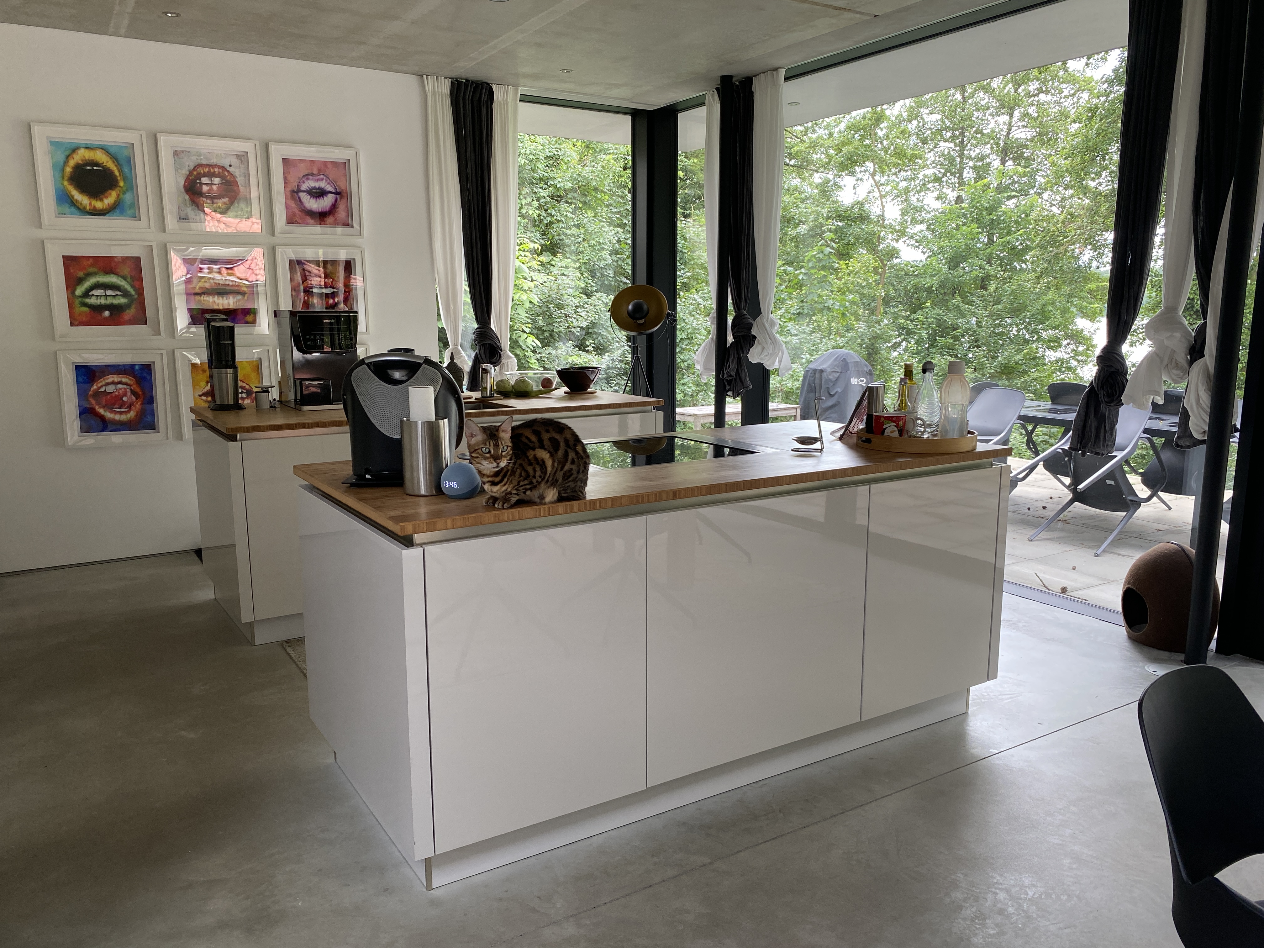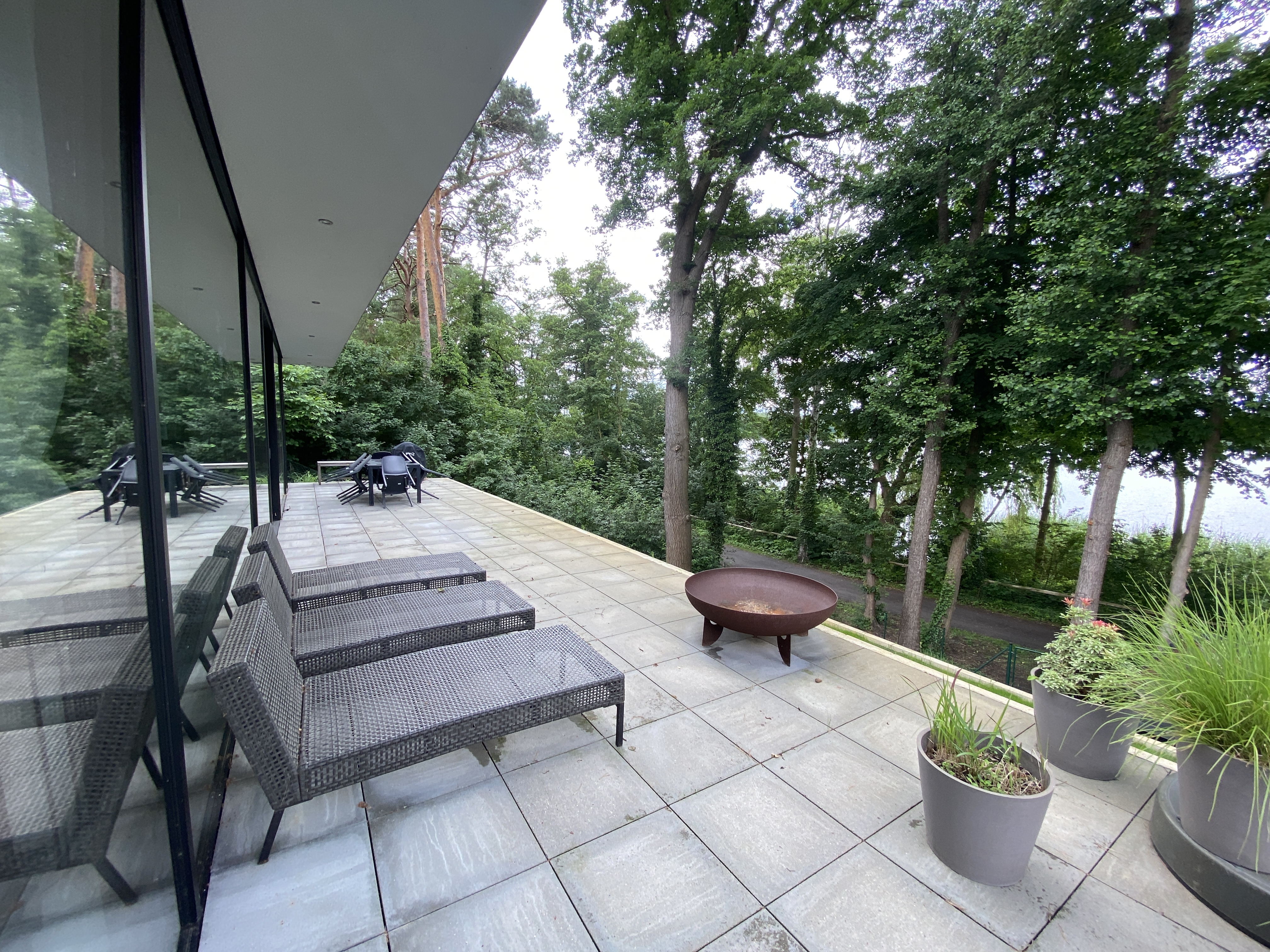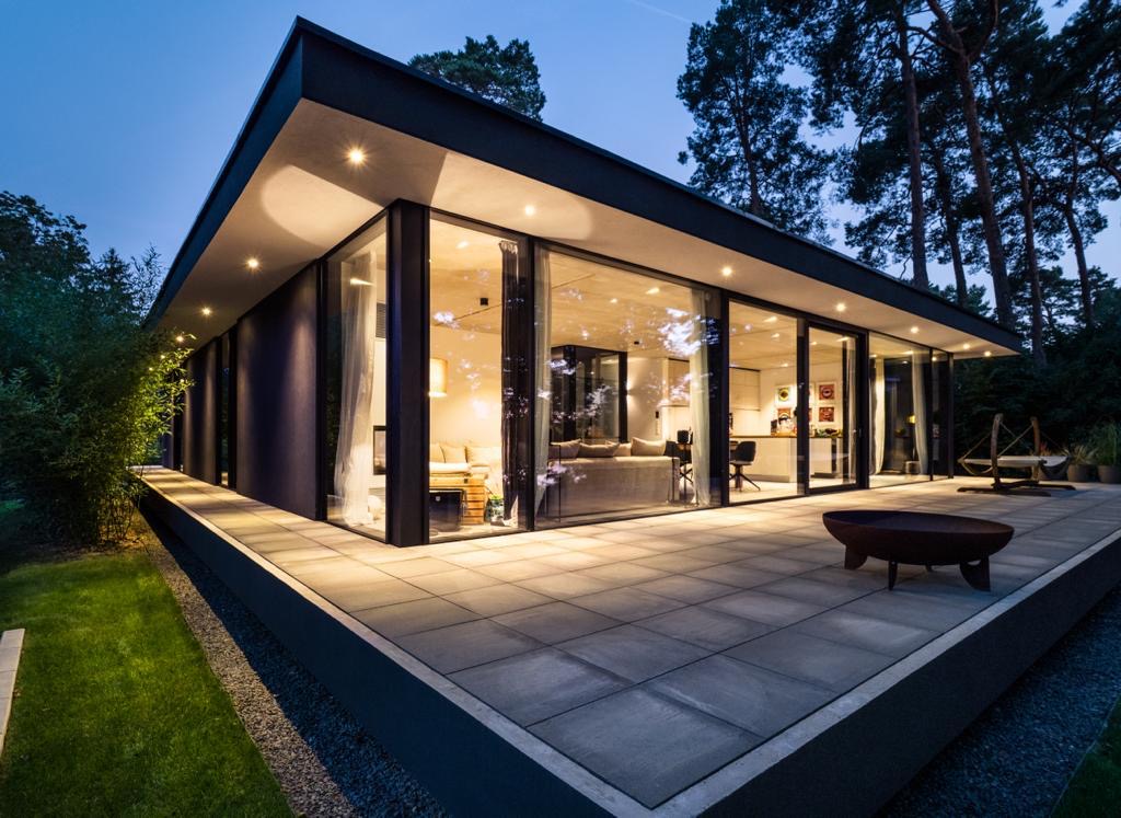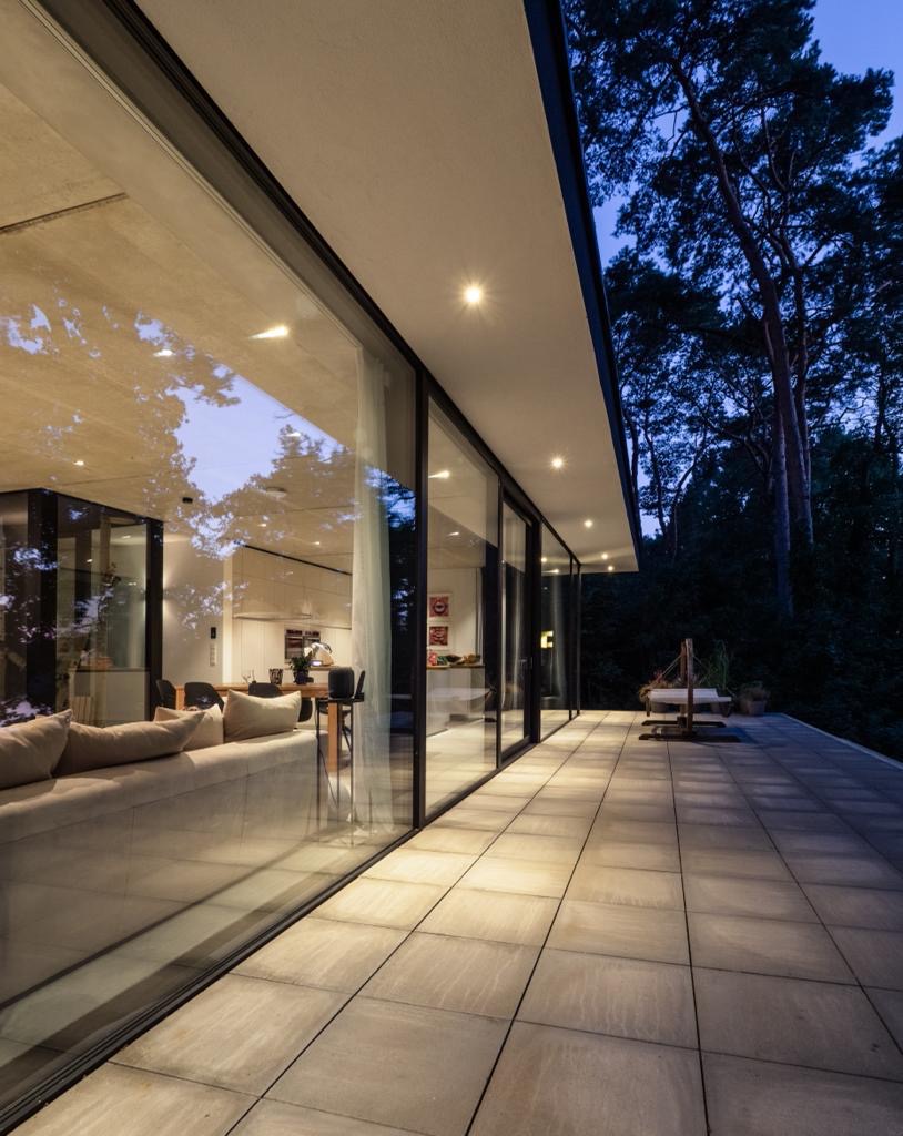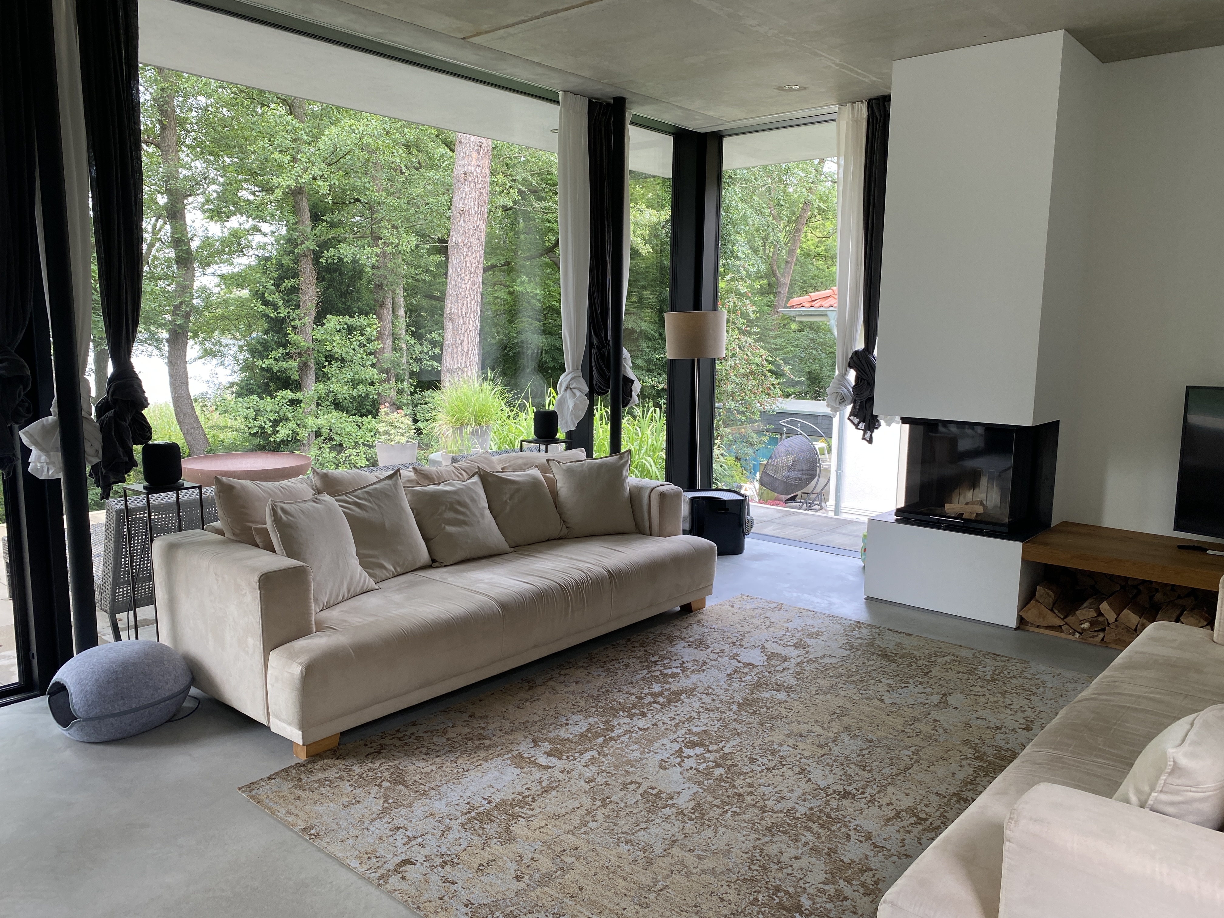 Nestled in a serene forest and bordered by a tranquil lake, this stunning modern home offers a perfect blend of natural beauty and architectural elegance. The house features expansive glass walls that provide unobstructed views of the lush greenery and silhouetted sunset over the lake, creating an environment of peace and calm. This home is designed with a modern minimalistic approach, integrating high-end finishes like polished wood, sleek kitchen appliances, and large, airy spaces that blend seamlessly with the outdoor surroundings.