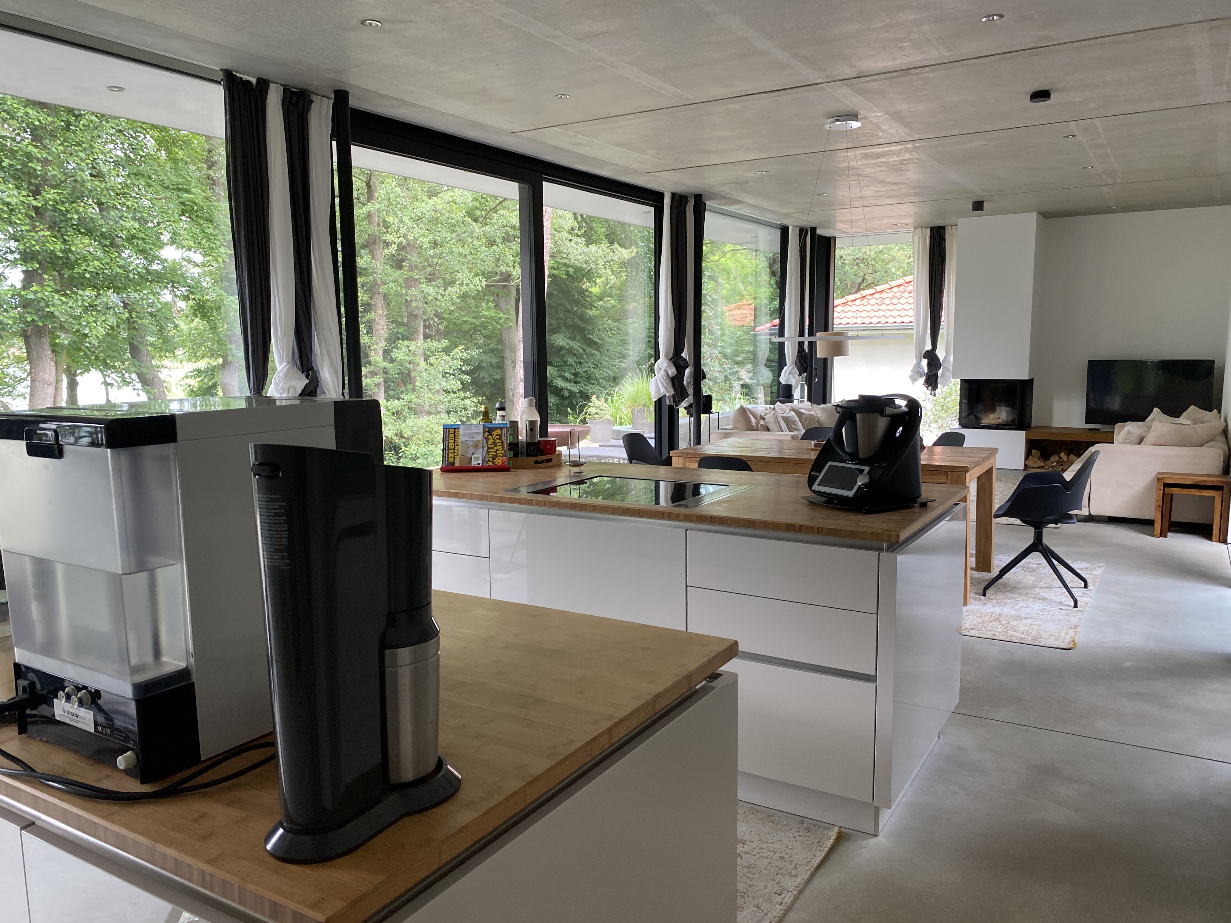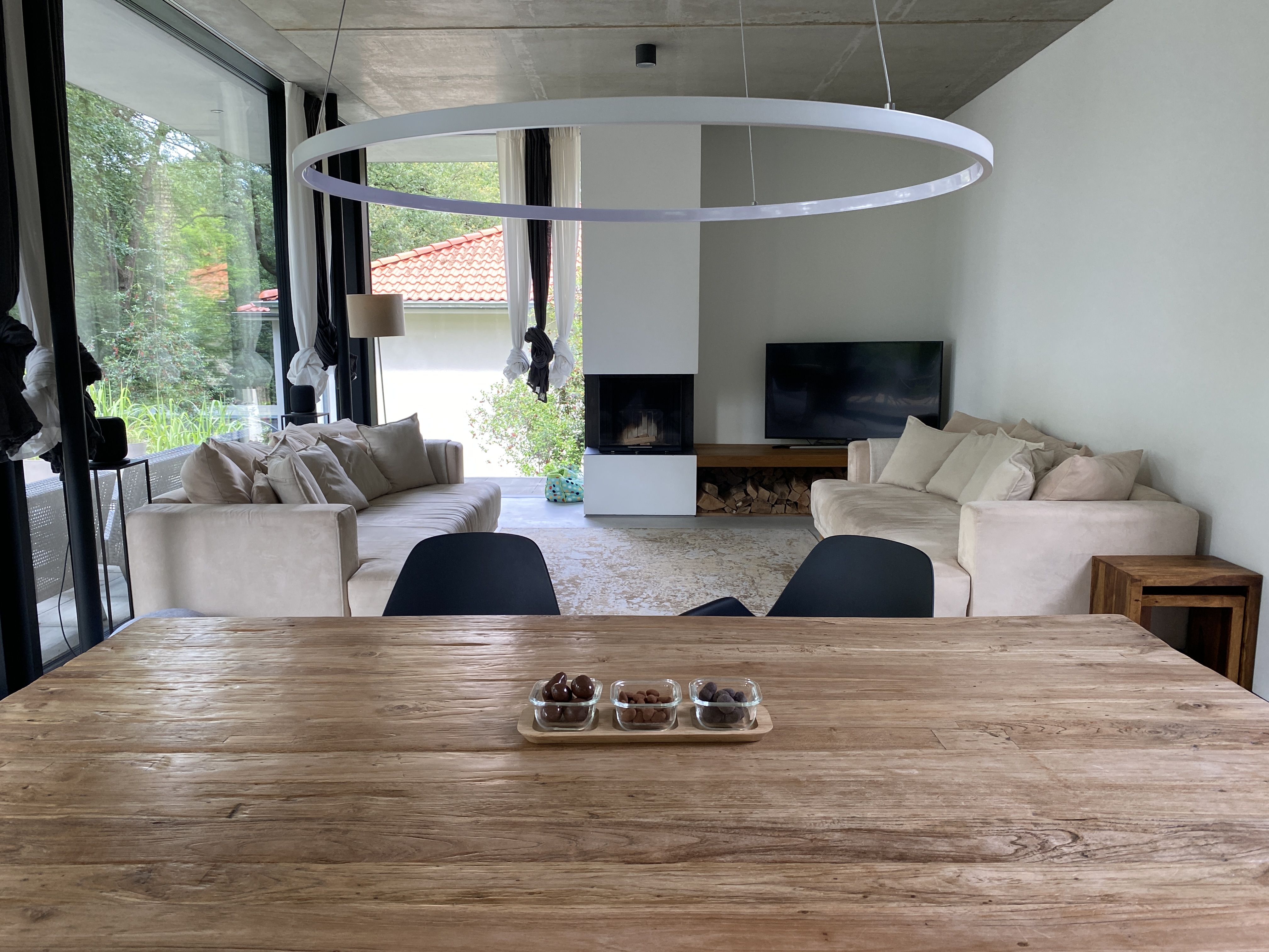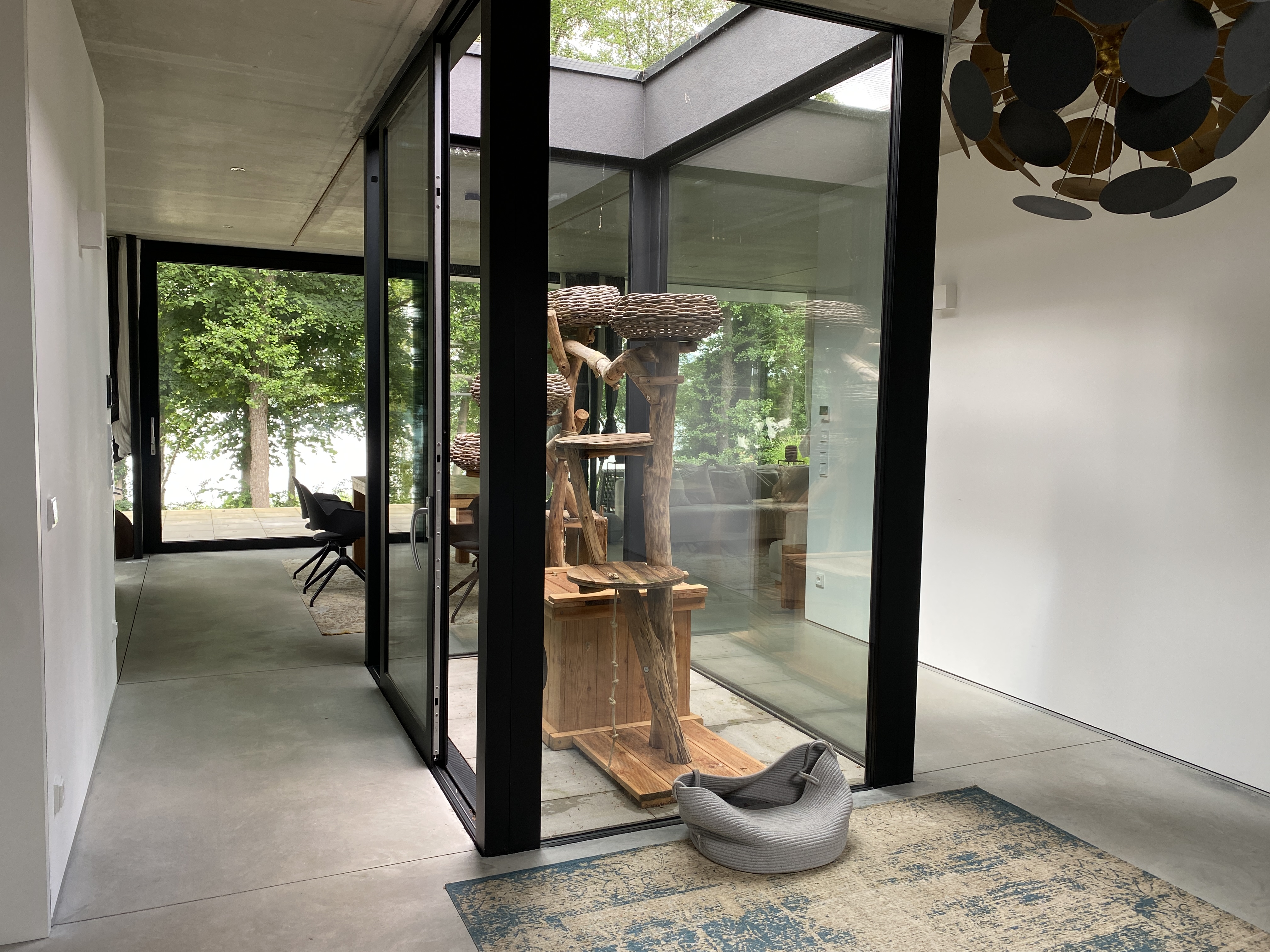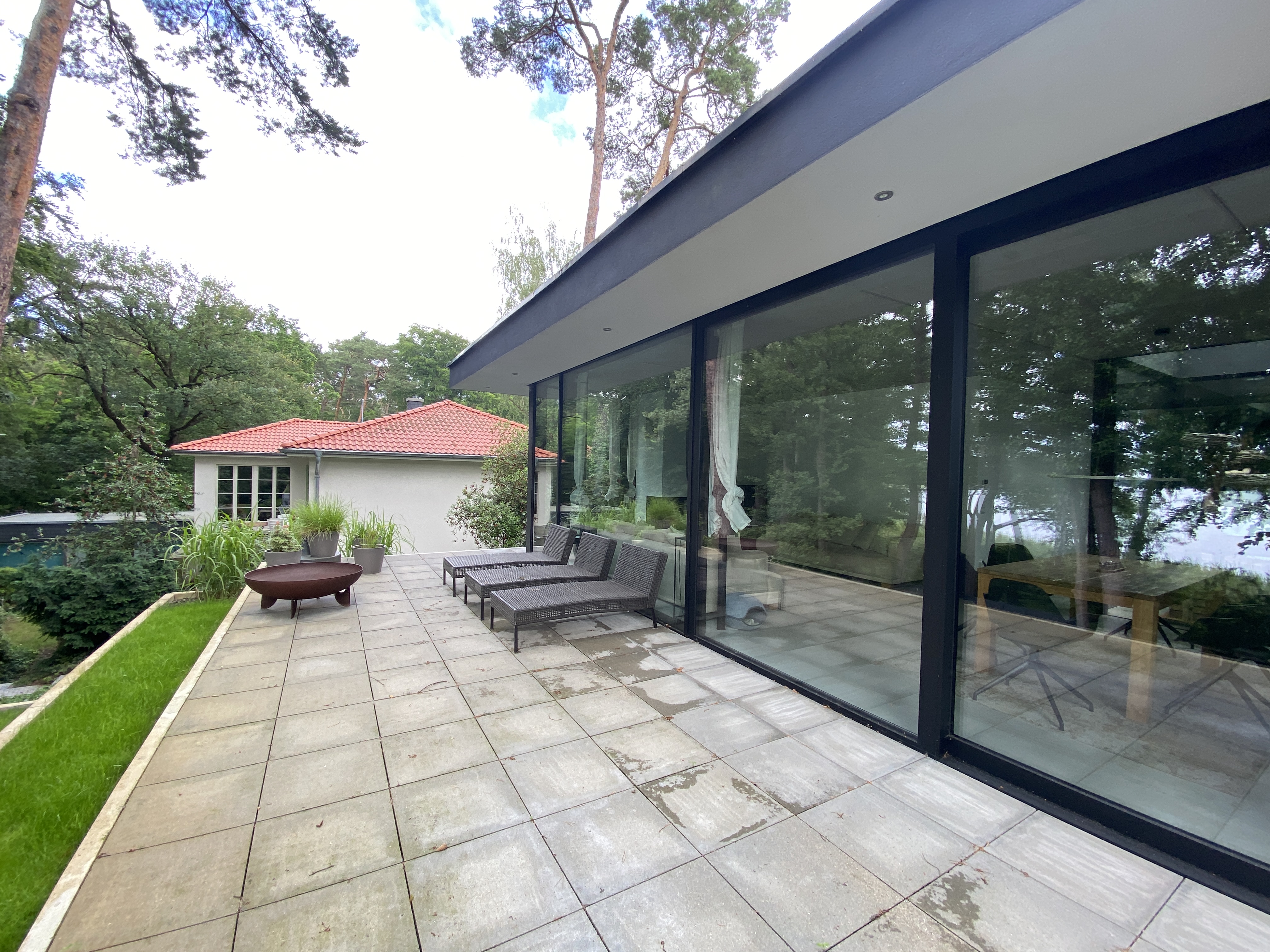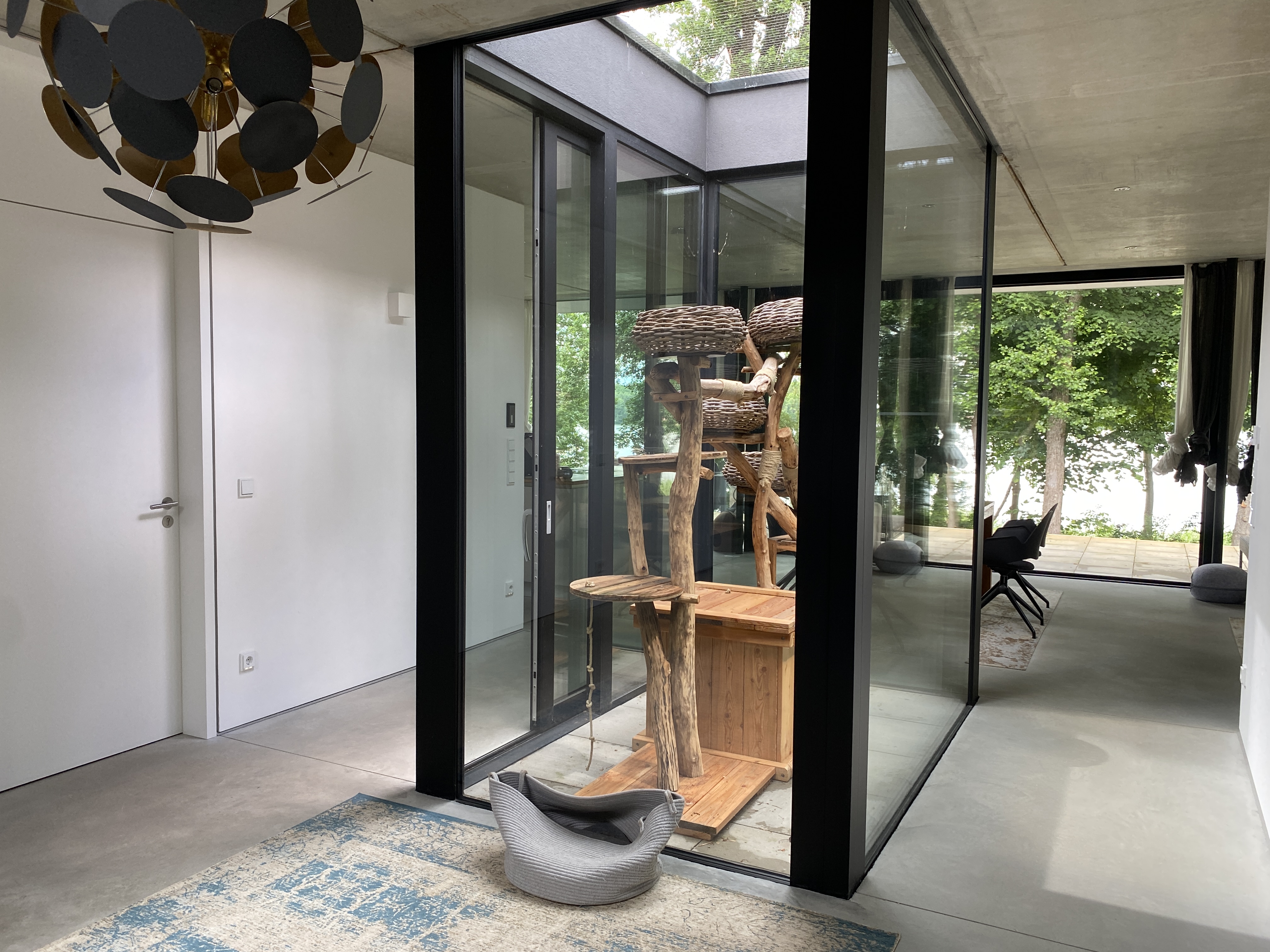 Nestled in a serene forest and bordered by a tranquil lake, this stunning modern home offers a perfect blend of natural beauty and architectural elegance. The house features expansive glass walls that provide unobstructed views of the lush greenery and silhouetted sunset over the lake, creating an environment of peace and calm. This home is designed with a modern minimalistic approach, integrating high-end finishes like polished wood, sleek kitchen appliances, and large, airy spaces that blend seamlessly with the outdoor surroundings.