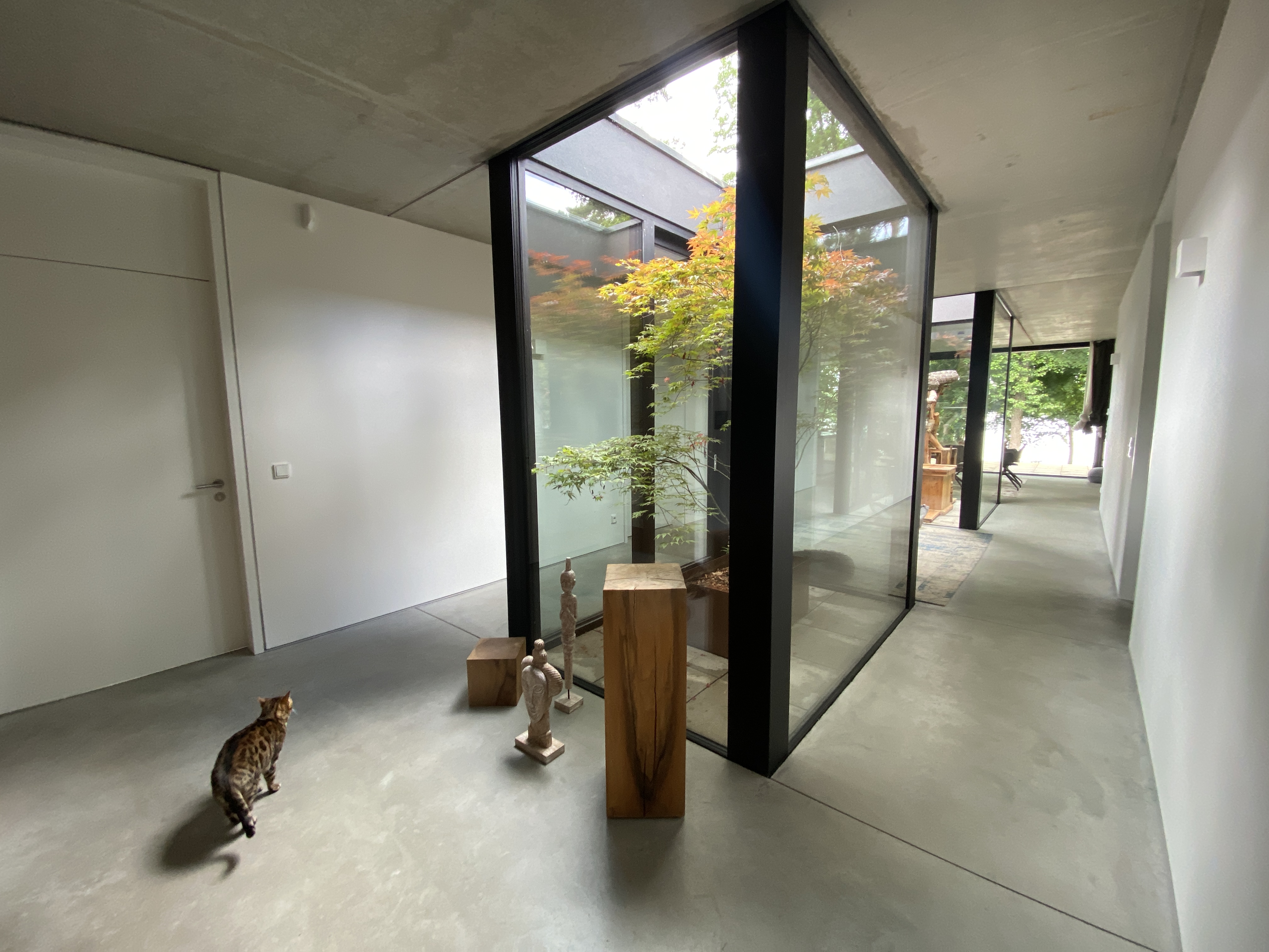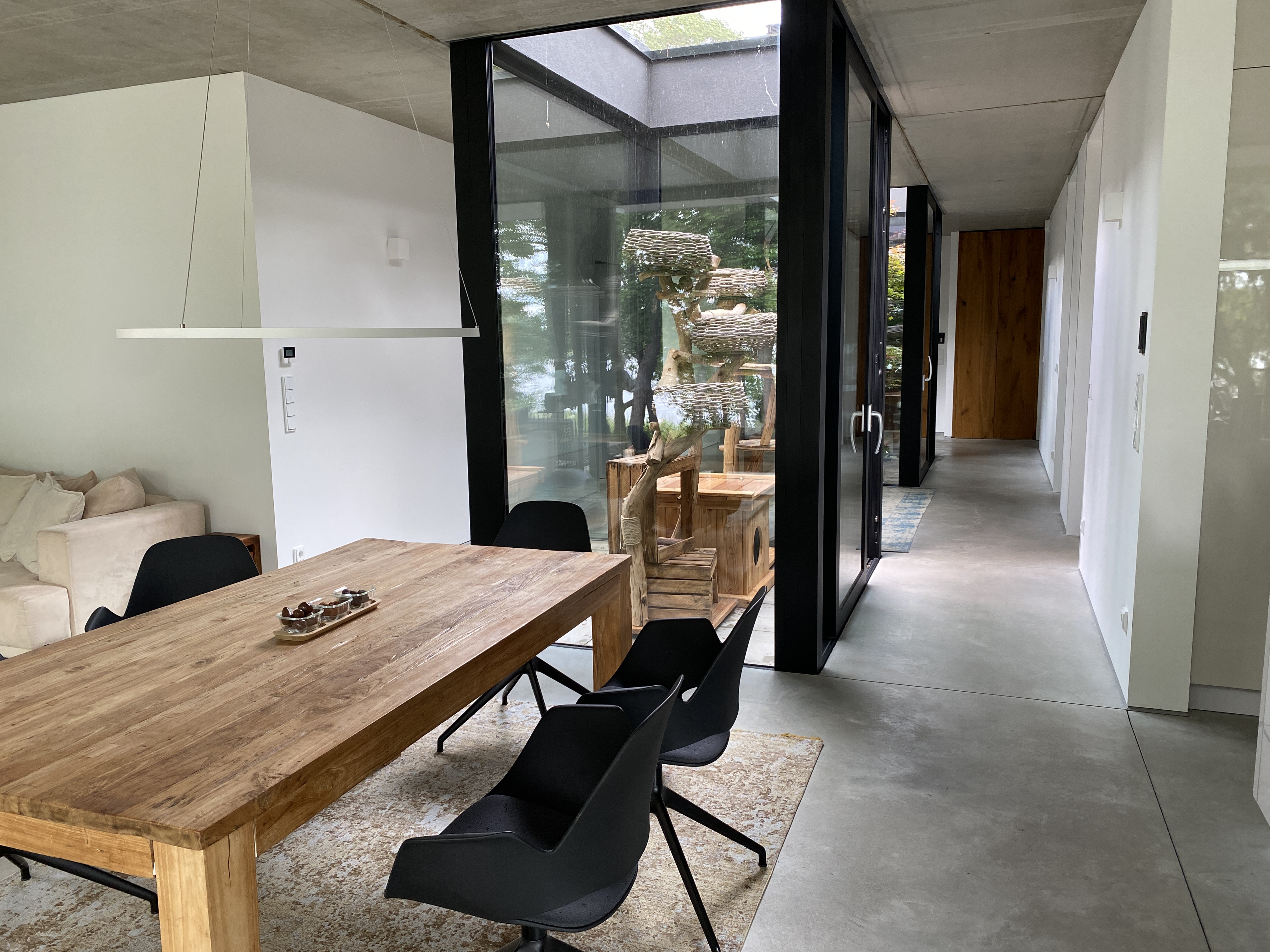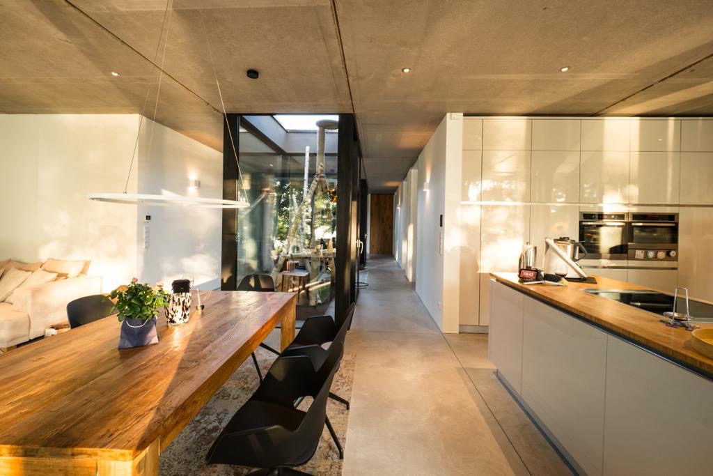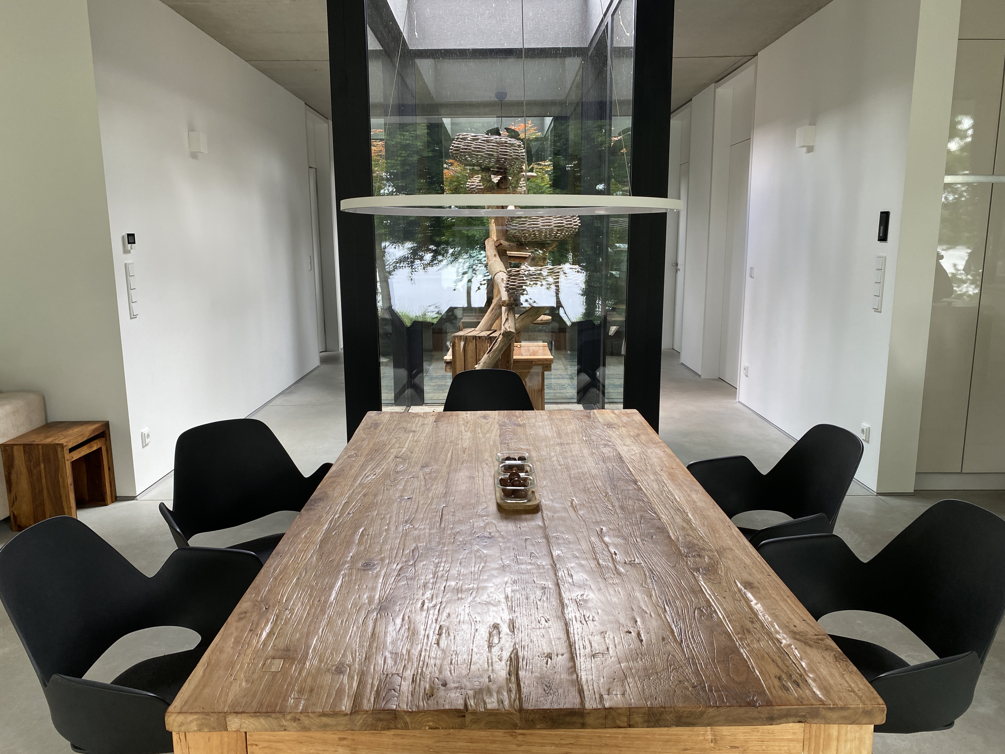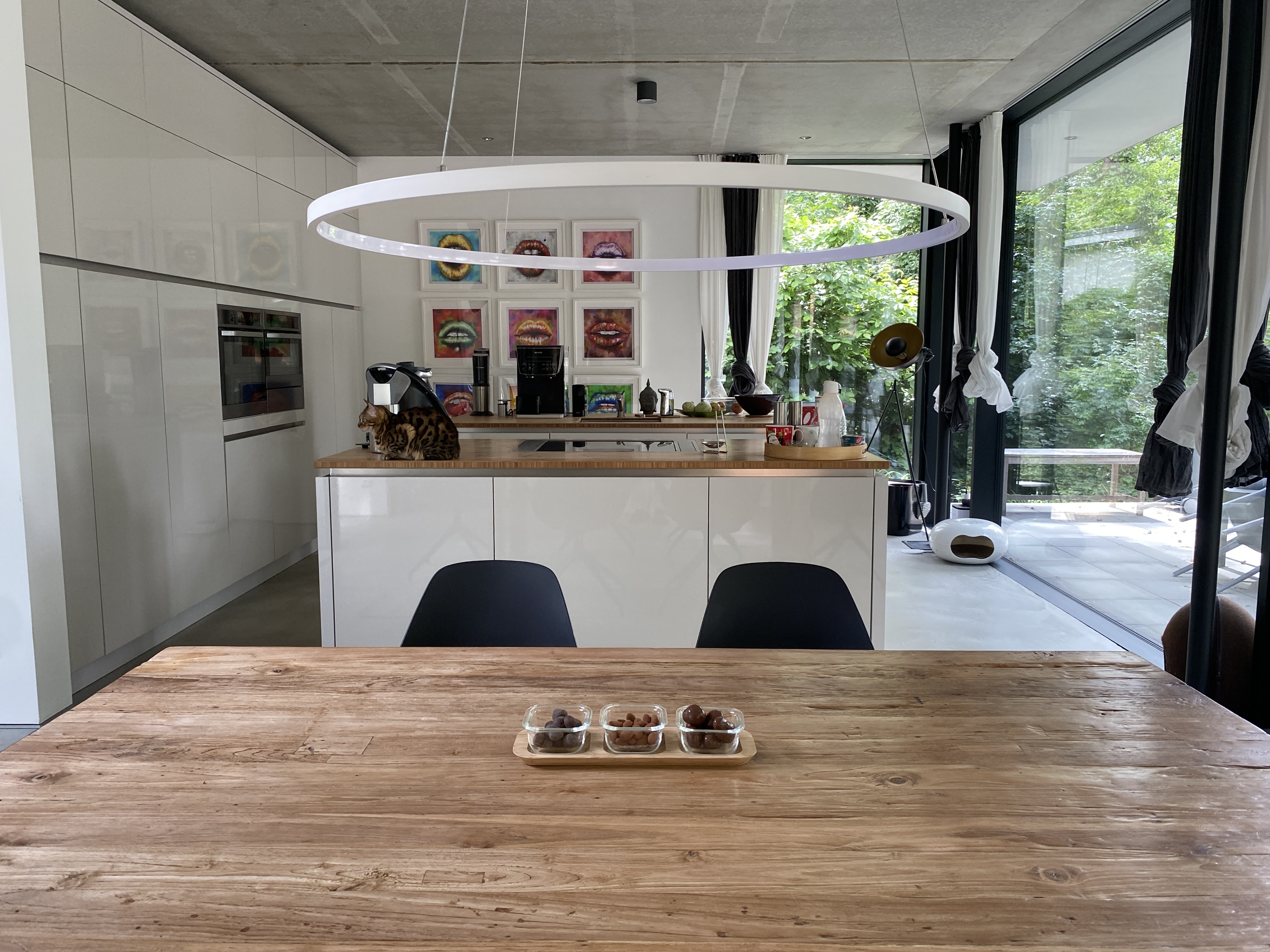 Nestled in a serene forest and bordered by a tranquil lake, this stunning modern home offers a perfect blend of natural beauty and architectural elegance. The house features expansive glass walls that provide unobstructed views of the lush greenery and silhouetted sunset over the lake, creating an environment of peace and calm. This home is designed with a modern minimalistic approach, integrating high-end finishes like polished wood, sleek kitchen appliances, and large, airy spaces that blend seamlessly with the outdoor surroundings.