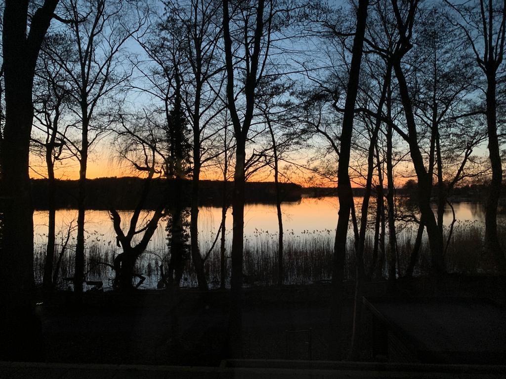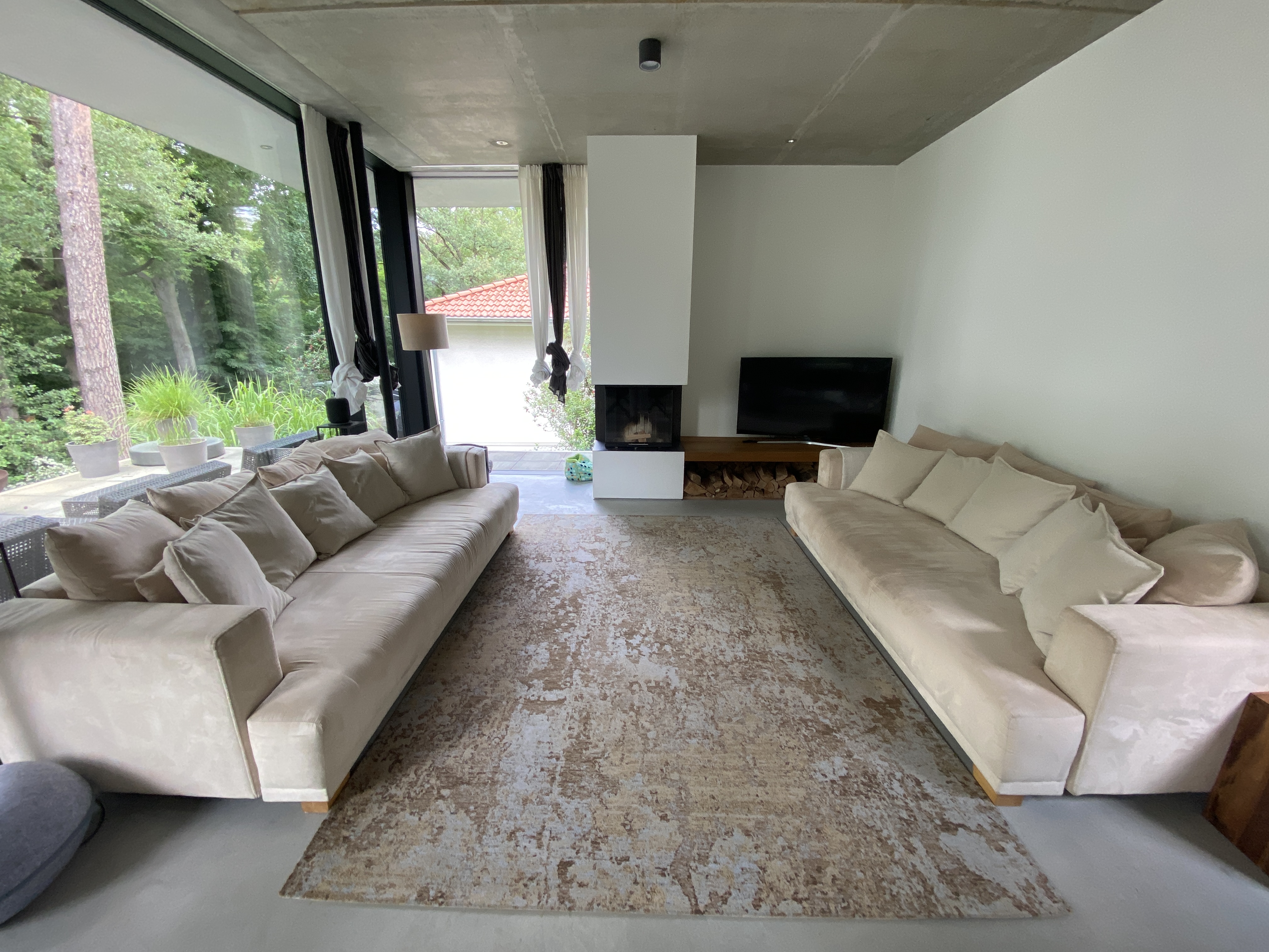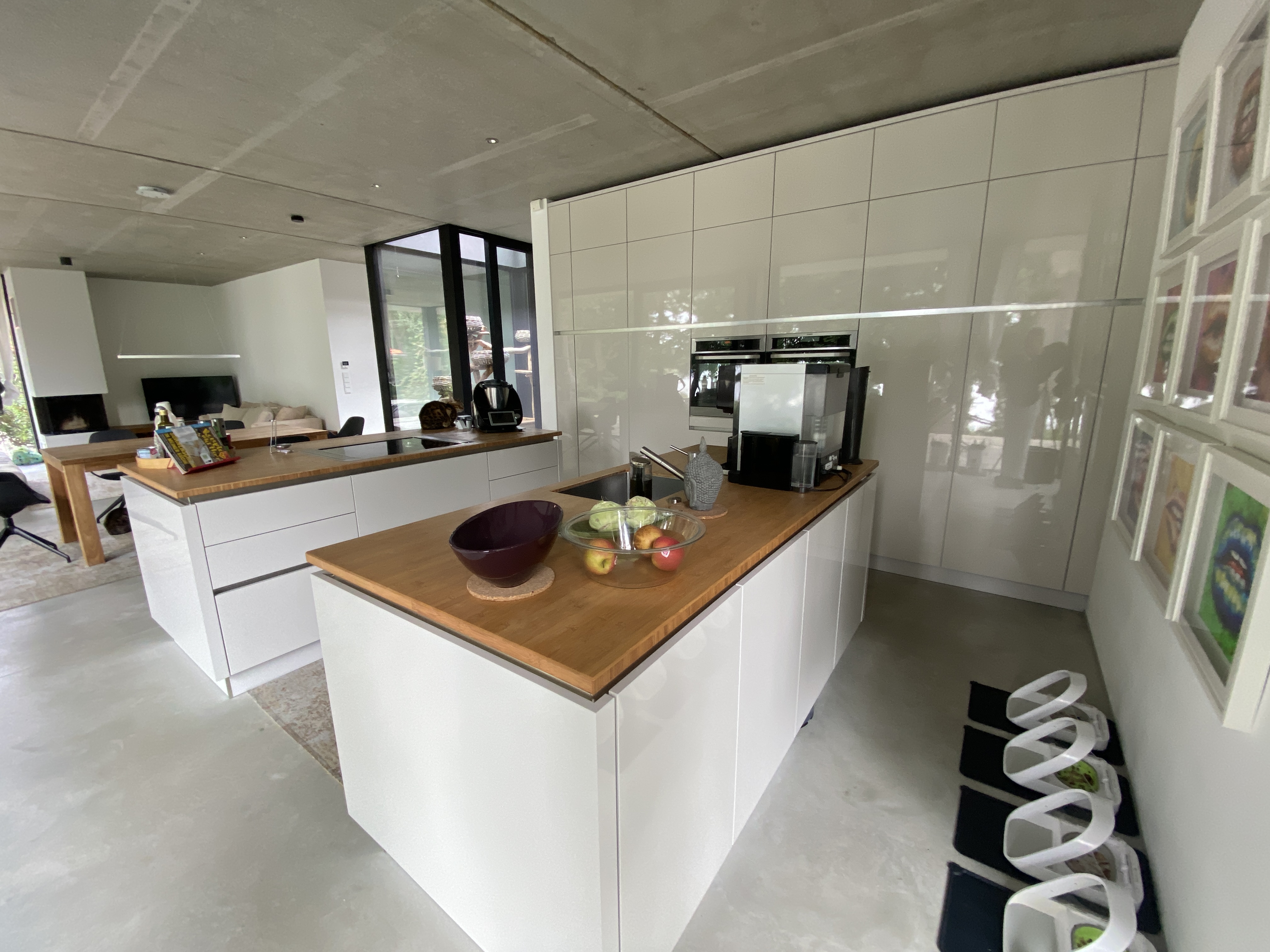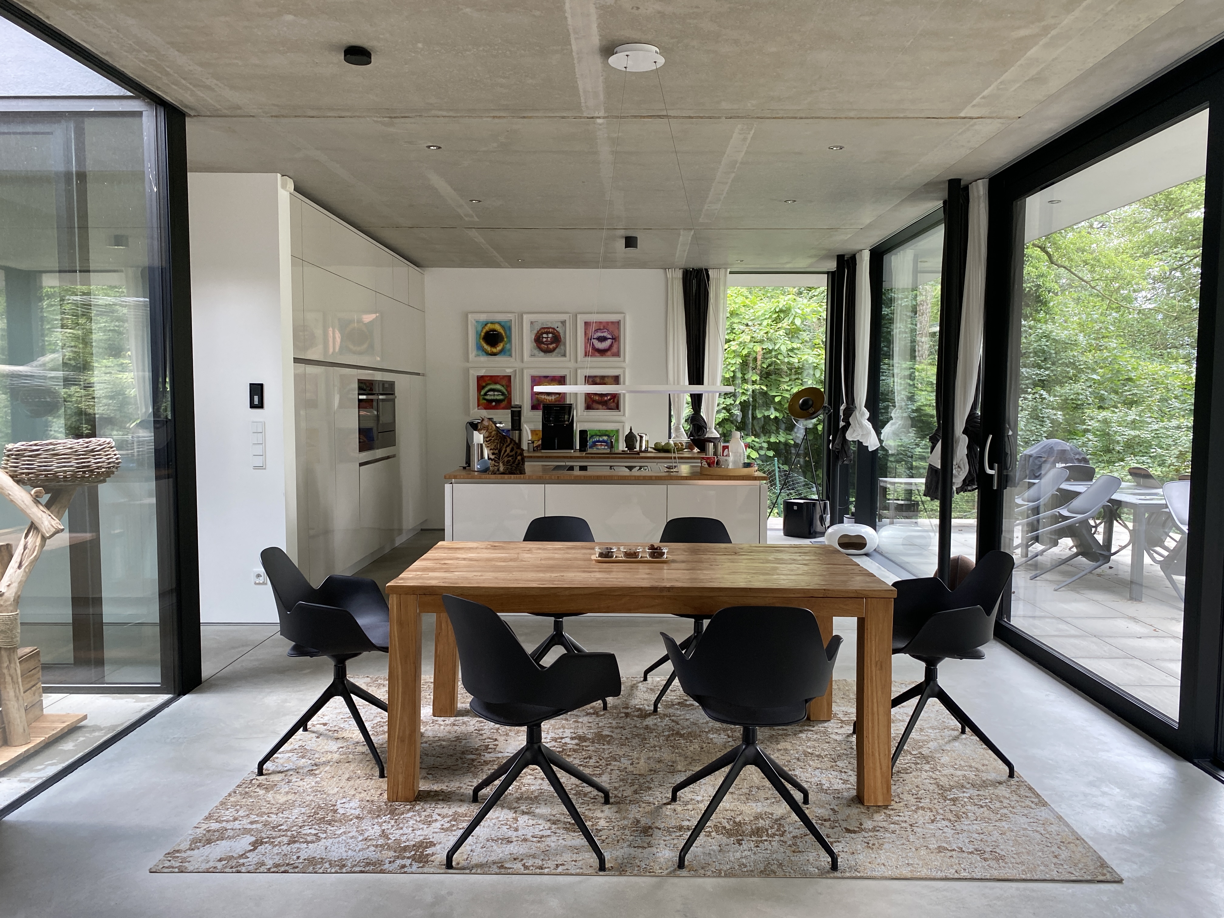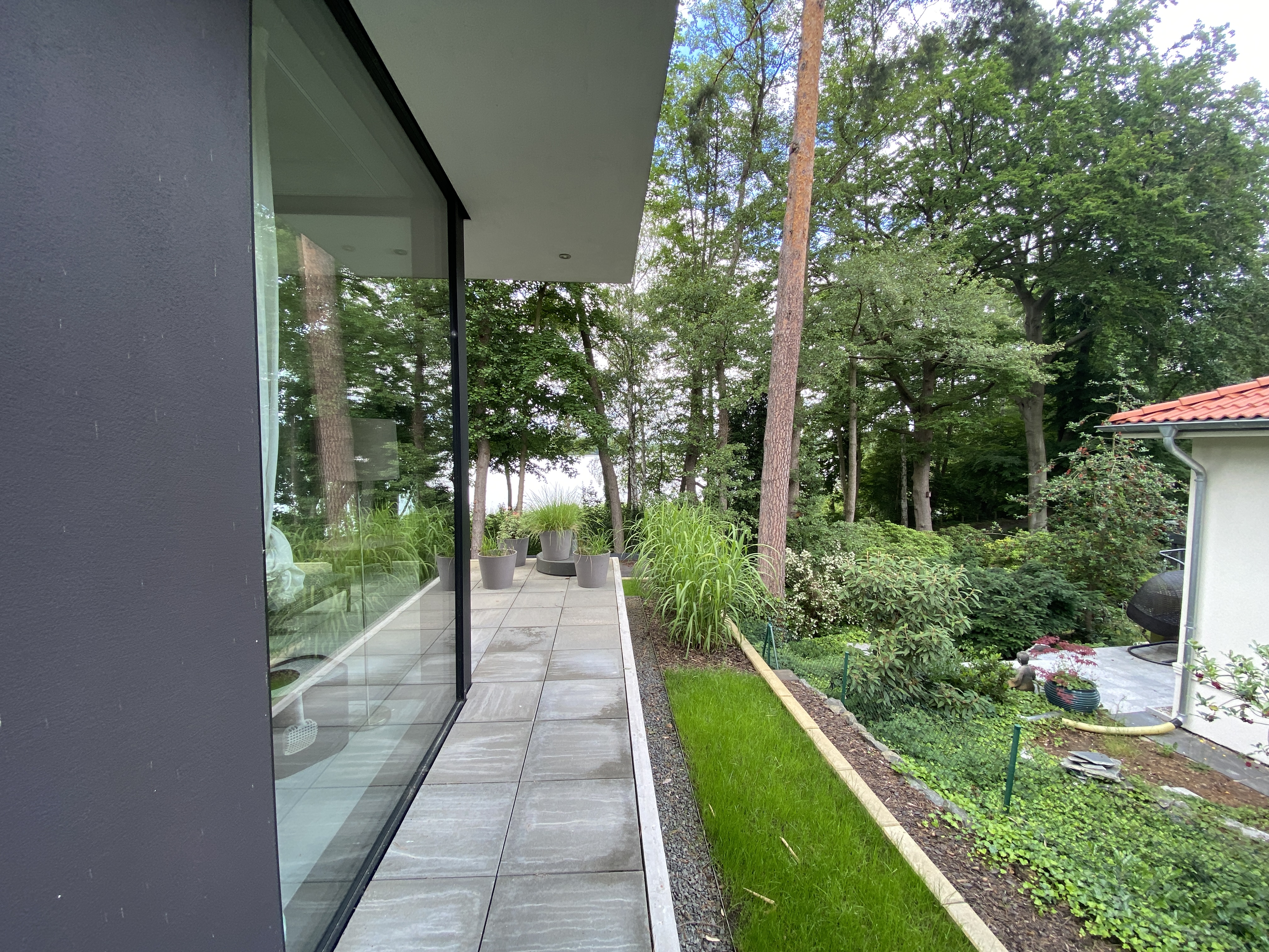 Nestled in a serene forest and bordered by a tranquil lake, this stunning modern home offers a perfect blend of natural beauty and architectural elegance. The house features expansive glass walls that provide unobstructed views of the lush greenery and silhouetted sunset over the lake, creating an environment of peace and calm. This home is designed with a modern minimalistic approach, integrating high-end finishes like polished wood, sleek kitchen appliances, and large, airy spaces that blend seamlessly with the outdoor surroundings.