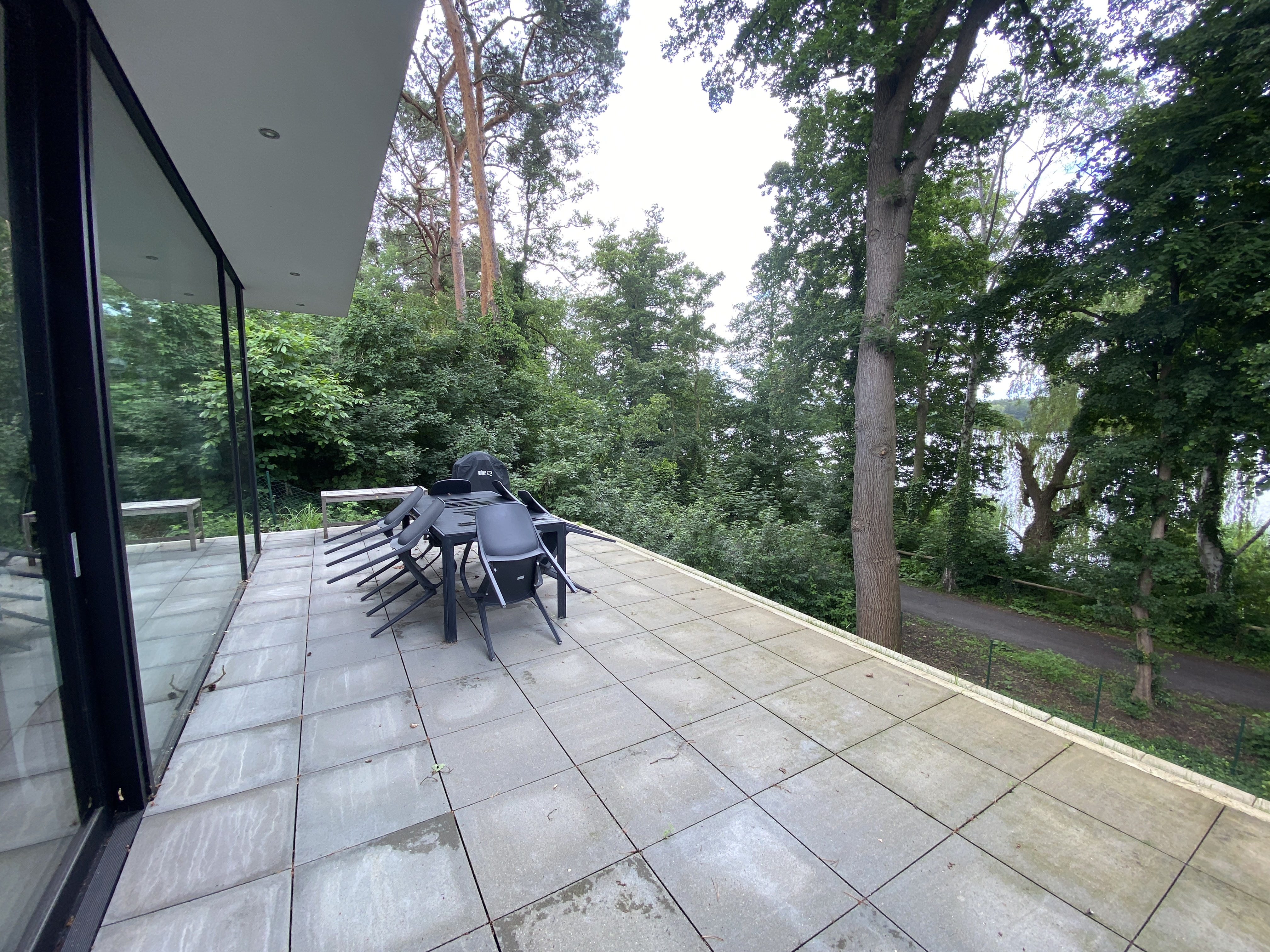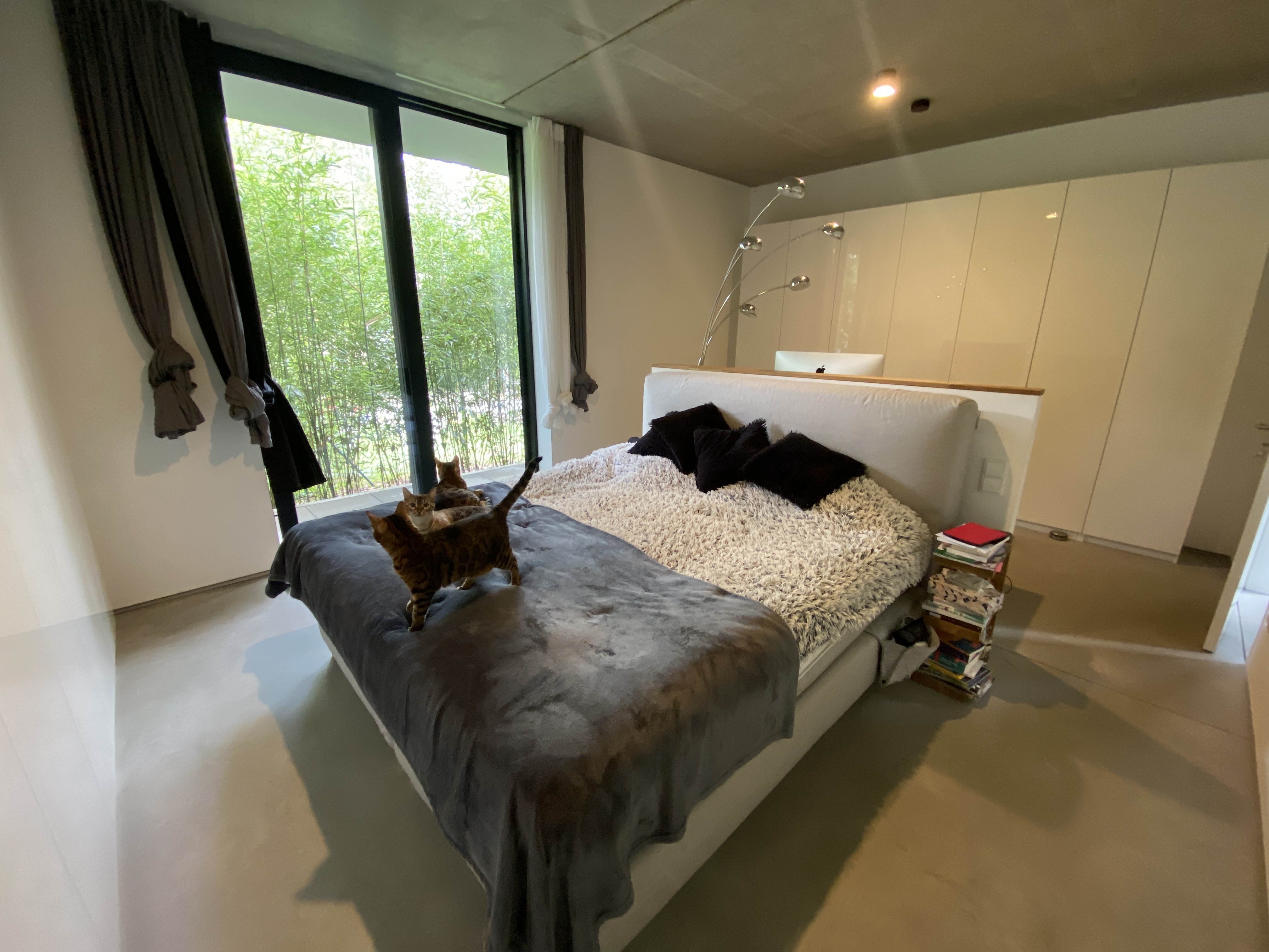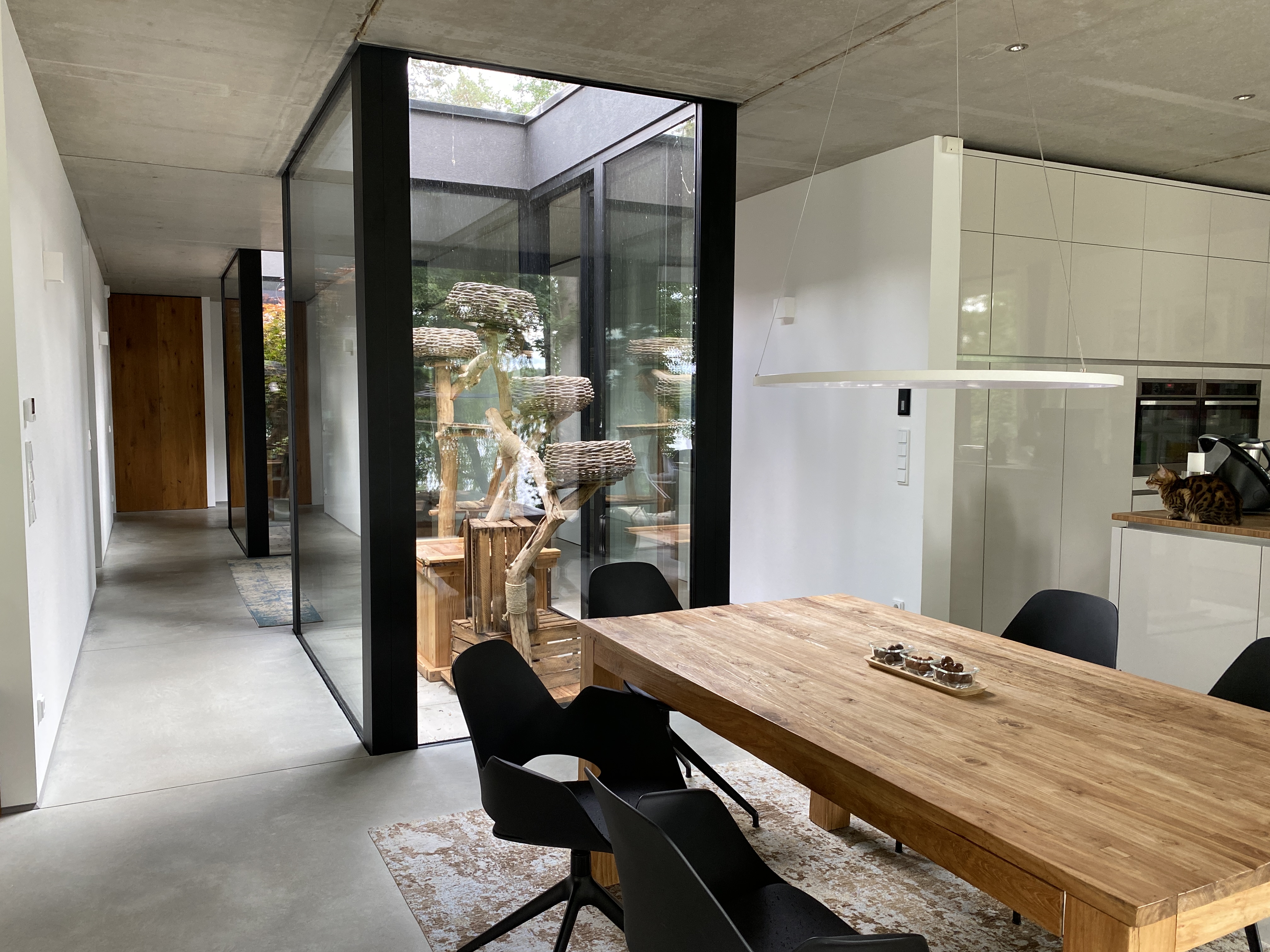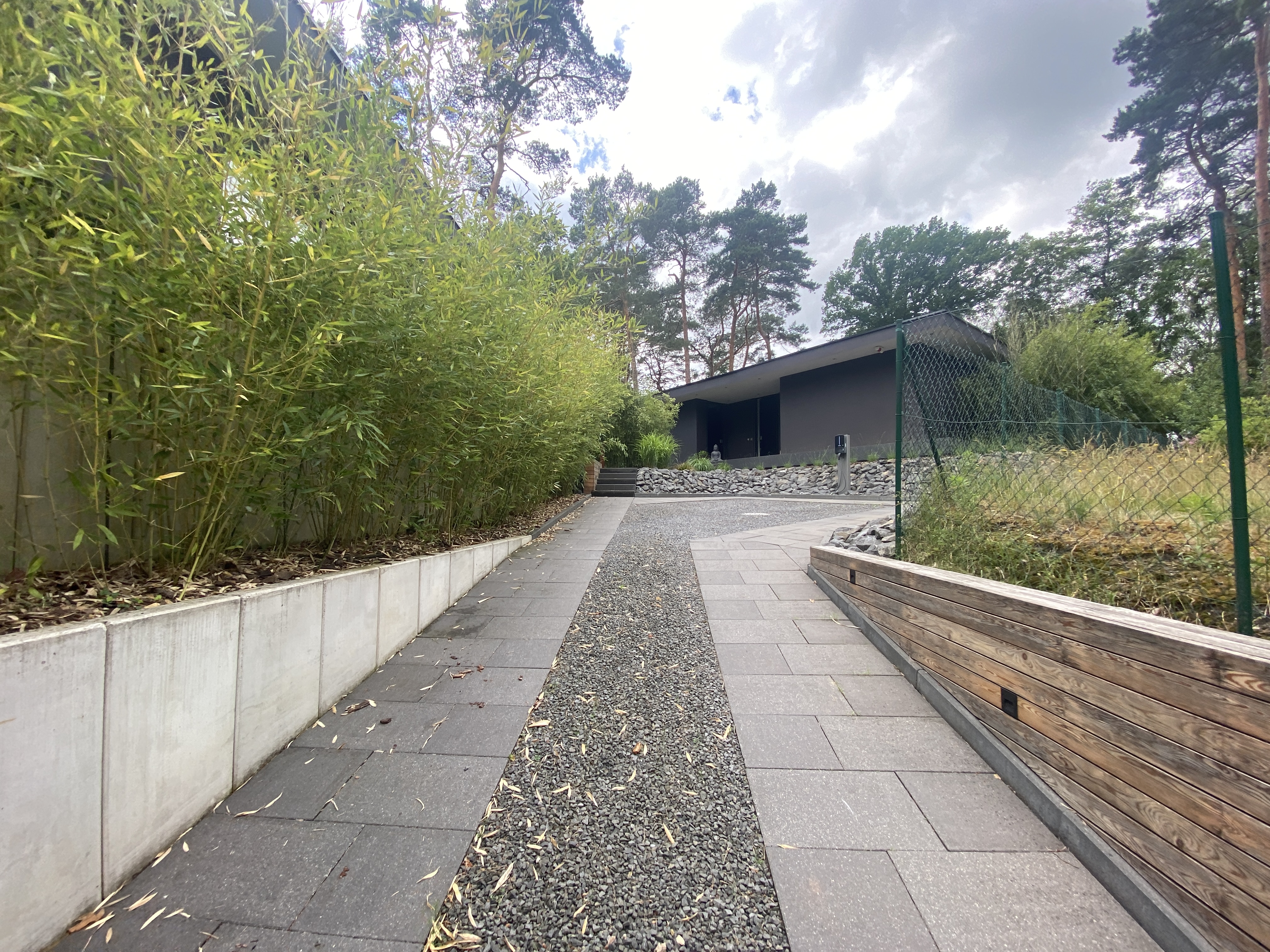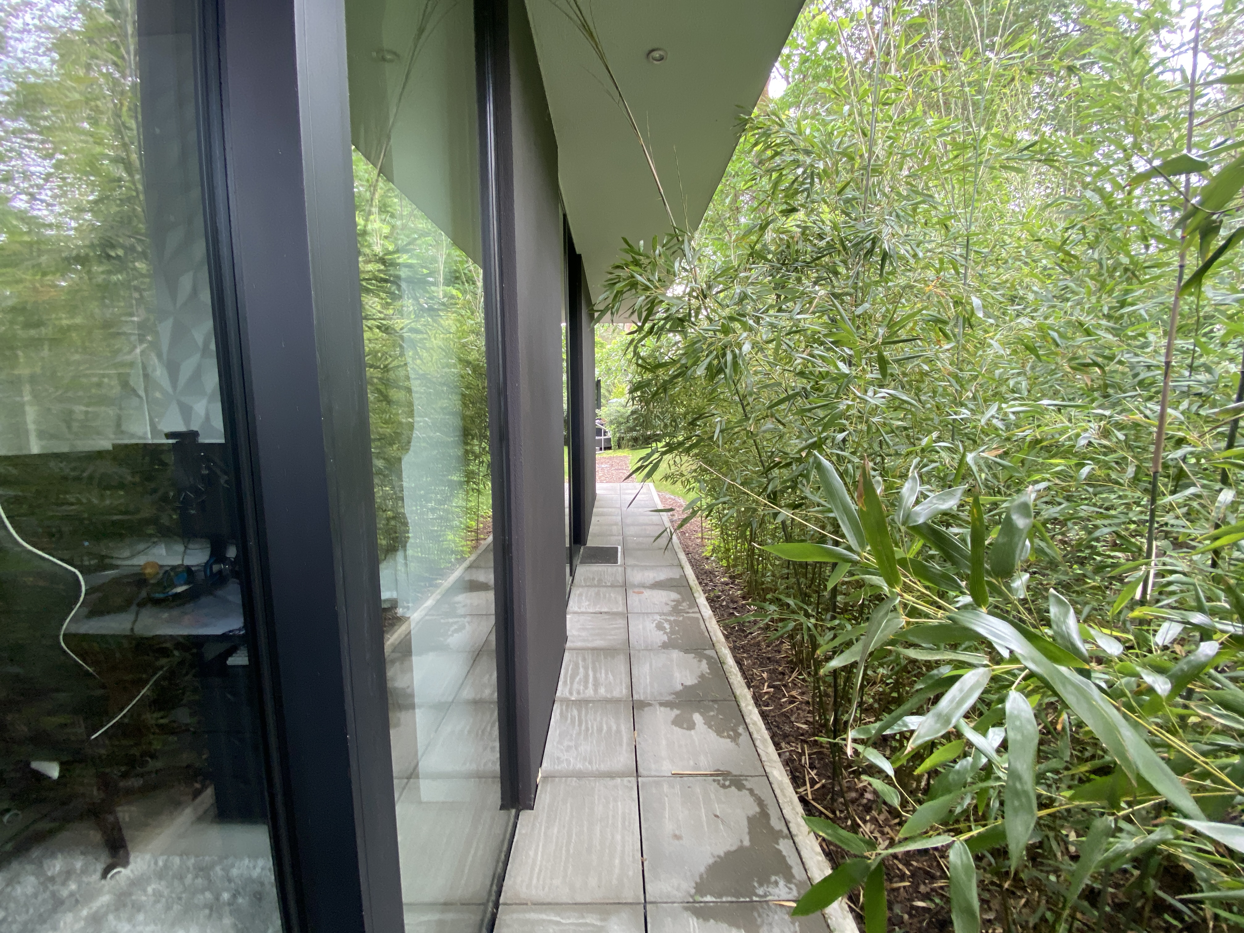 Nestled in a serene forest and bordered by a tranquil lake, this stunning modern home offers a perfect blend of natural beauty and architectural elegance. The house features expansive glass walls that provide unobstructed views of the lush greenery and silhouetted sunset over the lake, creating an environment of peace and calm. This home is designed with a modern minimalistic approach, integrating high-end finishes like polished wood, sleek kitchen appliances, and large, airy spaces that blend seamlessly with the outdoor surroundings.