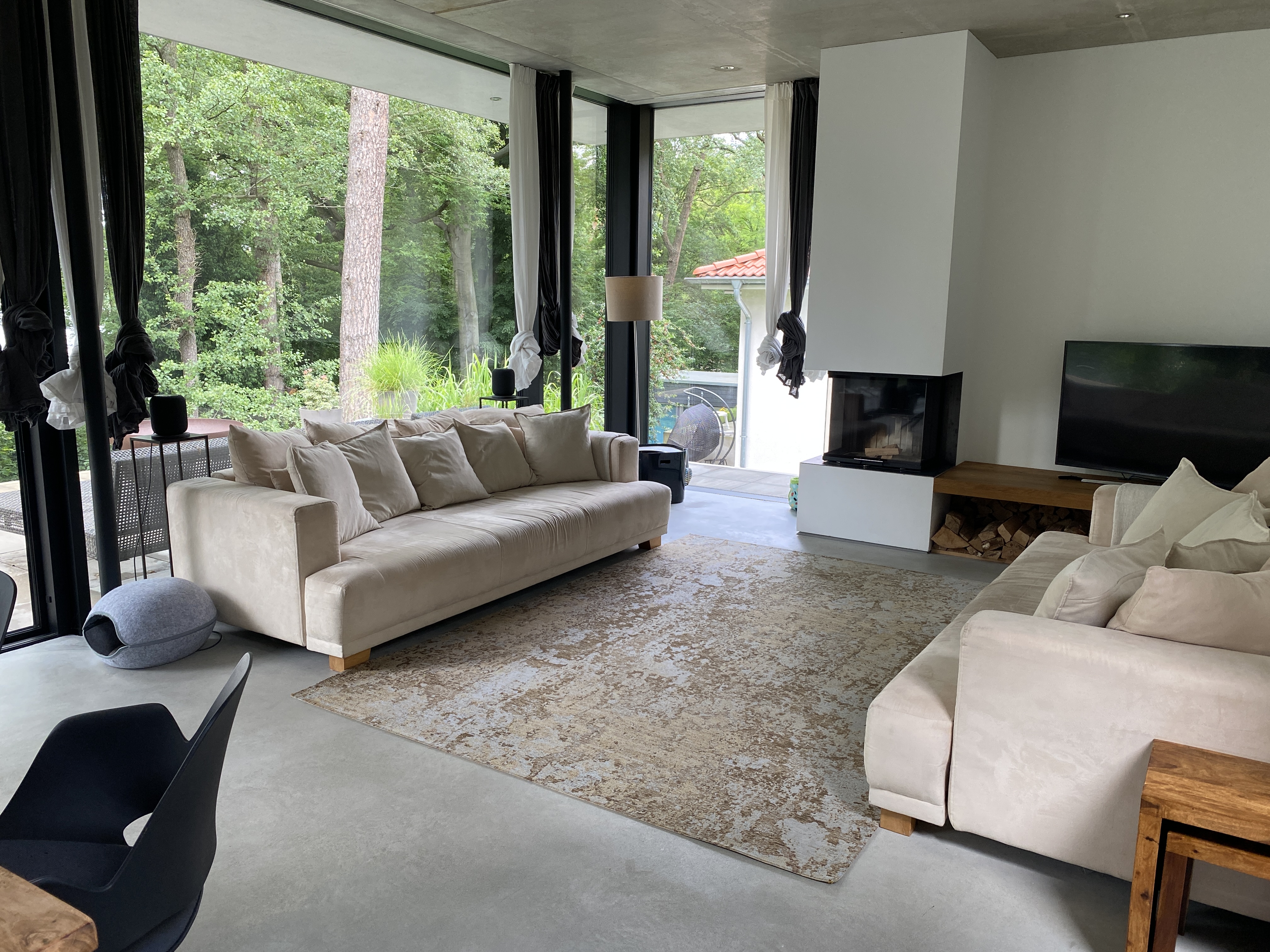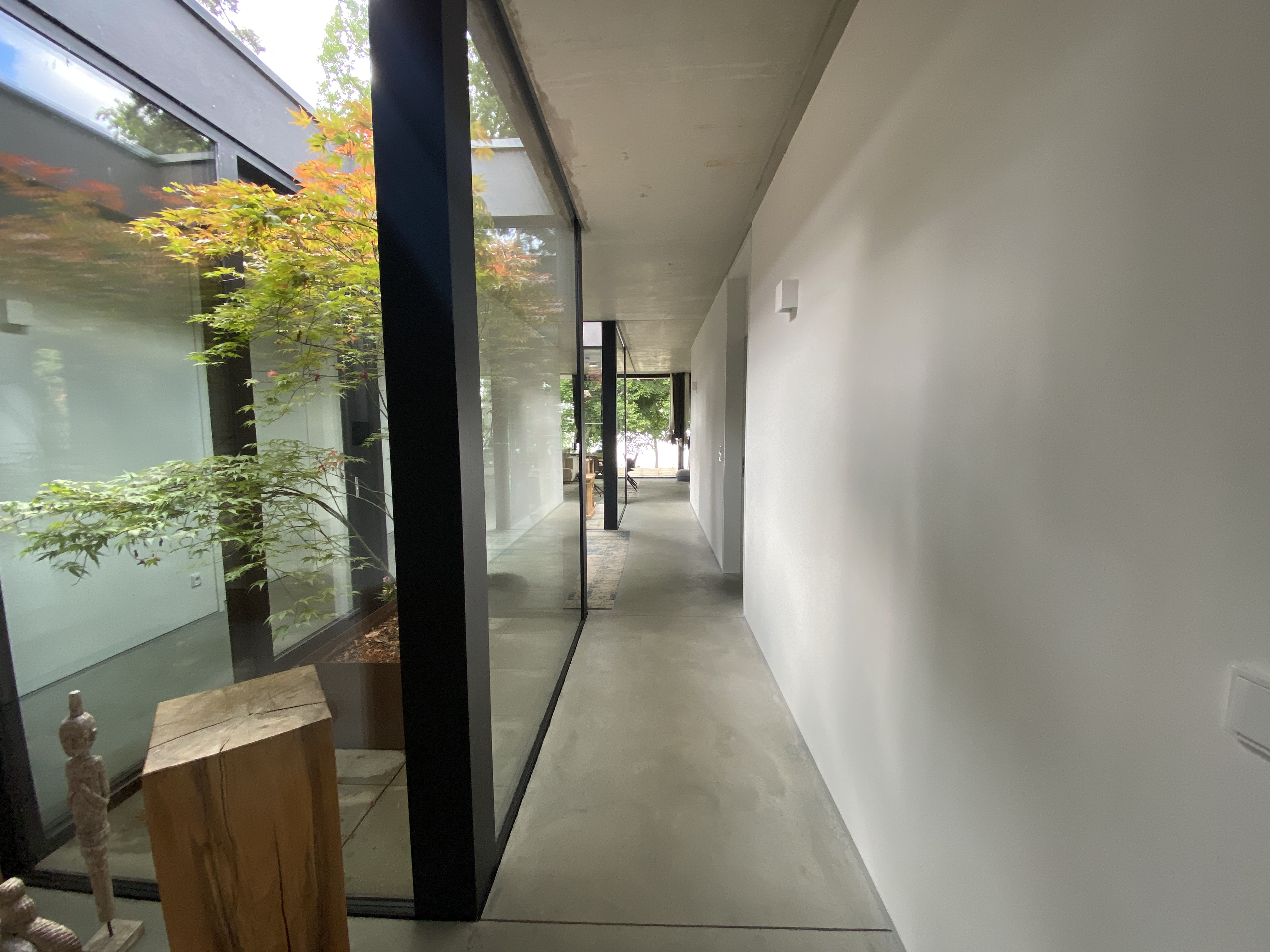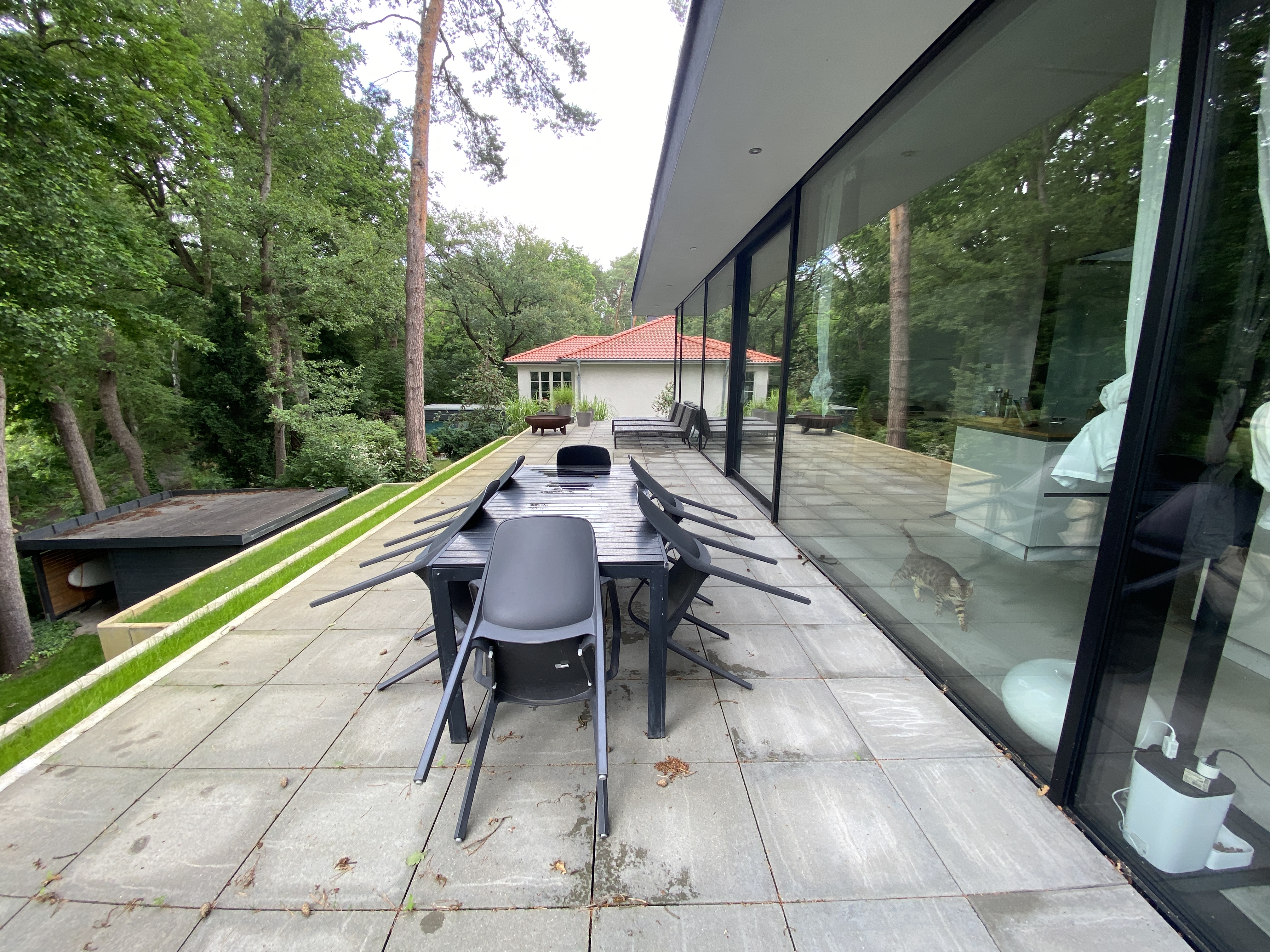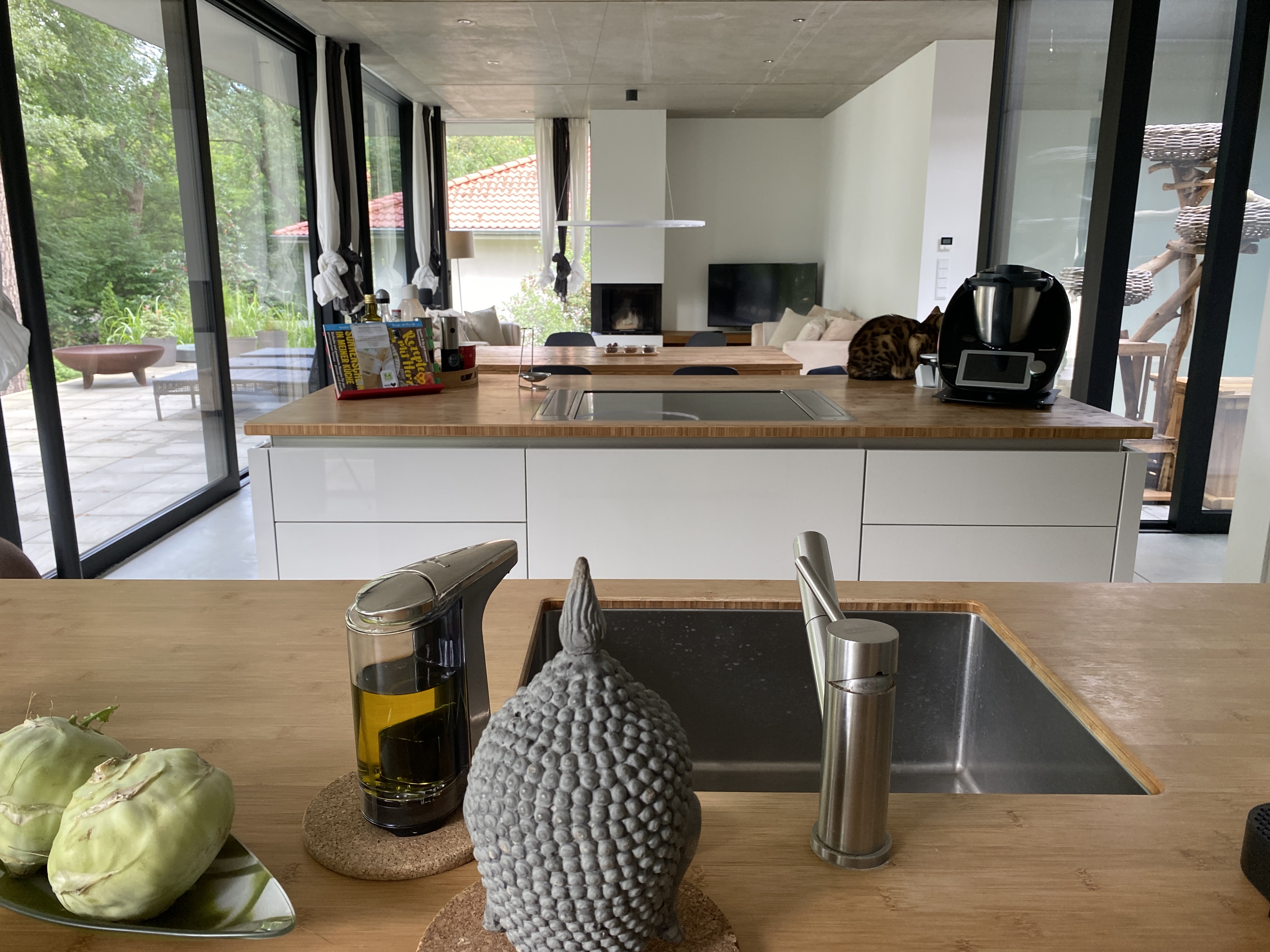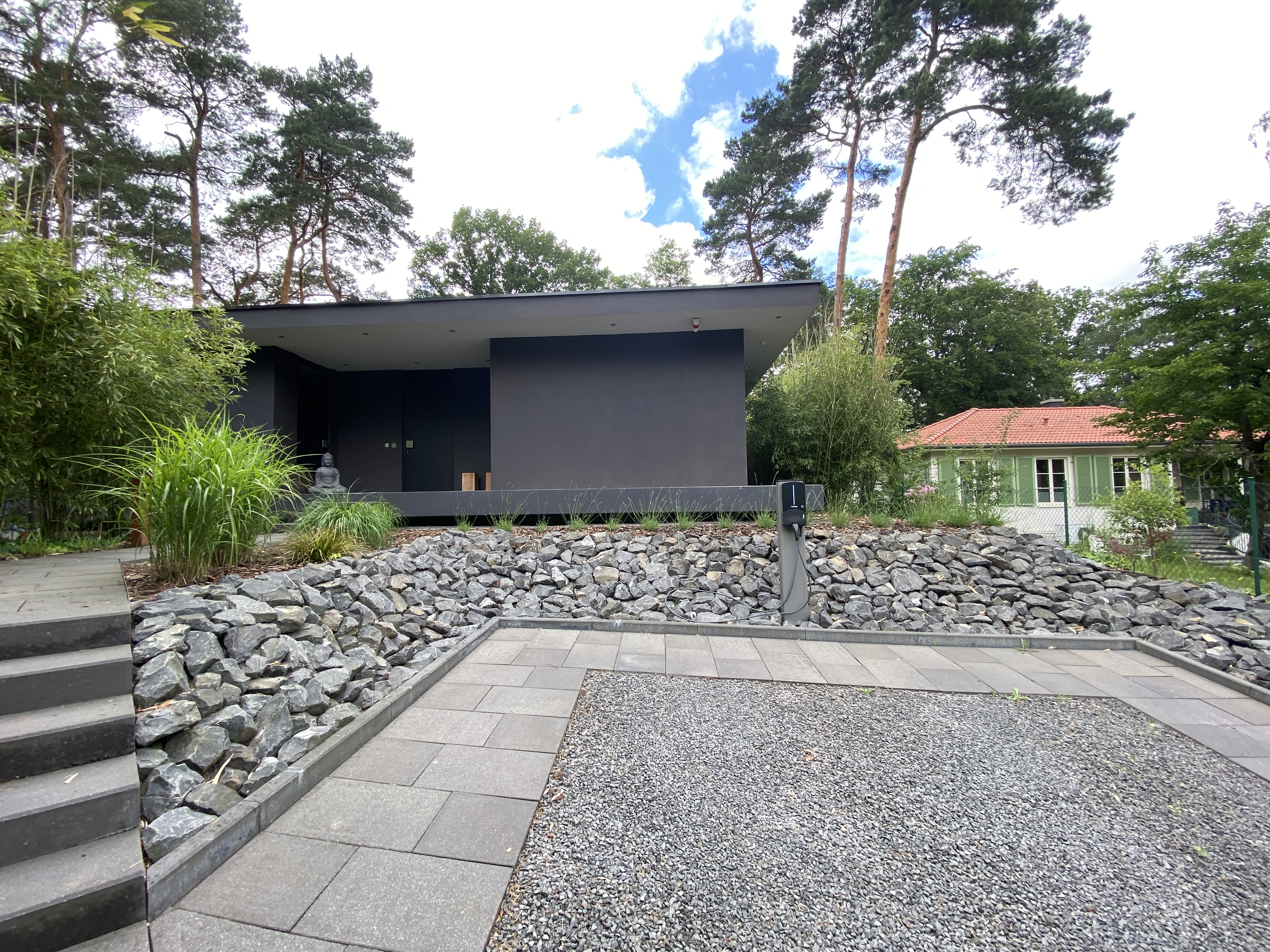 Nestled in a serene forest and bordered by a tranquil lake, this stunning modern home offers a perfect blend of natural beauty and architectural elegance. The house features expansive glass walls that provide unobstructed views of the lush greenery and silhouetted sunset over the lake, creating an environment of peace and calm. This home is designed with a modern minimalistic approach, integrating high-end finishes like polished wood, sleek kitchen appliances, and large, airy spaces that blend seamlessly with the outdoor surroundings.
