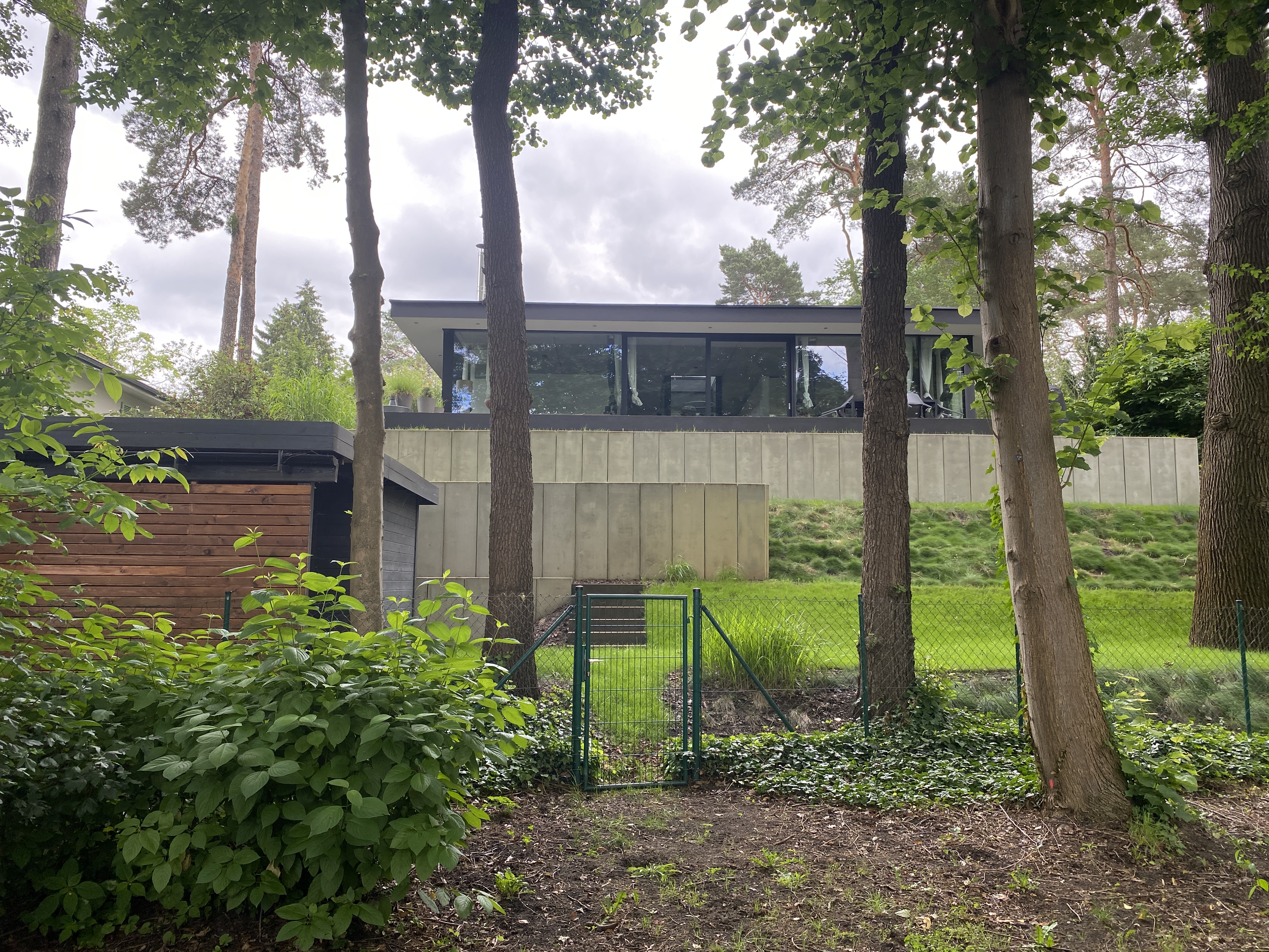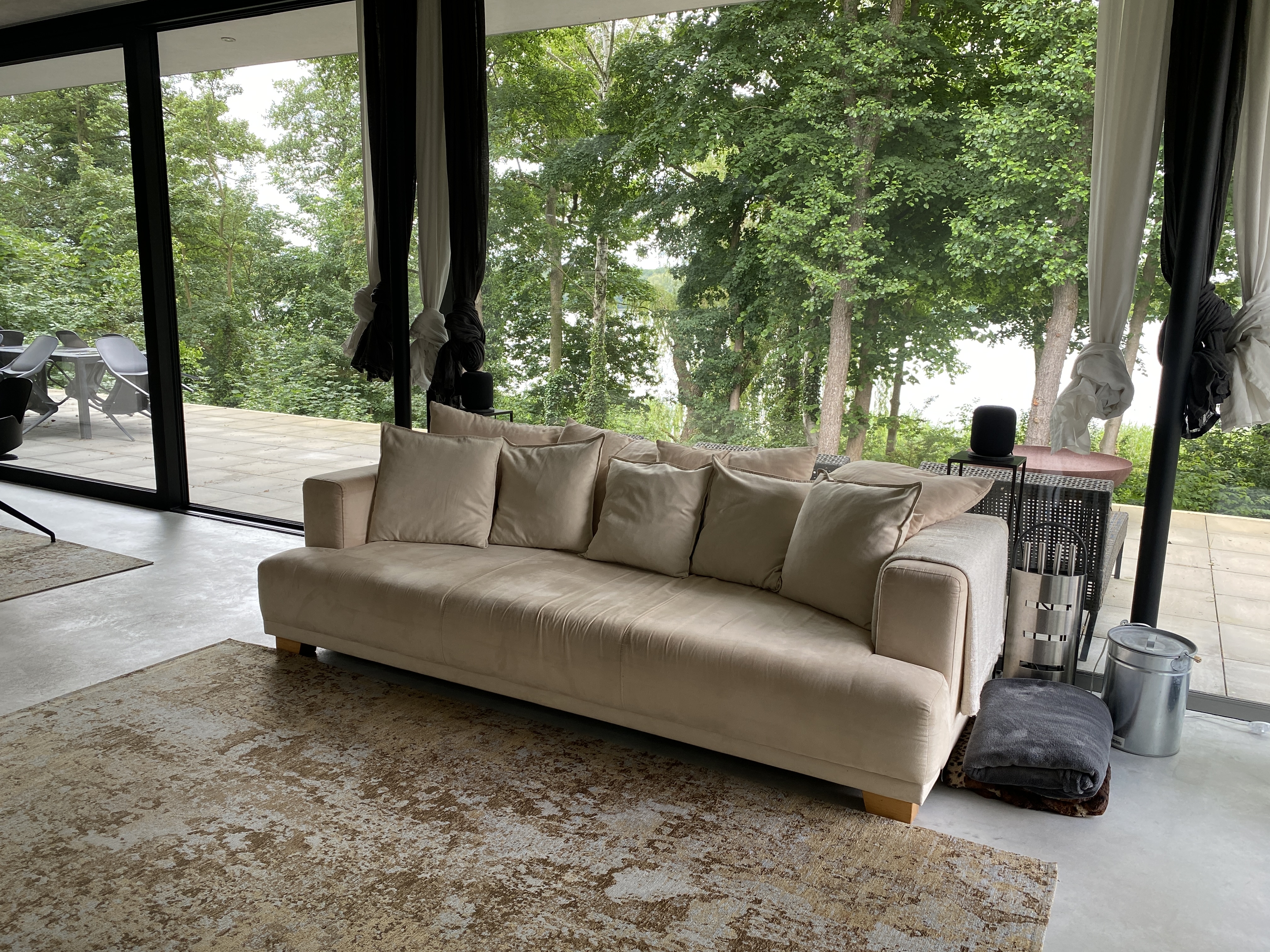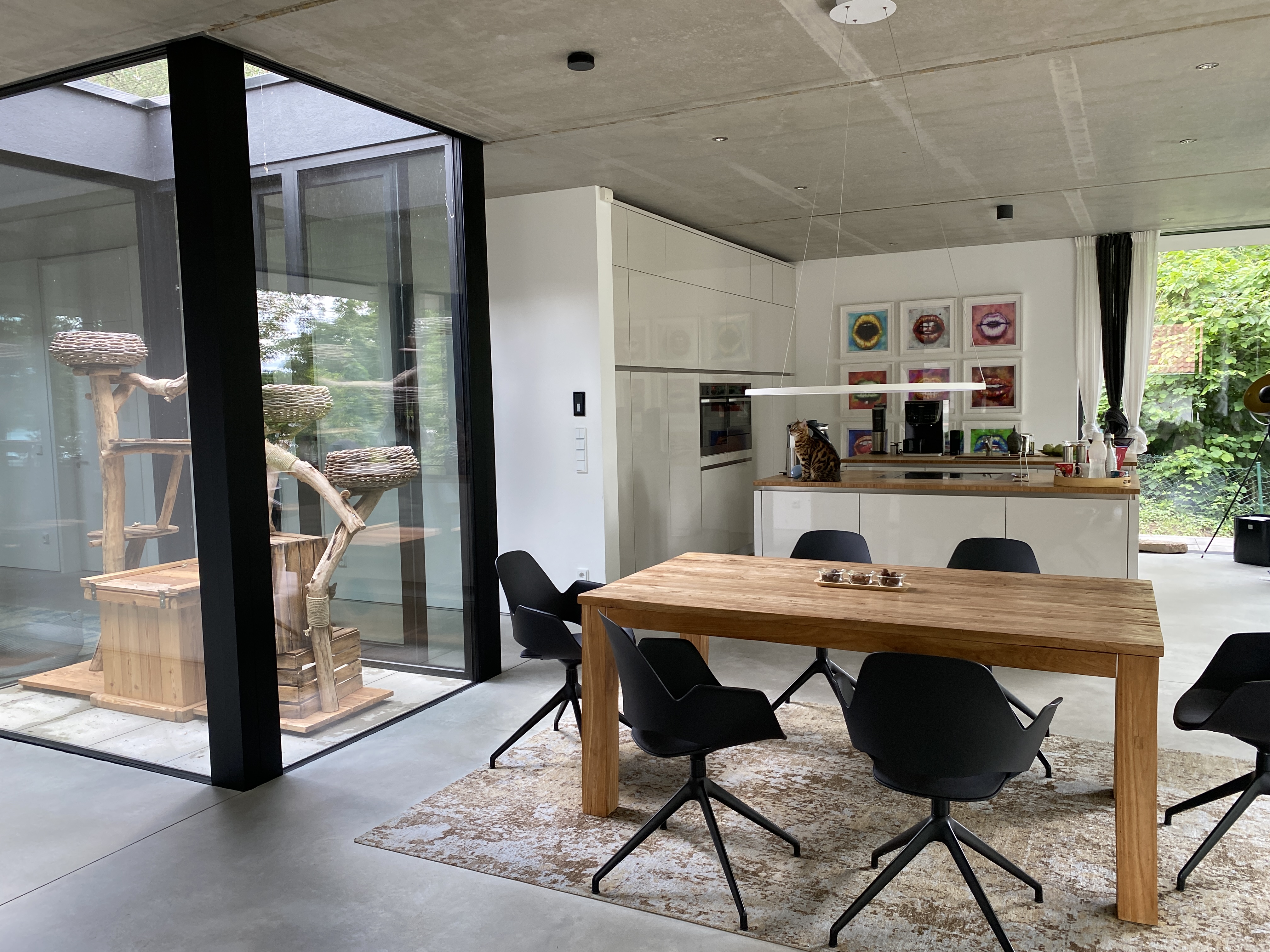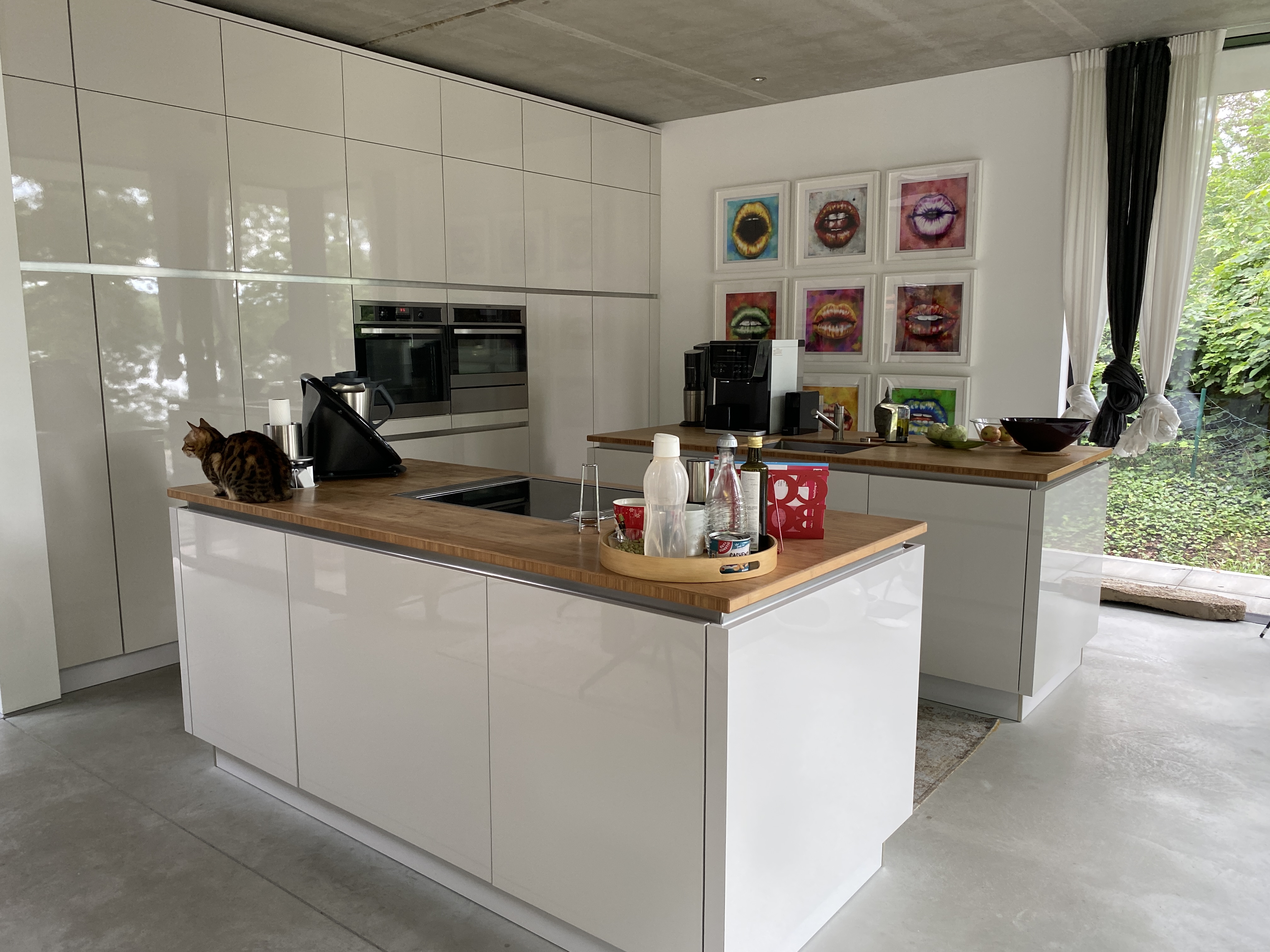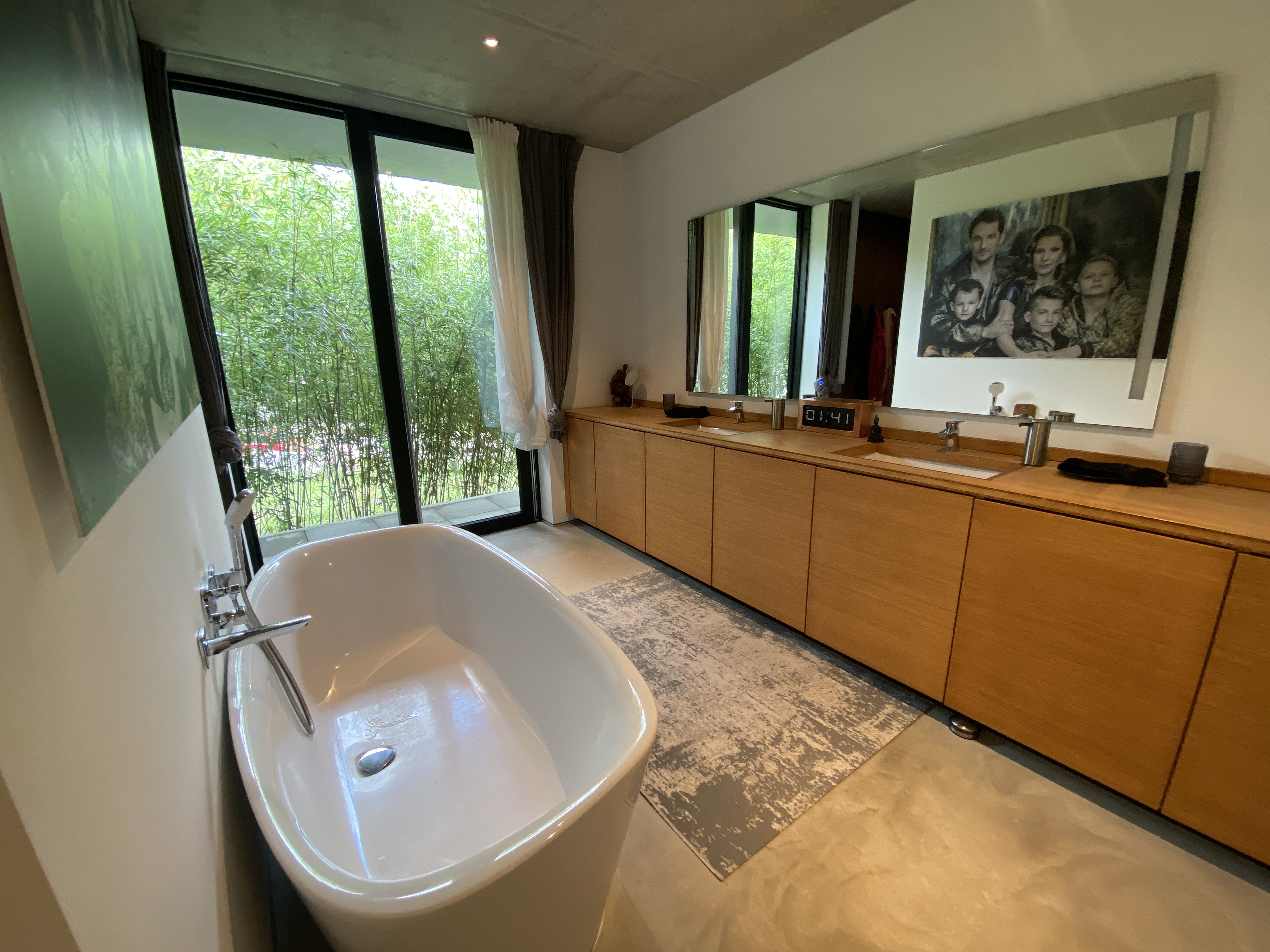 Nestled in a serene forest and bordered by a tranquil lake, this stunning modern home offers a perfect blend of natural beauty and architectural elegance. The house features expansive glass walls that provide unobstructed views of the lush greenery and silhouetted sunset over the lake, creating an environment of peace and calm. This home is designed with a modern minimalistic approach, integrating high-end finishes like polished wood, sleek kitchen appliances, and large, airy spaces that blend seamlessly with the outdoor surroundings.