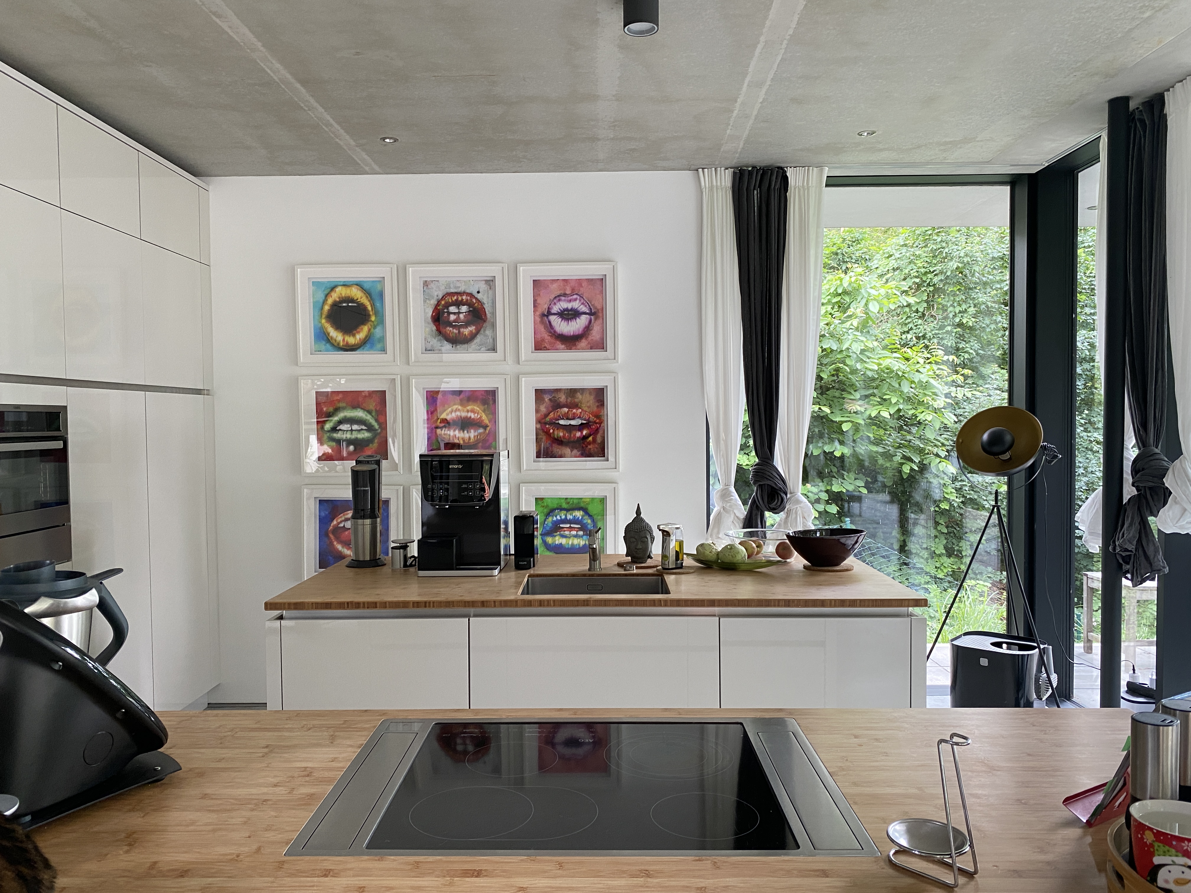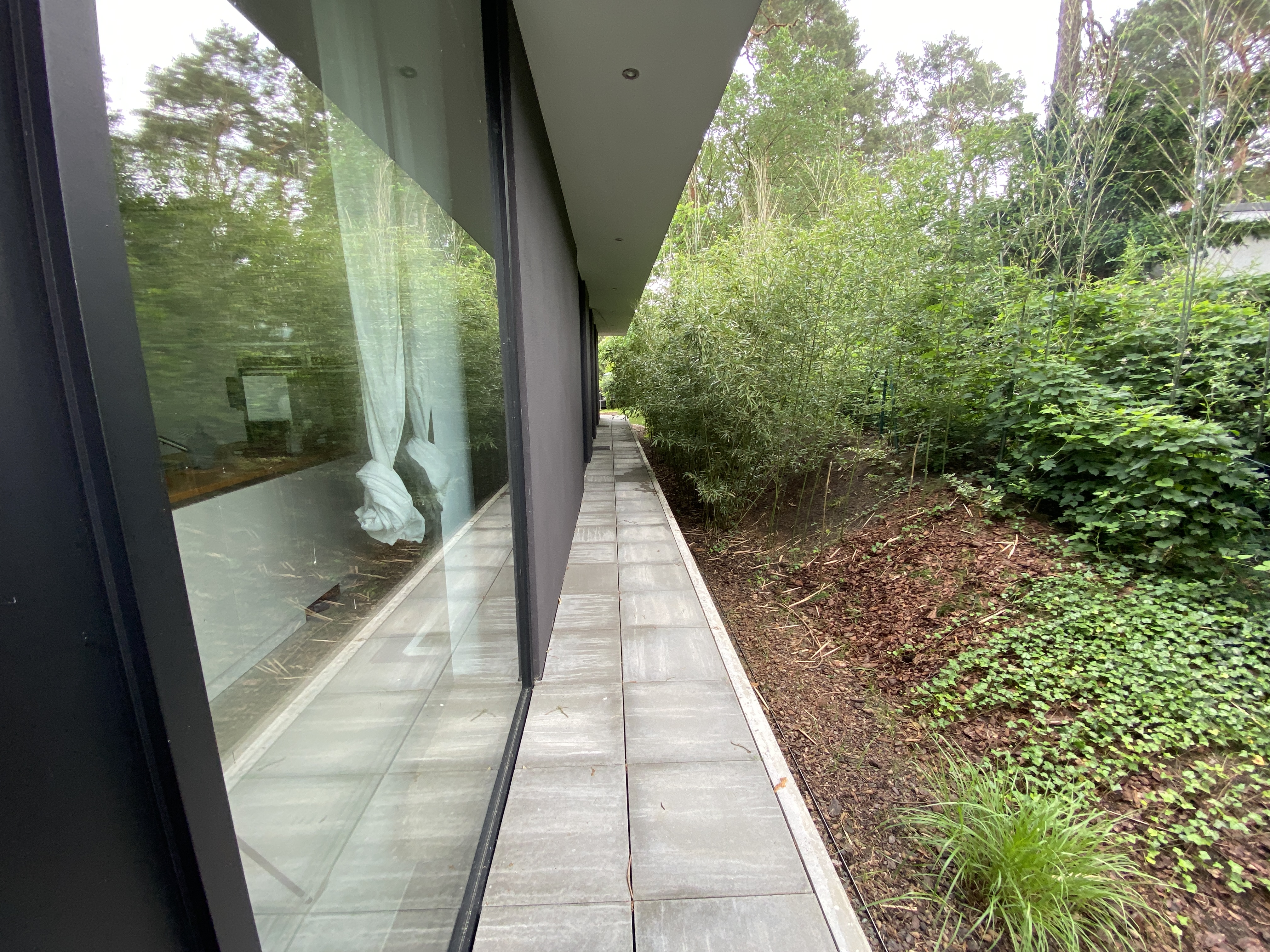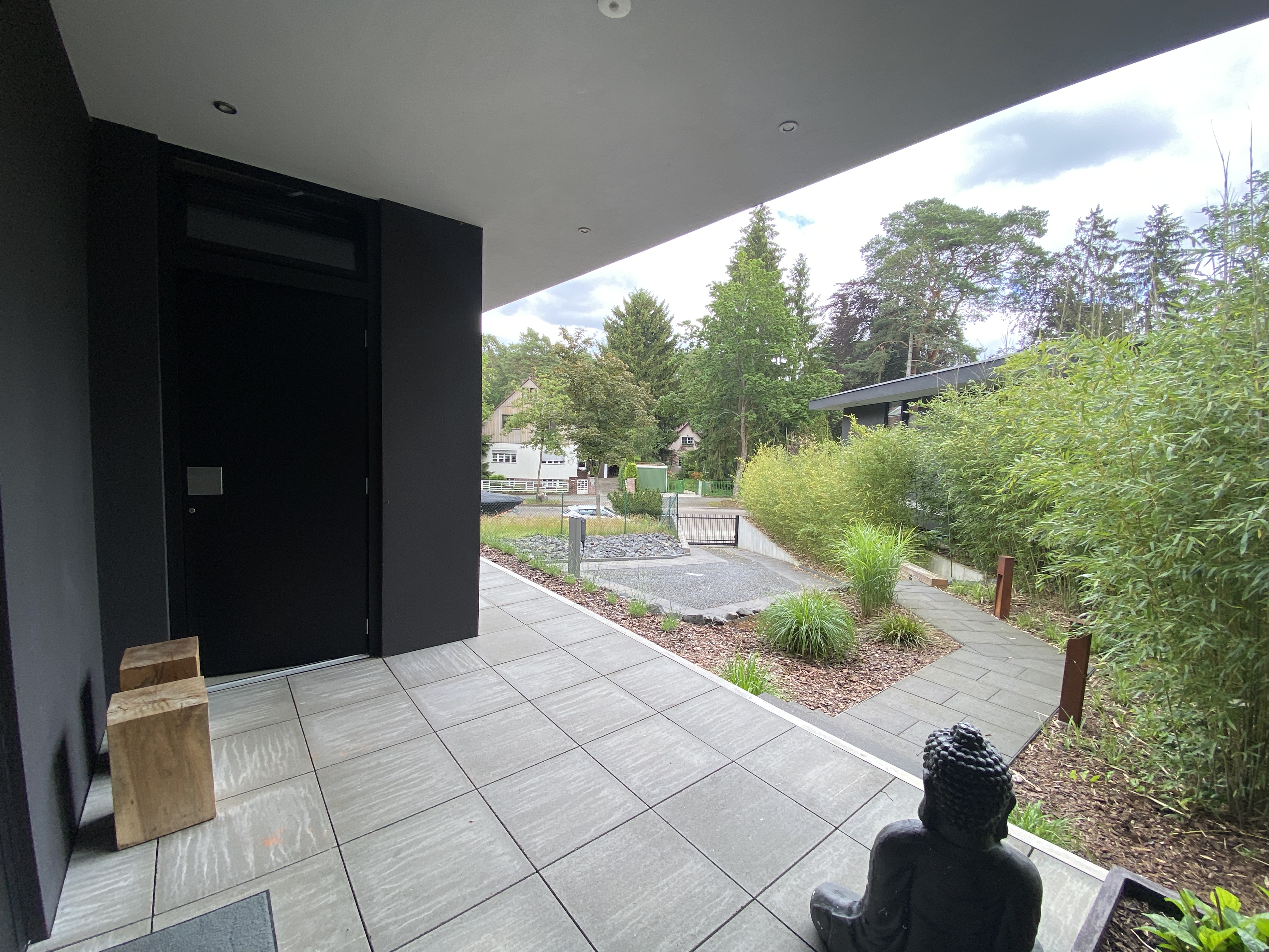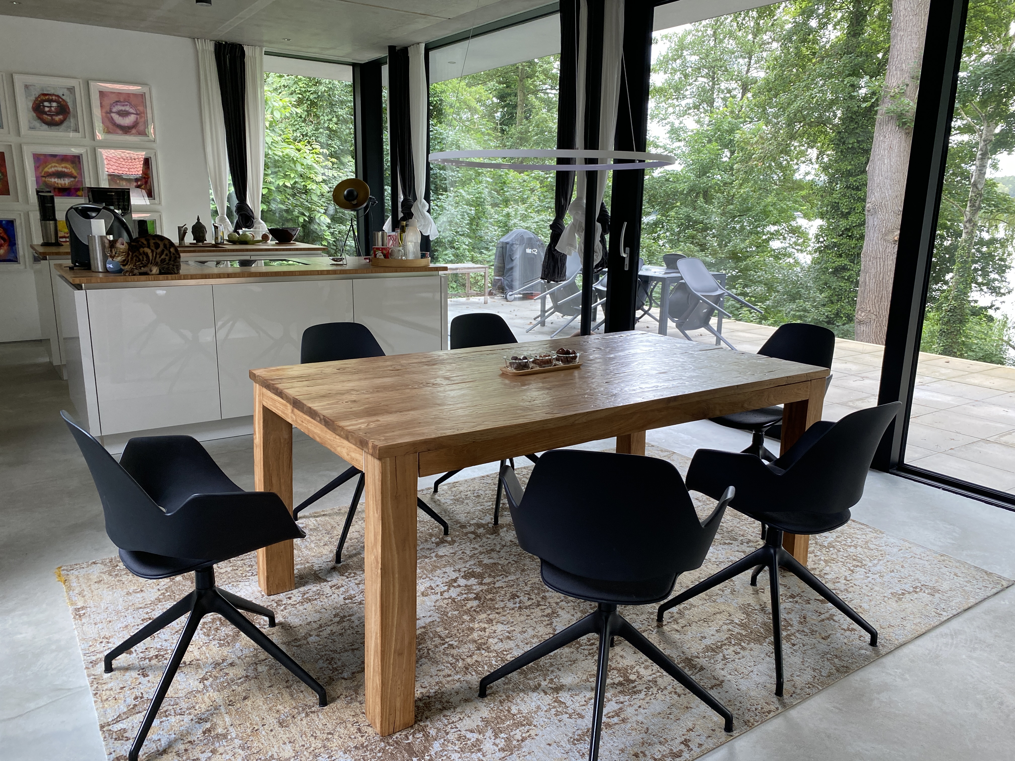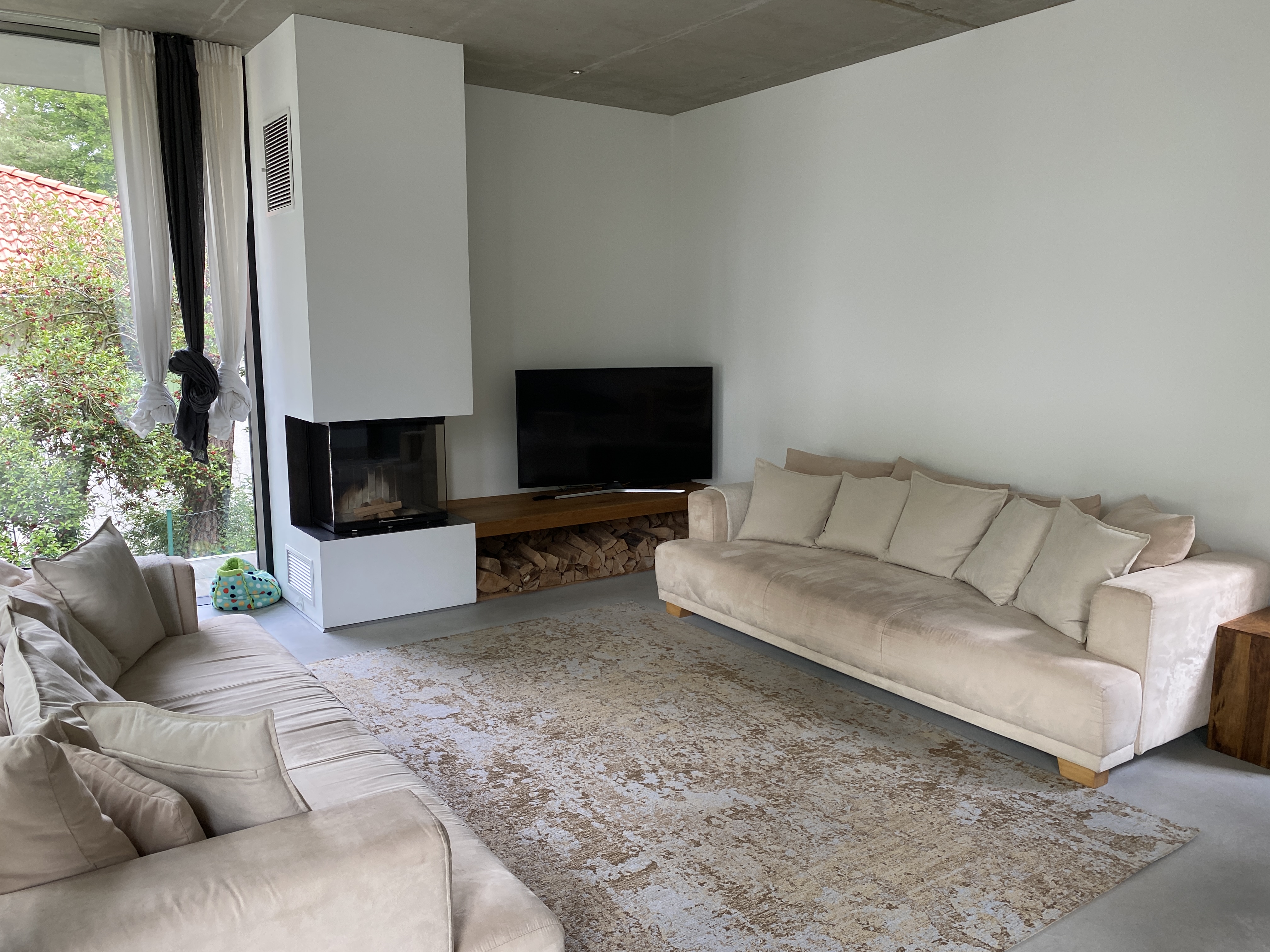 Nestled in a serene forest and bordered by a tranquil lake, this stunning modern home offers a perfect blend of natural beauty and architectural elegance. The house features expansive glass walls that provide unobstructed views of the lush greenery and silhouetted sunset over the lake, creating an environment of peace and calm. This home is designed with a modern minimalistic approach, integrating high-end finishes like polished wood, sleek kitchen appliances, and large, airy spaces that blend seamlessly with the outdoor surroundings.