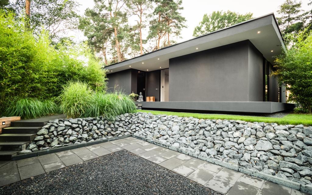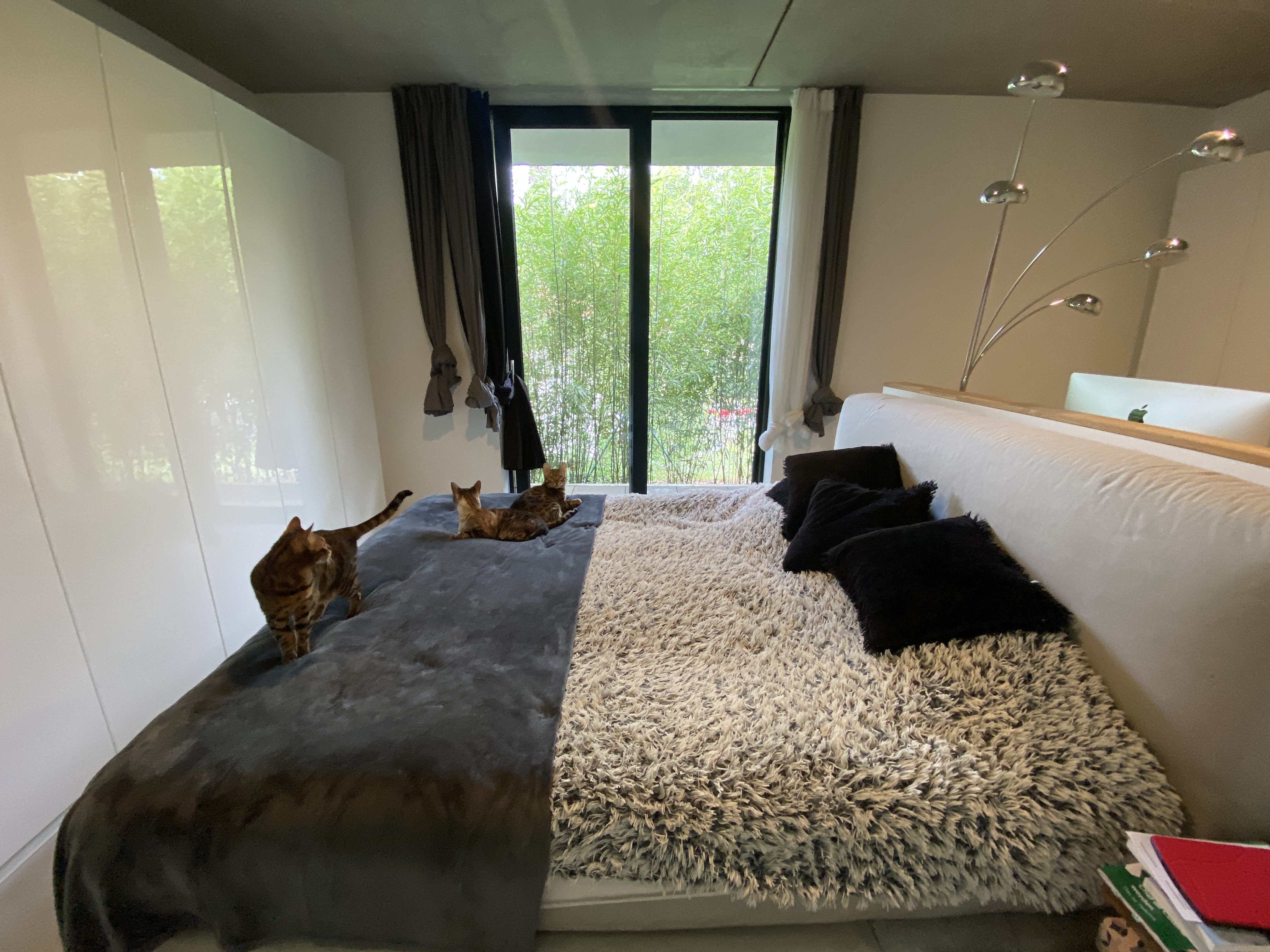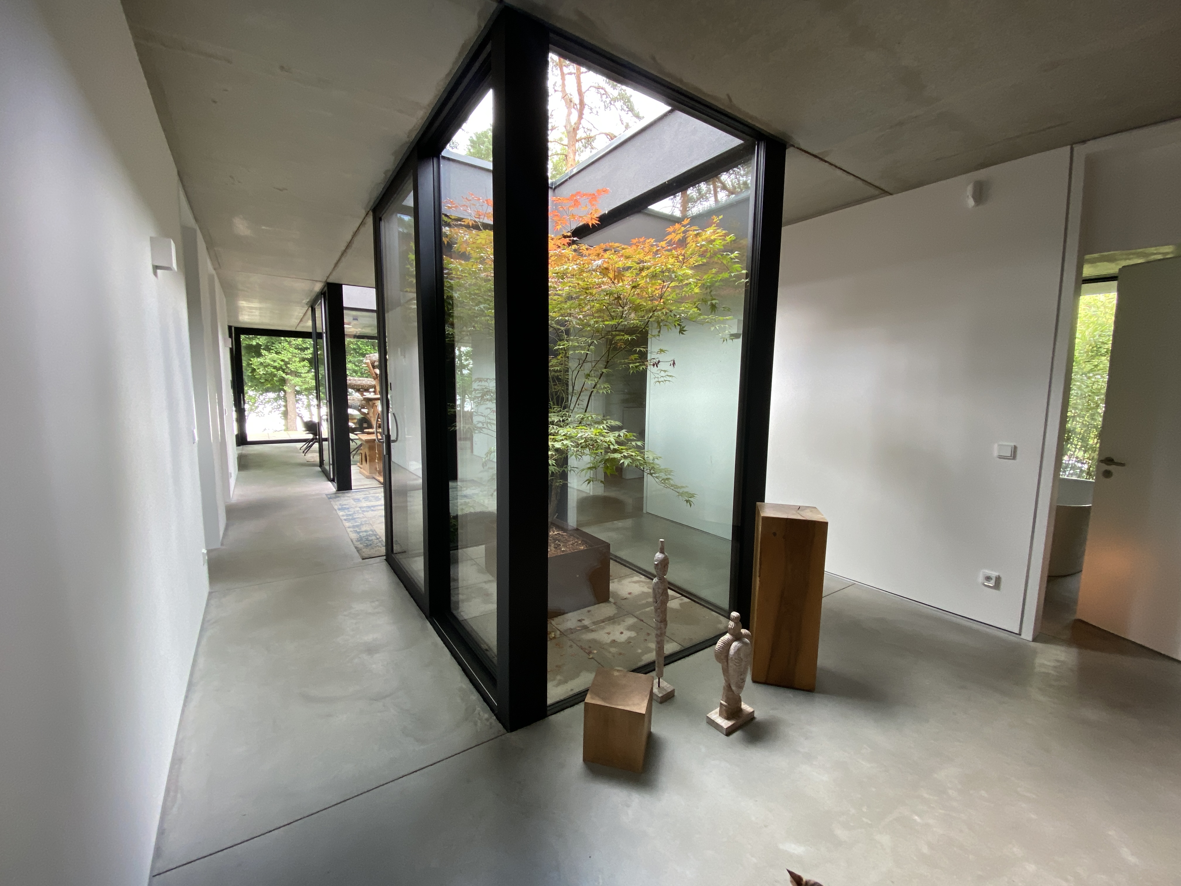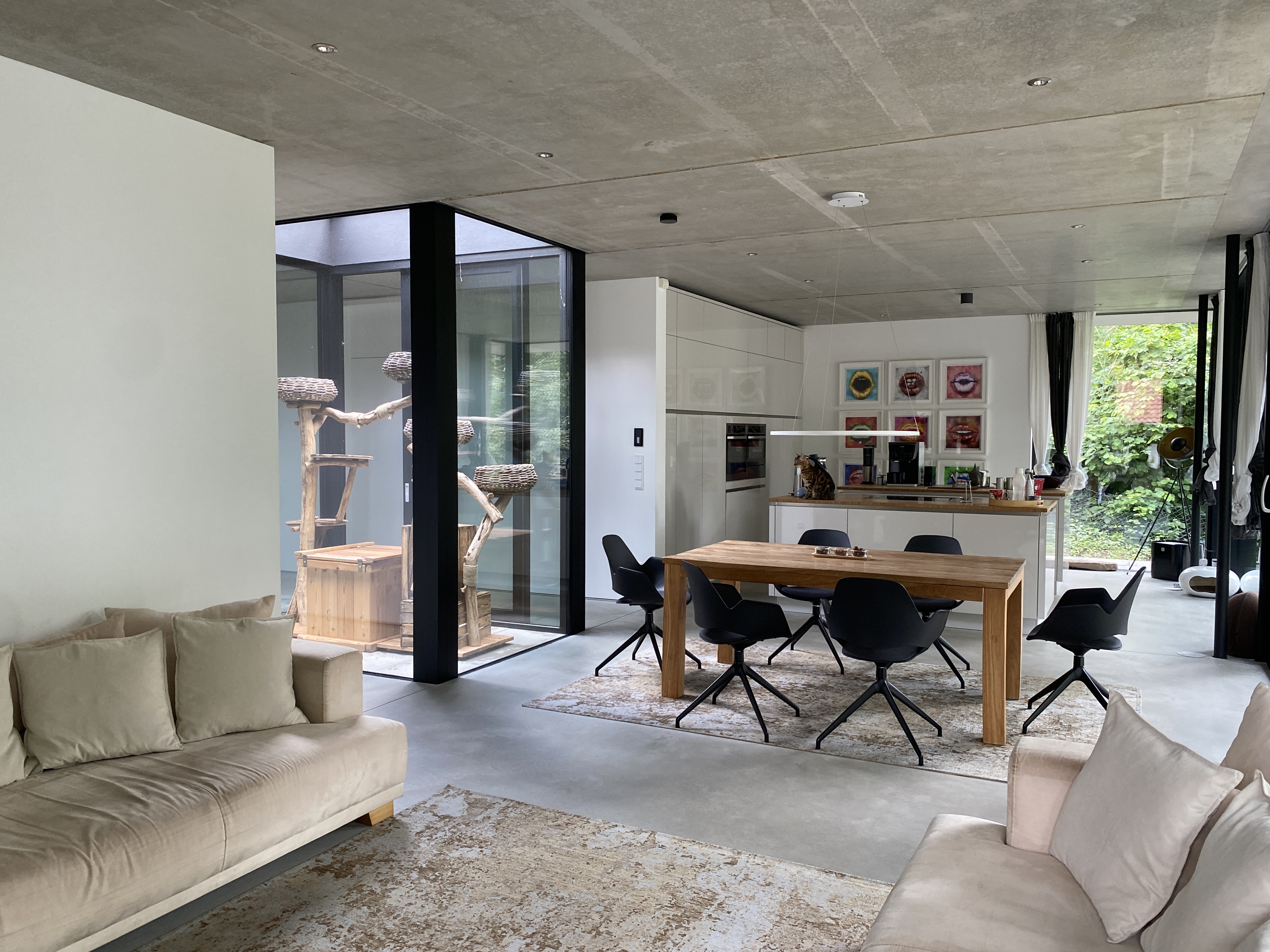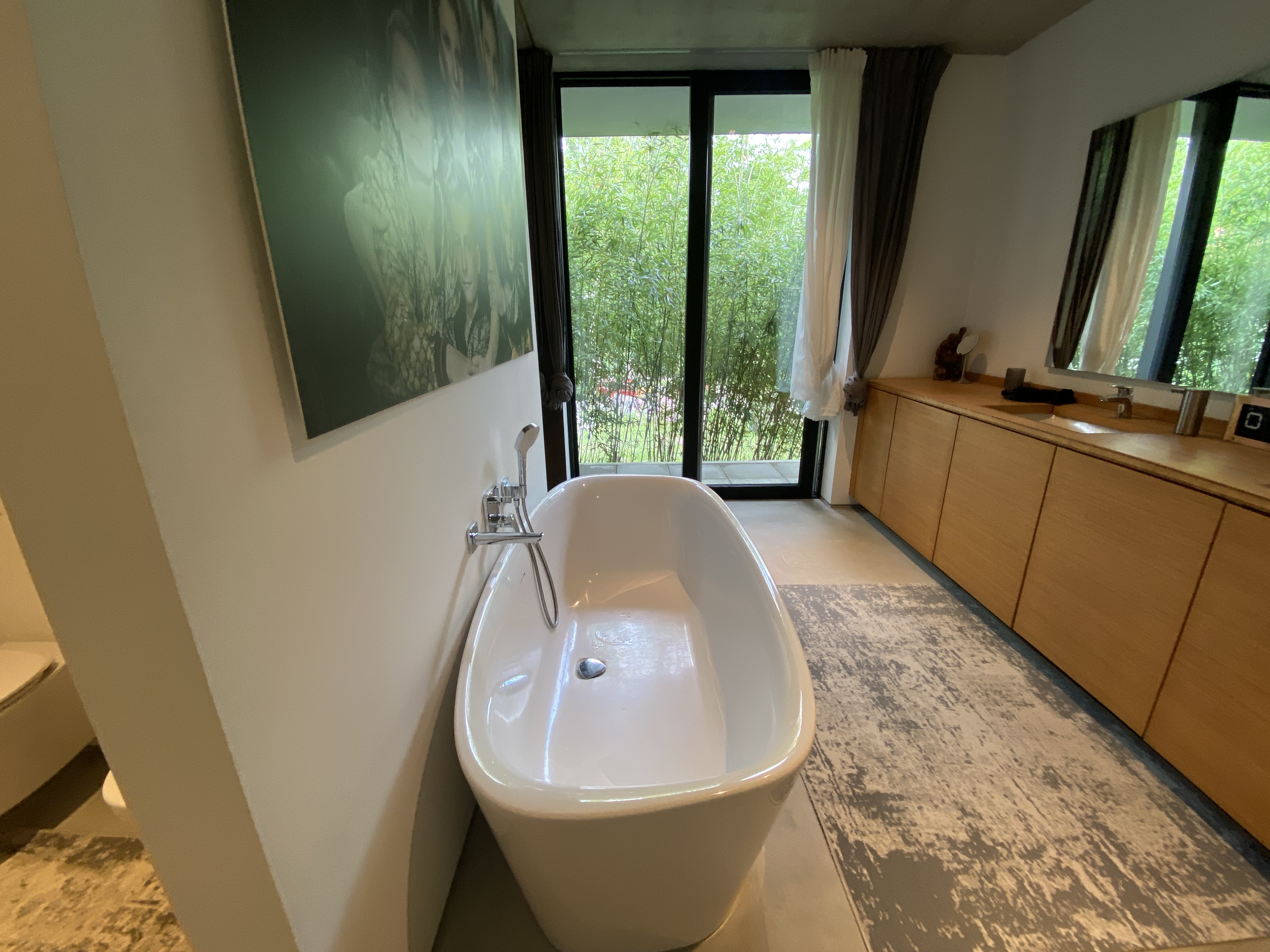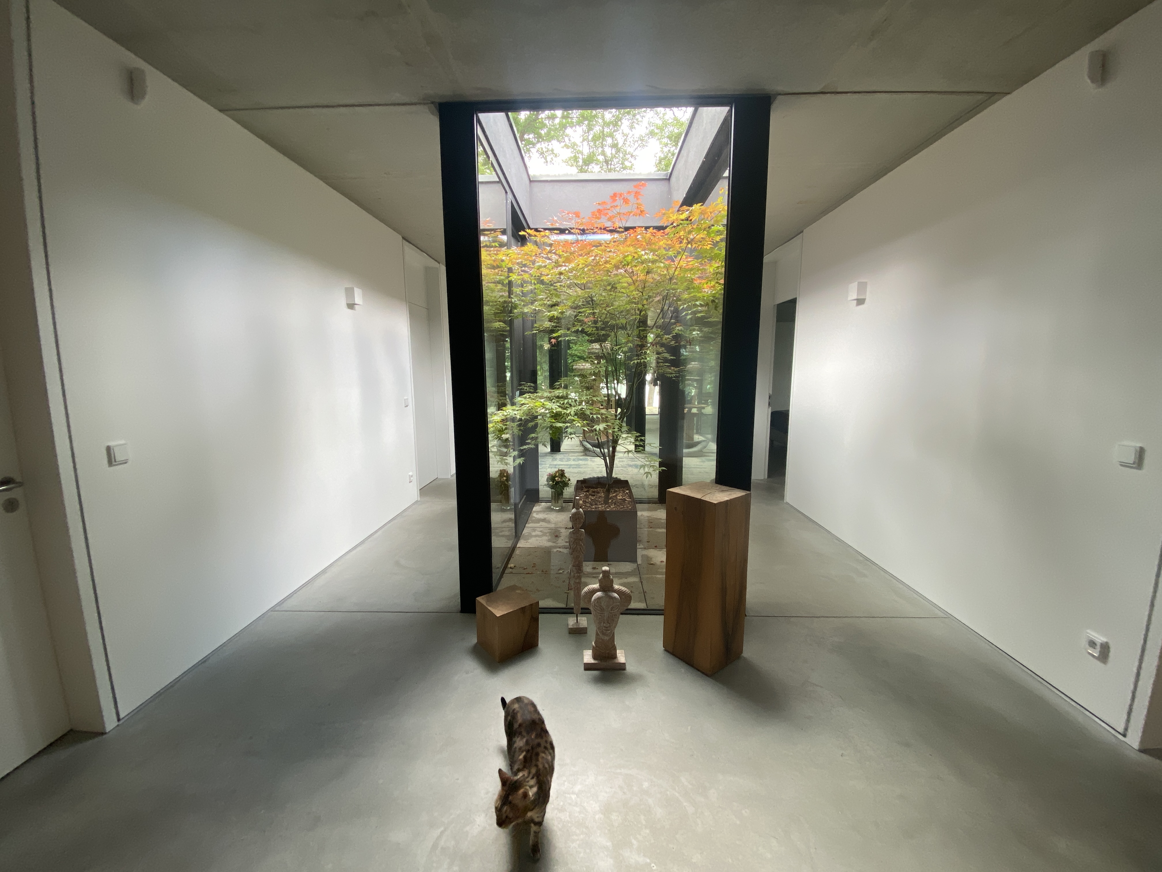 Nestled in a serene forest and bordered by a tranquil lake, this stunning modern home offers a perfect blend of natural beauty and architectural elegance. The house features expansive glass walls that provide unobstructed views of the lush greenery and silhouetted sunset over the lake, creating an environment of peace and calm. This home is designed with a modern minimalistic approach, integrating high-end finishes like polished wood, sleek kitchen appliances, and large, airy spaces that blend seamlessly with the outdoor surroundings.