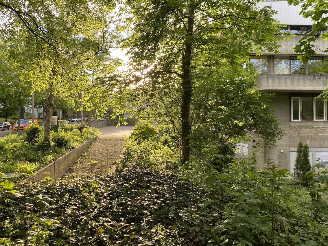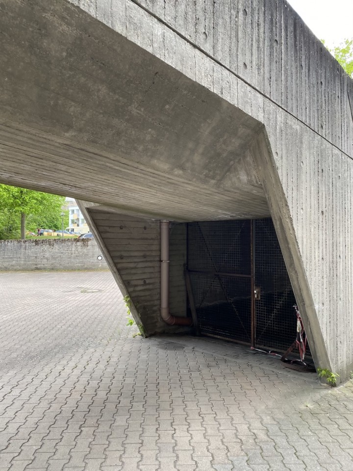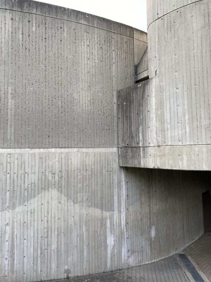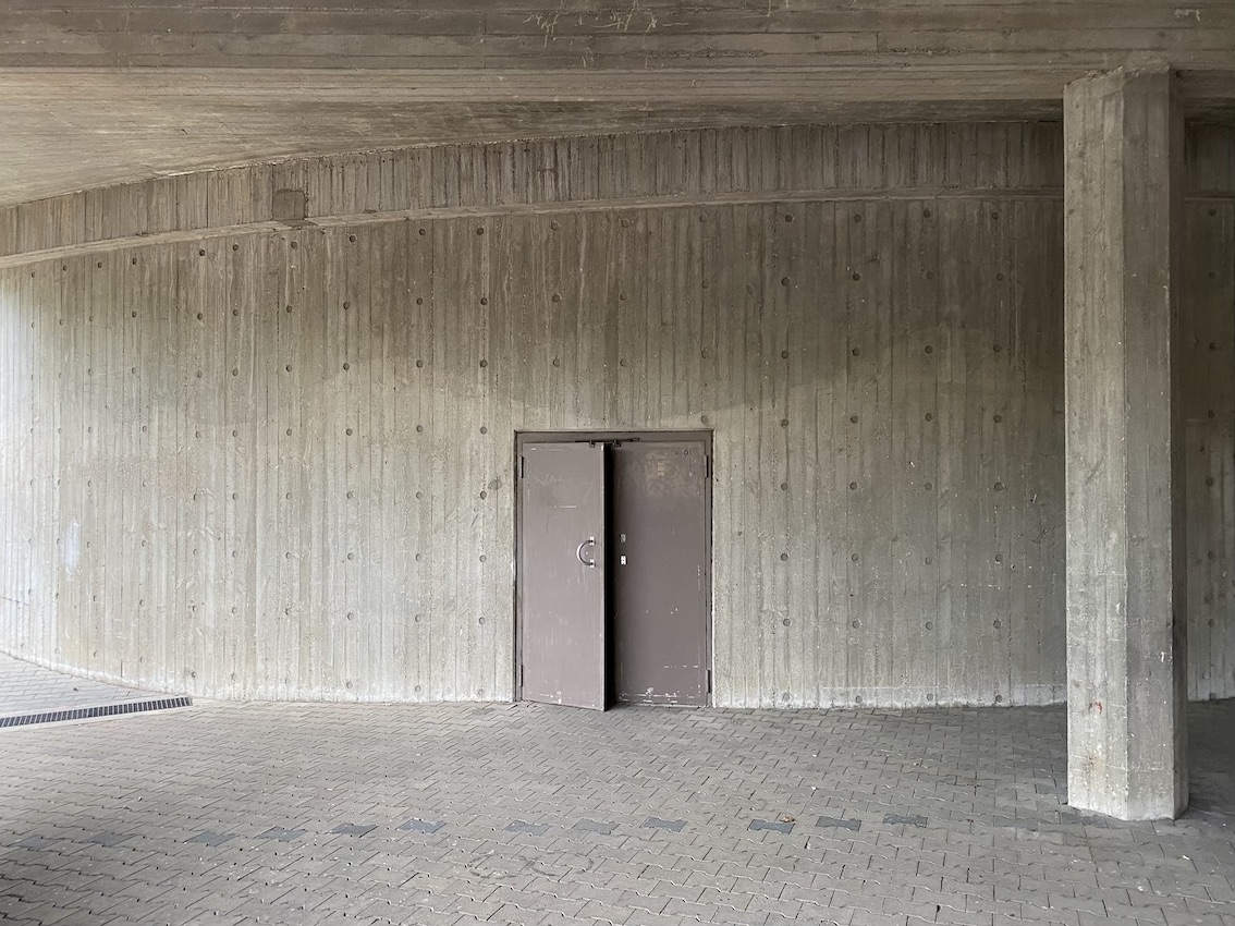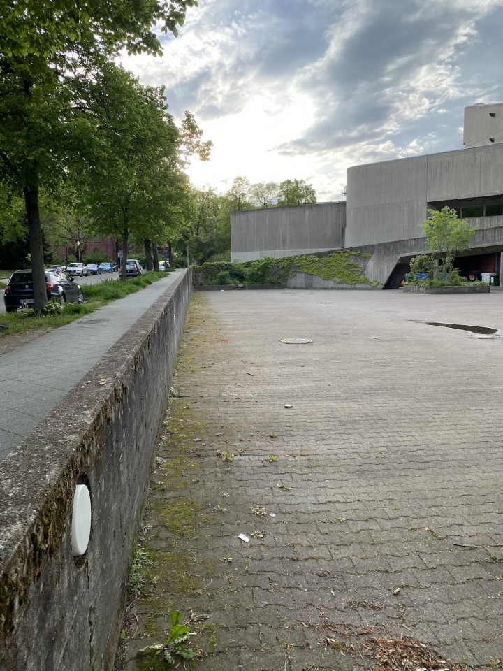 The property boasts several uniquely captivating elements such as curved architecture that harmonizes with the surrounding trees under clear and cloudy skies alike, enhancing the sense of isolation and tranquility within a bustling urban environment. The presence of minimalist and functional details like metal grilles, colorful recycling bins, and no parking signage, alongside the serenity of sparse yet strategic green spaces with benches and shelter, adds to the urban charm and utility of the scene. This architectural collective not only appeals to those with an appreciation for stark, powerful aesthetics but also offers a sanctuary with its overgrown, verdant surroundings and moments of bright, sunlit paths inviting peaceful urban walks and quiet reflection.