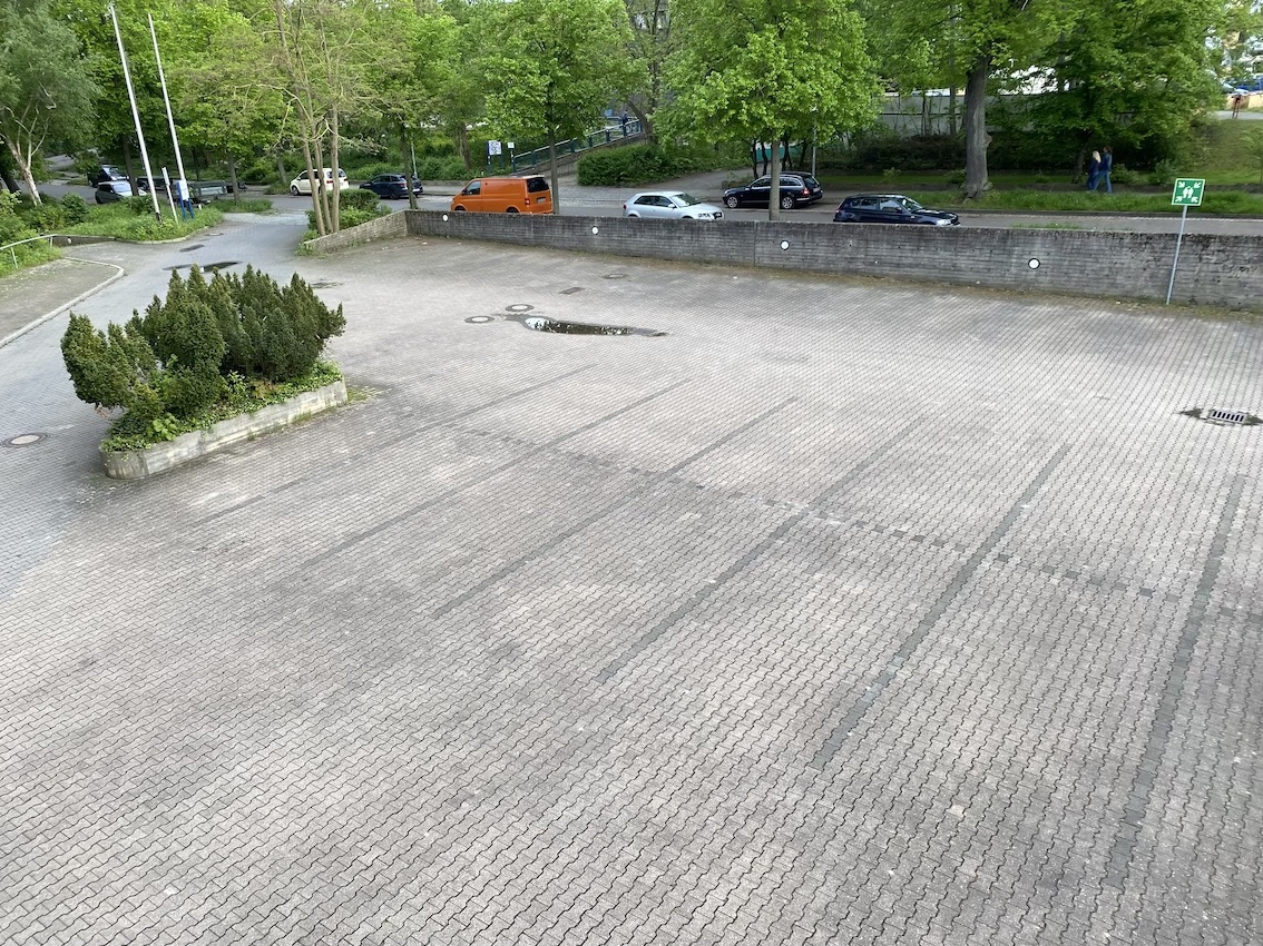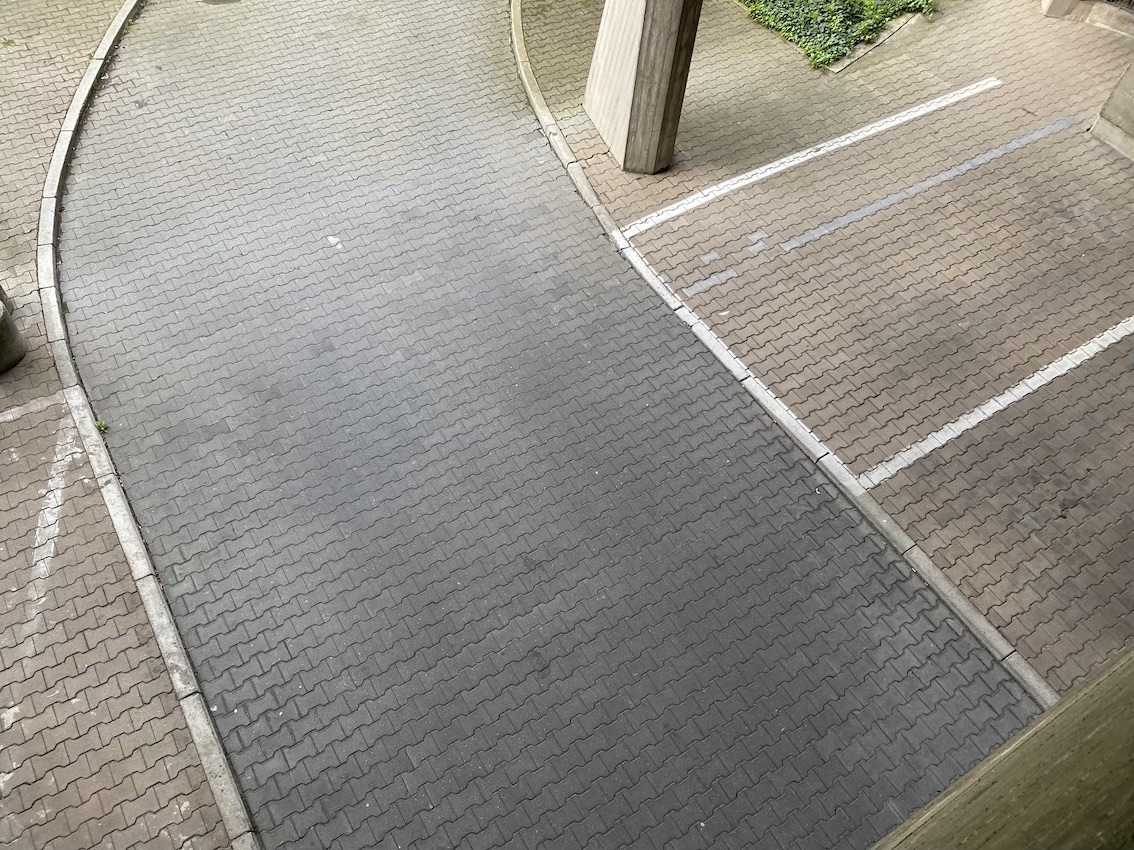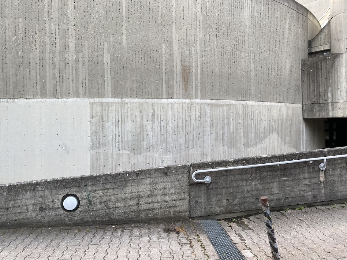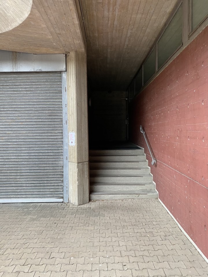 The property boasts several uniquely captivating elements such as curved architecture that harmonizes with the surrounding trees under clear and cloudy skies alike, enhancing the sense of isolation and tranquility within a bustling urban environment. The presence of minimalist and functional details like metal grilles, colorful recycling bins, and no parking signage, alongside the serenity of sparse yet strategic green spaces with benches and shelter, adds to the urban charm and utility of the scene. This architectural collective not only appeals to those with an appreciation for stark, powerful aesthetics but also offers a sanctuary with its overgrown, verdant surroundings and moments of bright, sunlit paths inviting peaceful urban walks and quiet reflection.