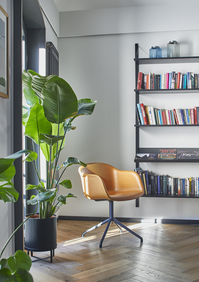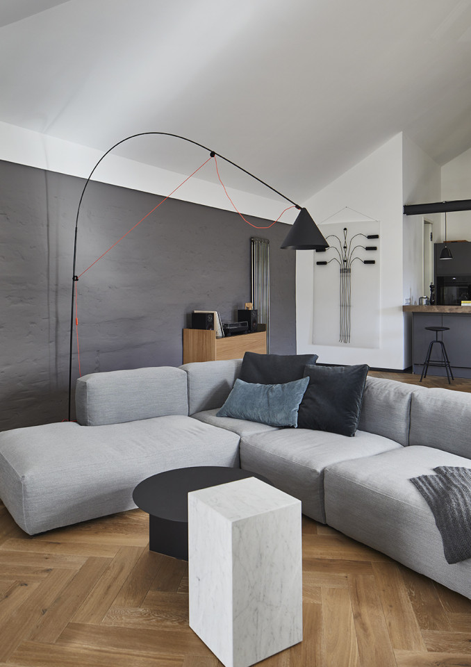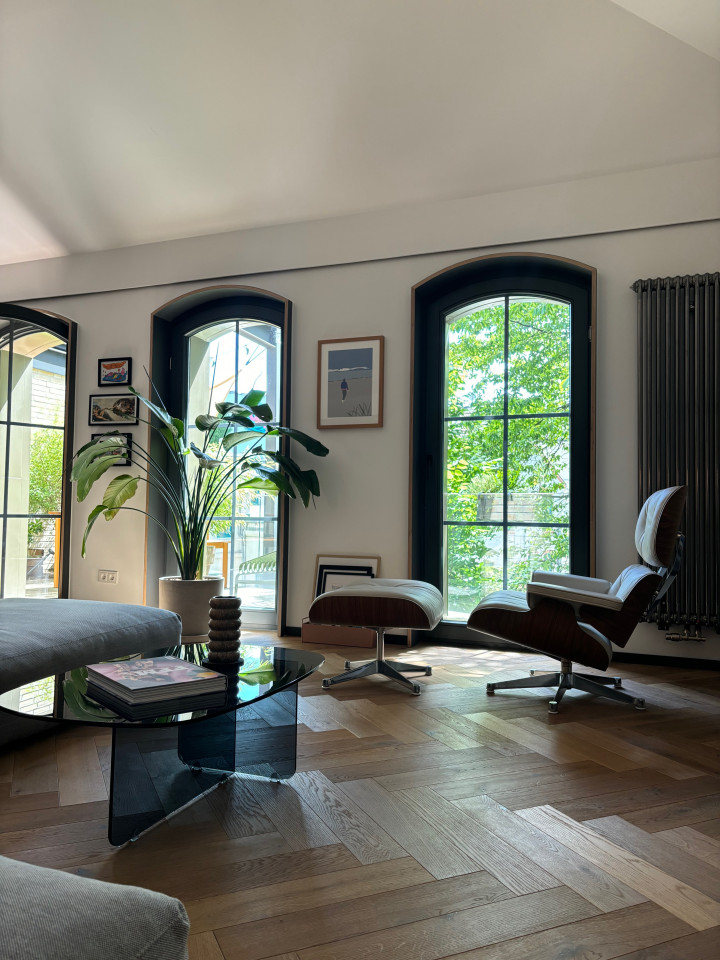 This stunning industrial loft is located in a restored old printing works in Hamburg. This unique space boasts 6-metre high ceilings and is furnished to a high standard with selected design classics and accessories, featuring pieces from renowned brands such as USM Haller, Vitra, Muuto, Hay, Objekte unserer Tage, Carl Hansen, and many more.
