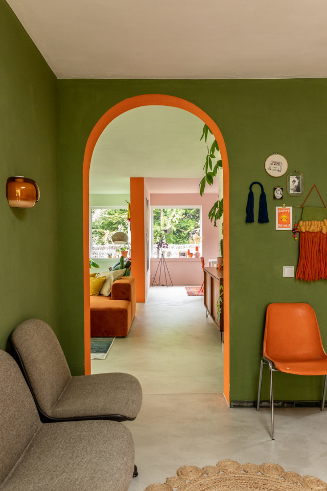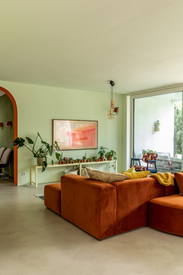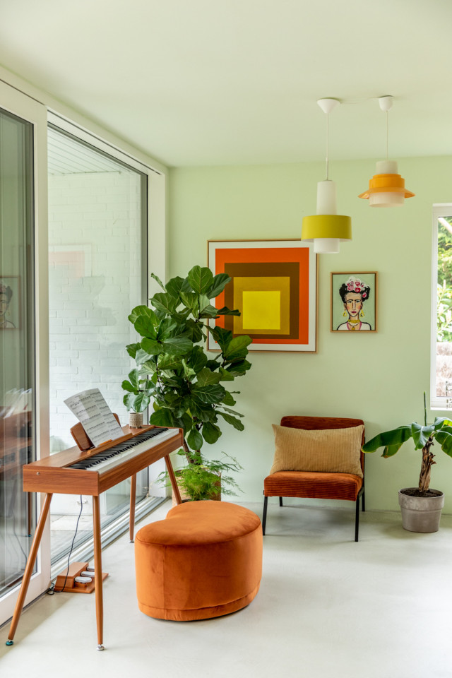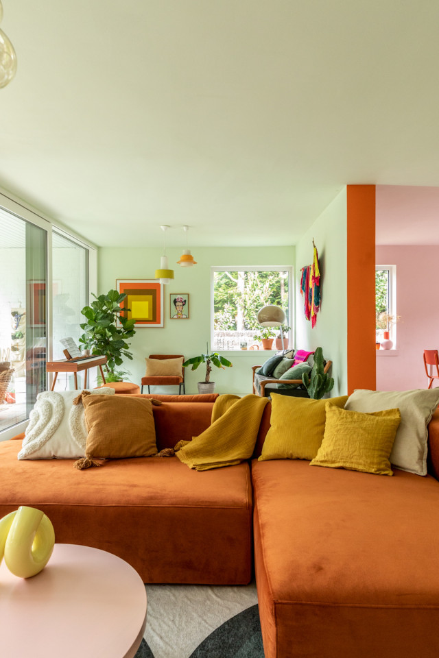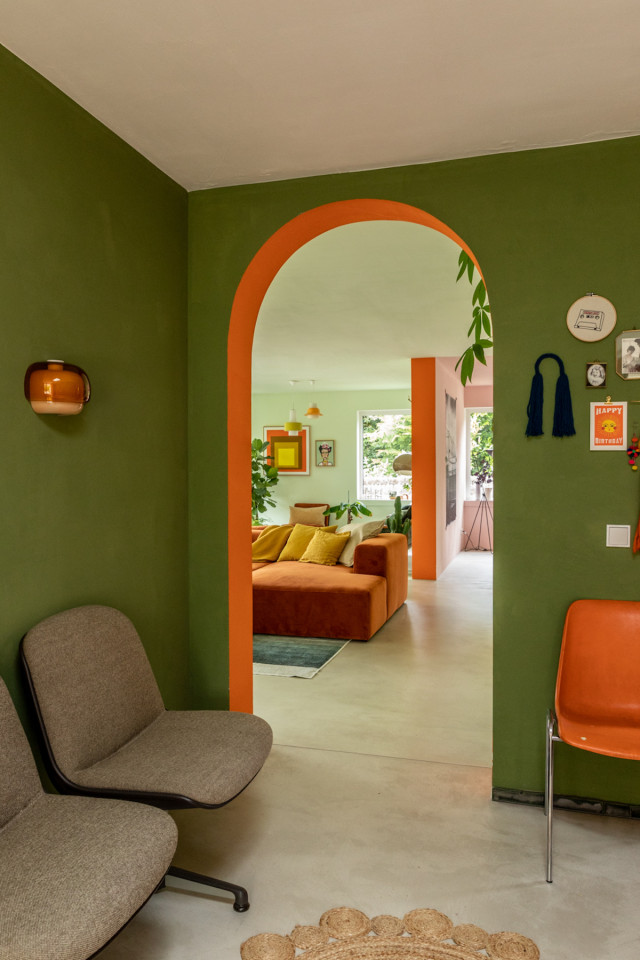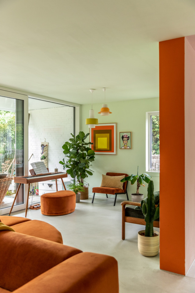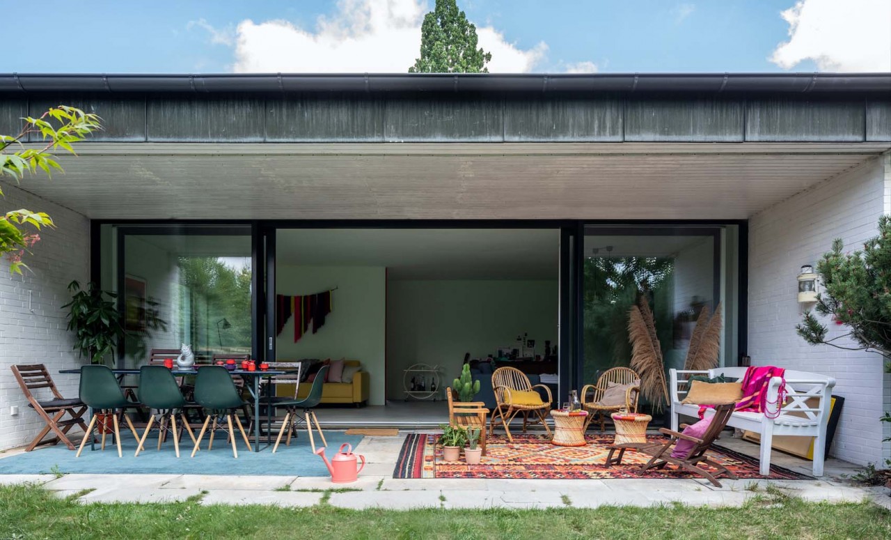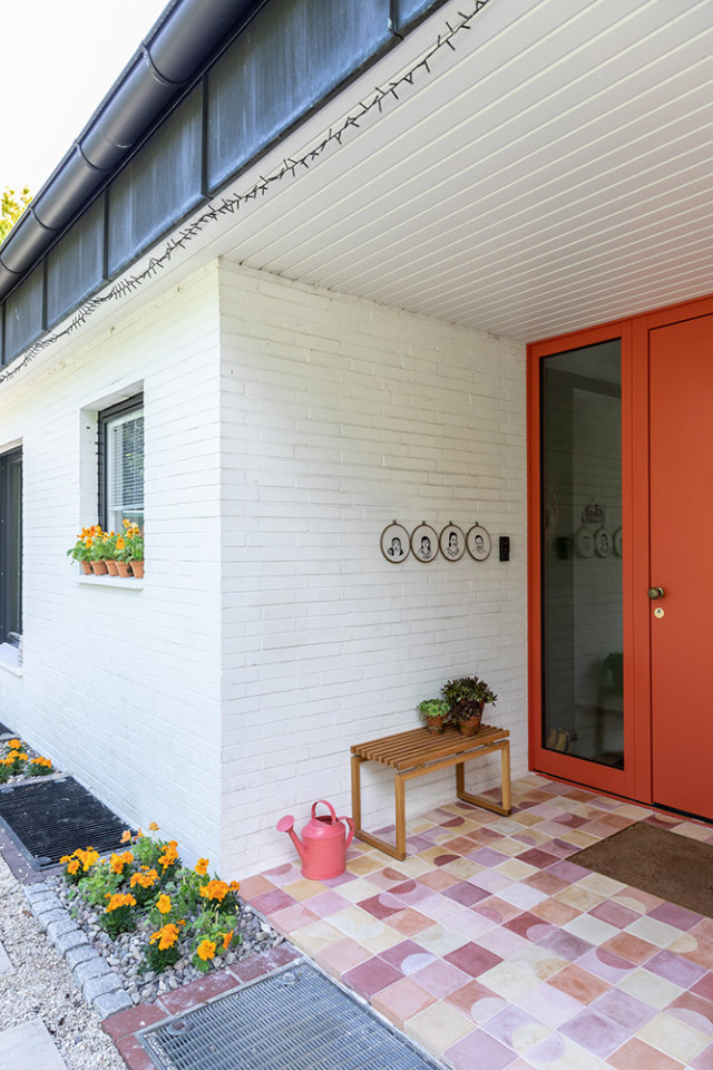 This happy, colorful bungalow was built in 1969 and then fully renovated by their new owners in 2020. While staying true to the late 60s style in some details of the house, the focus was also to create a sustainable living space with a healthy air climate. The bungalow is located in the beautiful Villenviertel of Bergedorf, Hamburg. The garden is 770sqm and fully enclosed by trees and plants. The large terrace is facing South, while the smaller terrace is facing North. Besides an open living, eating, and kitchen area, the house has 4 bedrooms and 2 bathrooms. A small little Gartenlaube (garden hut) is furnished as an office.