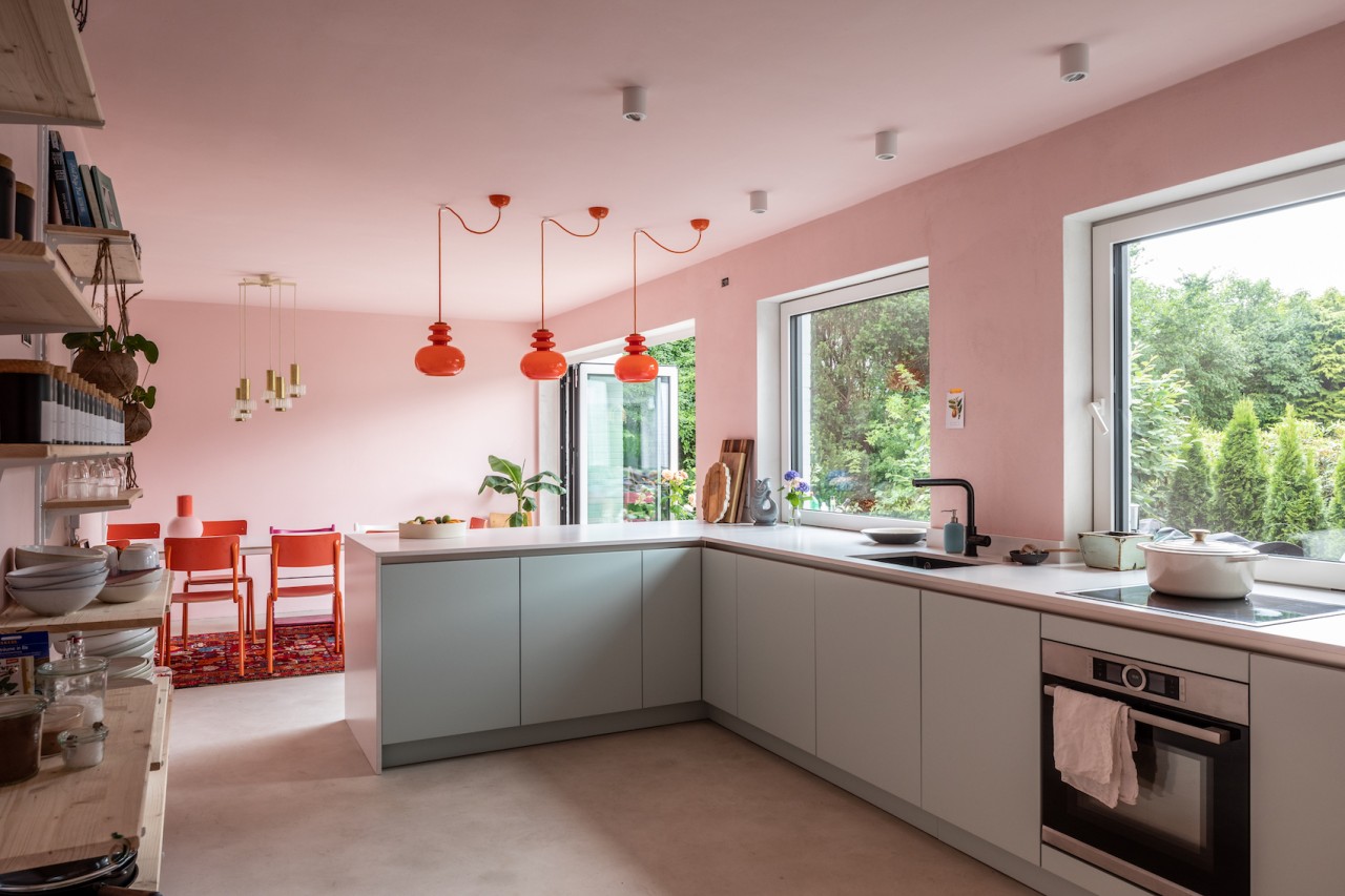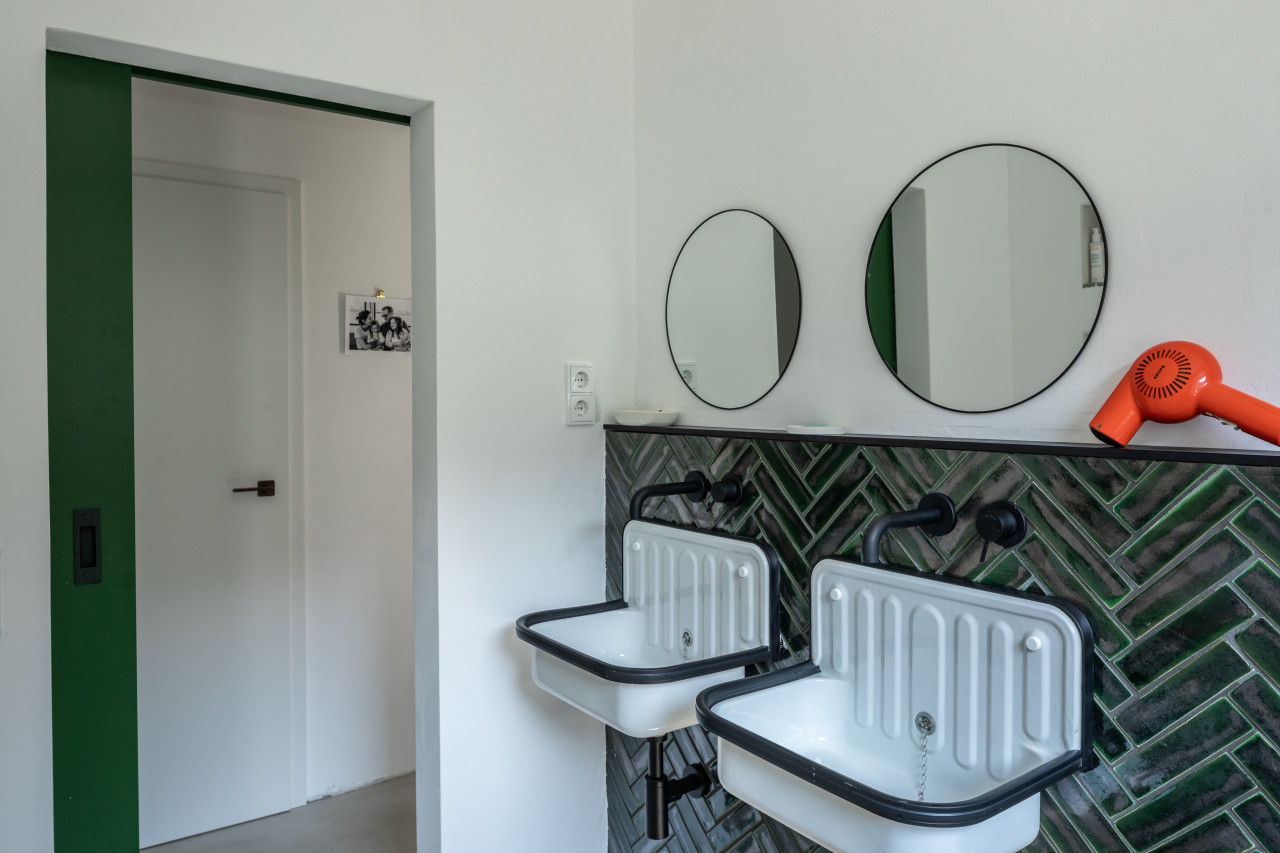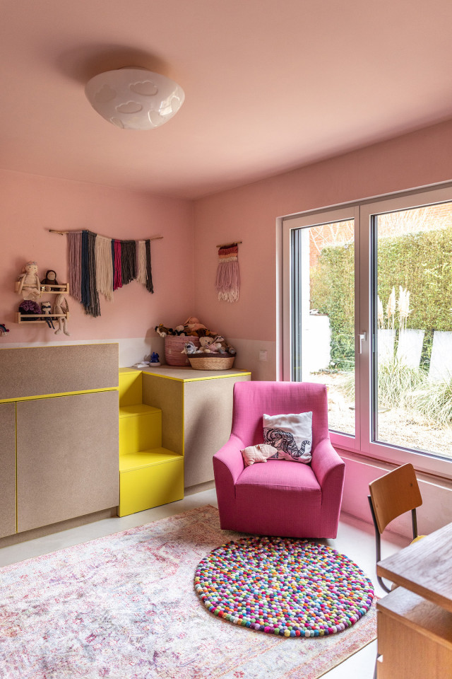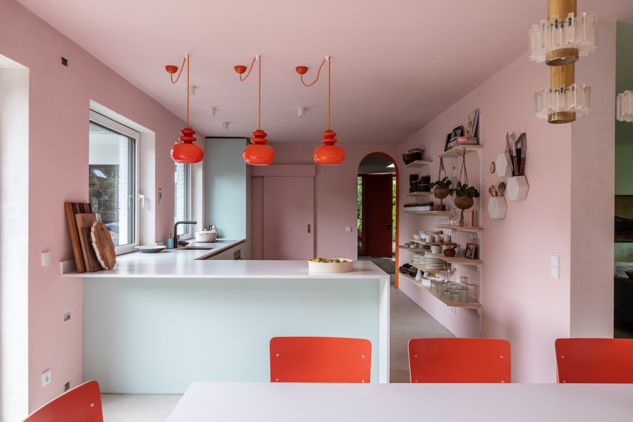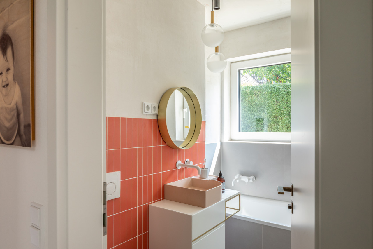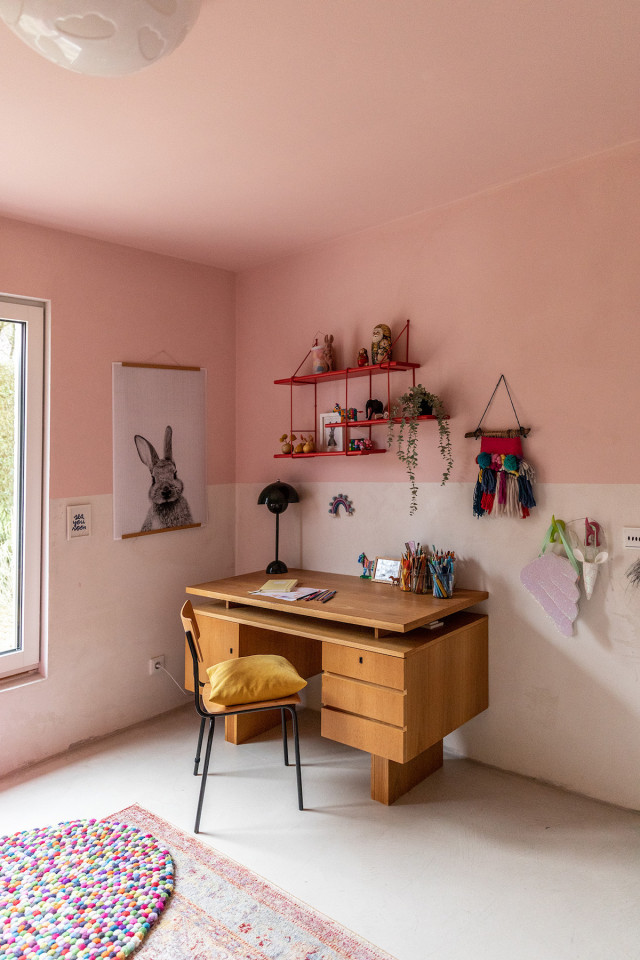 This happy, colorful bungalow was built in 1969 and then fully renovated by their new owners in 2020. While staying true to the late 60s style in some details of the house, the focus was also to create a sustainable living space with a healthy air climate. The bungalow is located in the beautiful Villenviertel of Bergedorf, Hamburg. The garden is 770sqm and fully enclosed by trees and plants. The large terrace is facing South, while the smaller terrace is facing North. Besides an open living, eating, and kitchen area, the house has 4 bedrooms and 2 bathrooms. A small little Gartenlaube (garden hut) is furnished as an office.