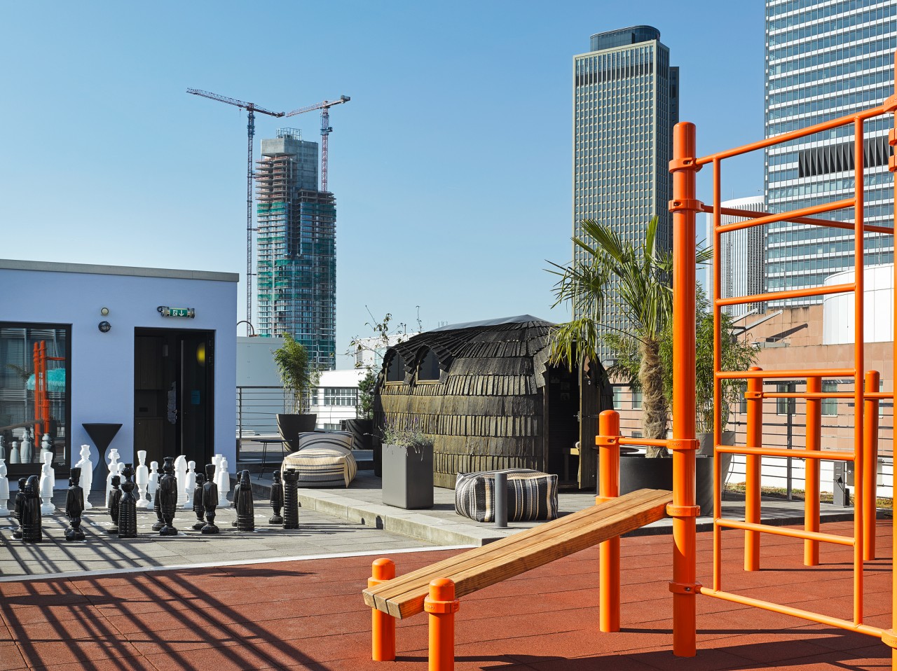 The spectacular roof terrace with the traditional Finnish sauna is perched imperiously, high up on the 6th floor. A quiet zone invites guests to laze around on recliners. A calisthenics parkour is laid out for fresh air workouts with a view of the Frankfurt skyline. Then there is the inner courtyard – a miniature oasis to kick back at the heart of the Bahnhofsviertel, far from the madding crowd. Guests can also enjoy food from BAR SHUKA here during spells of good weather.