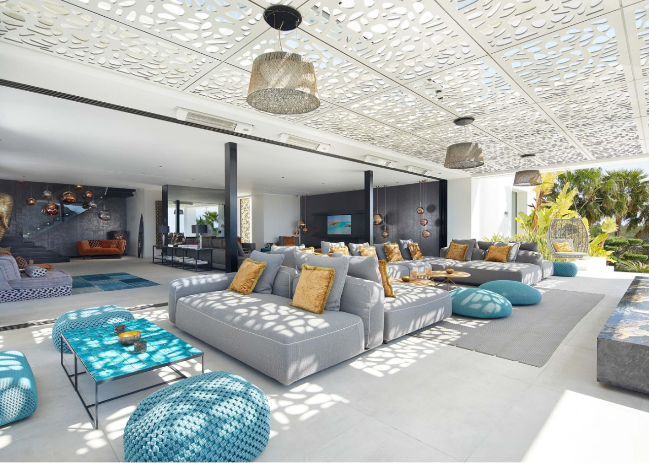 Bright and stylish living area overlooking the outdoor terrace and lounge