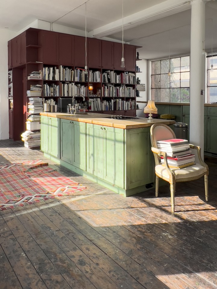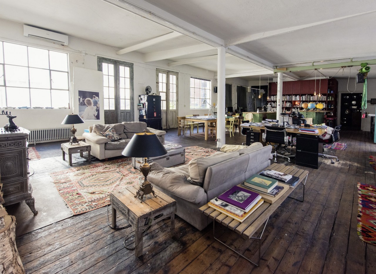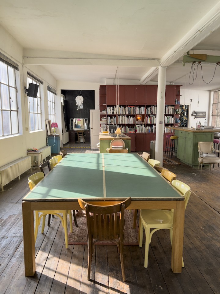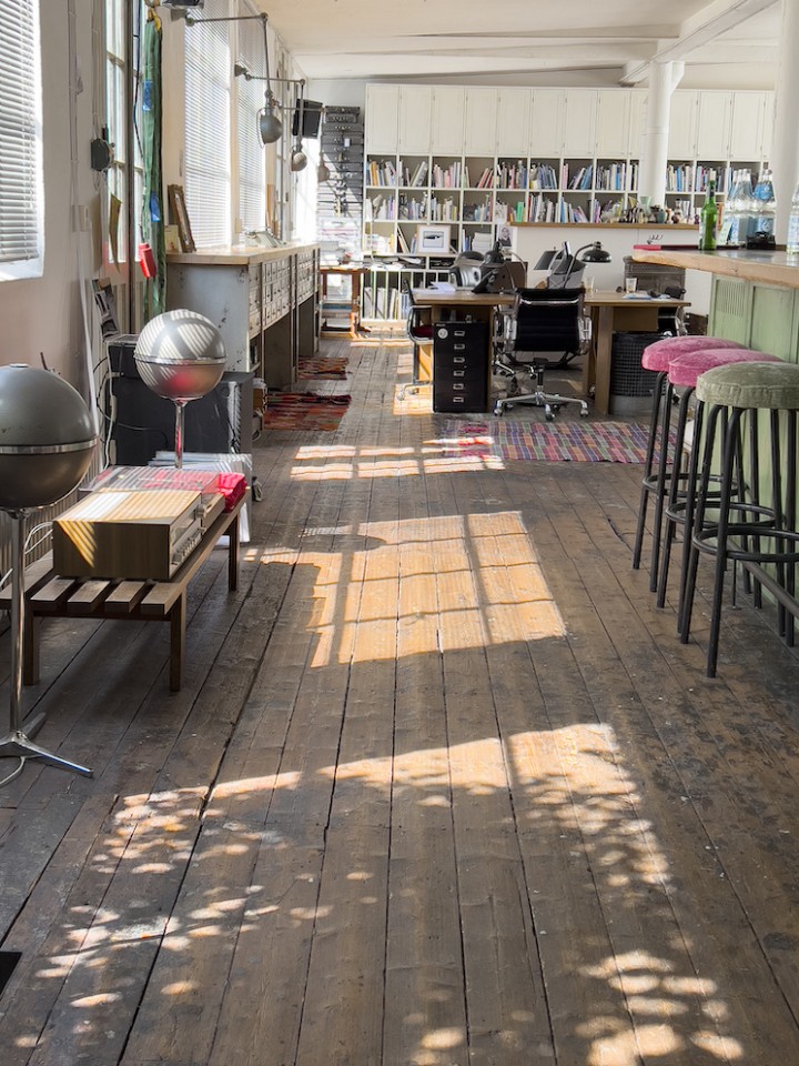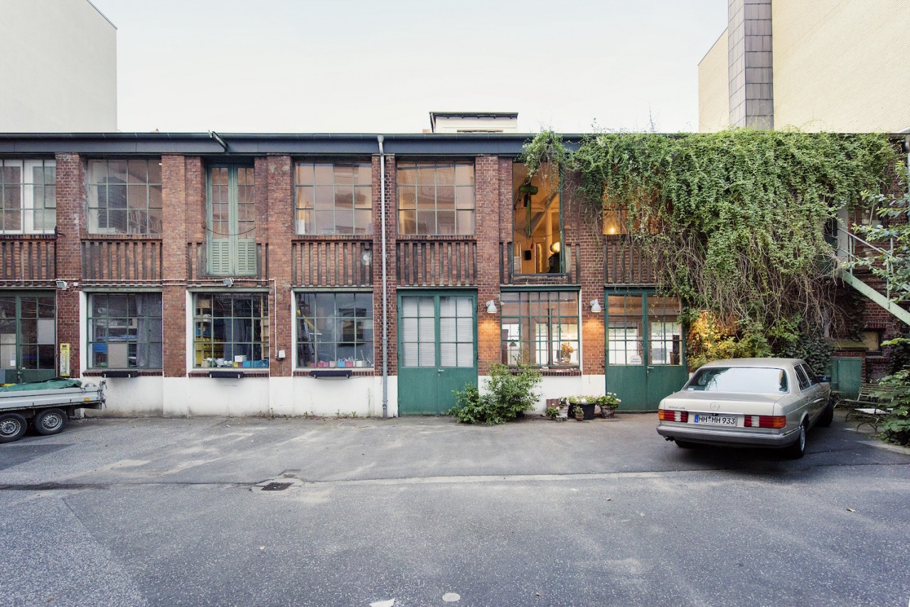 This spacious and luminous loft is situated next to a canal in the neighbourhood of Uhlenhorst in Hamburg. It features an aged wooden floor, high windows for ample day light, a beautiful wooden kitchen and a ping pong table for special meetings ! The carefully selected furniture creates a funky but well thought through ambience. Another highlight is a corner with a huge collection of antique, golden framed mirrors. The loft can be rented together with the, equally unique, lower floor.