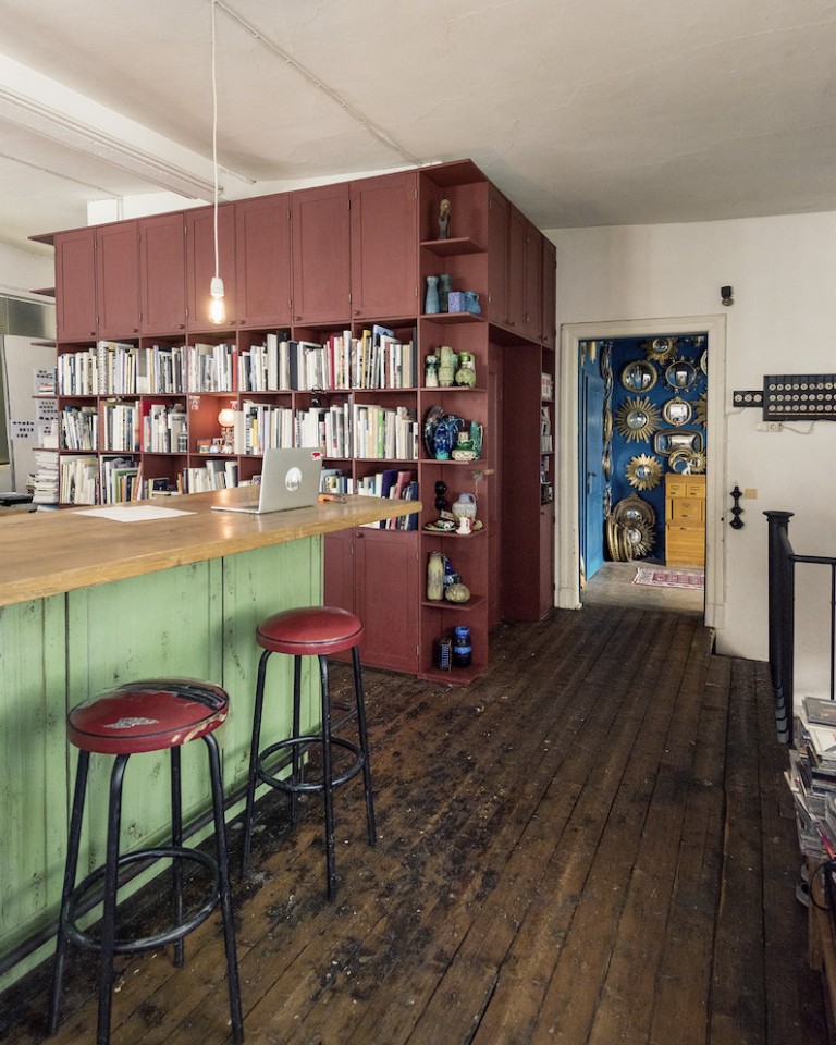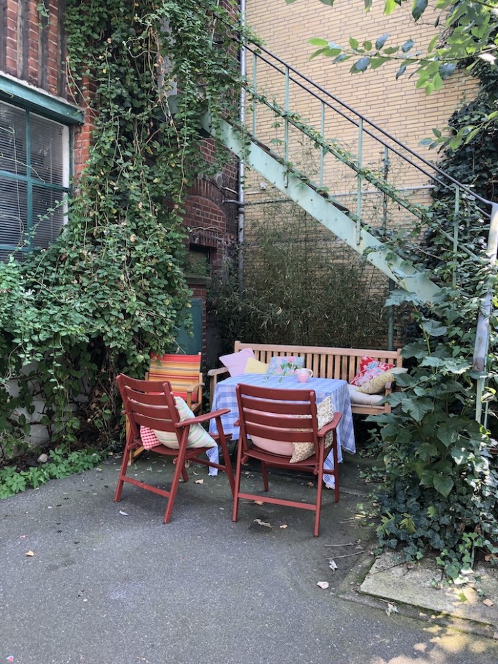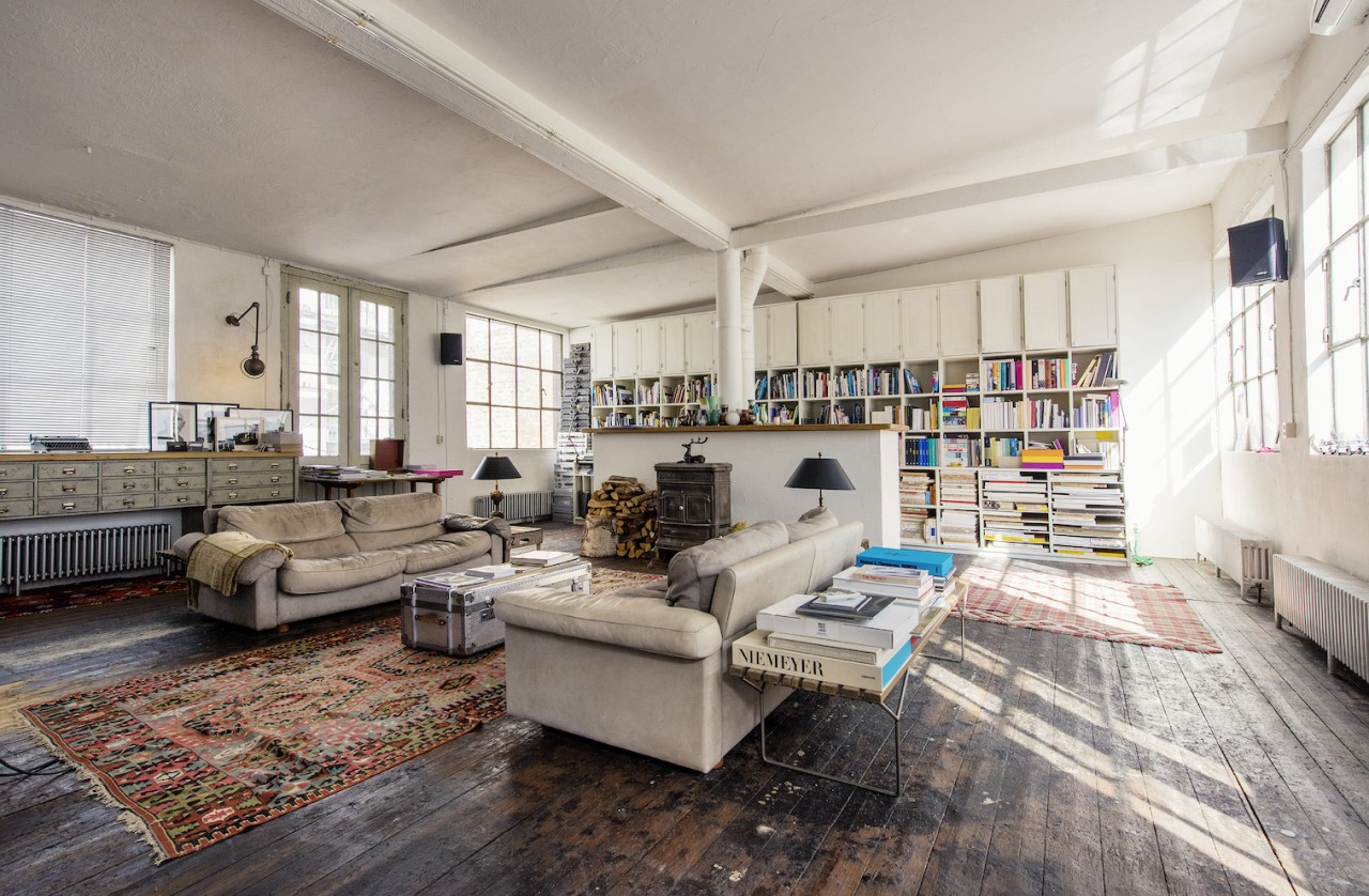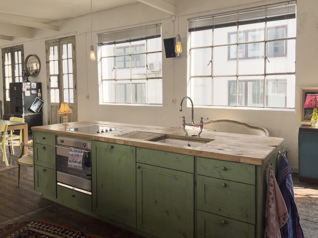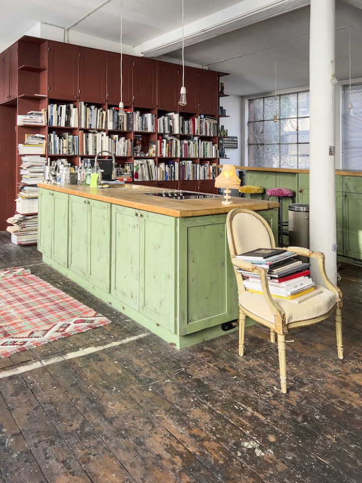 This spacious and luminous loft is situated next to a canal in the neighbourhood of Uhlenhorst in Hamburg. It features an aged wooden floor, high windows for ample day light, a beautiful wooden kitchen and a ping pong table for special meetings ! The carefully selected furniture creates a funky but well thought through ambience. Another highlight is a corner with a huge collection of antique, golden framed mirrors. The loft can be rented together with the, equally unique, lower floor.