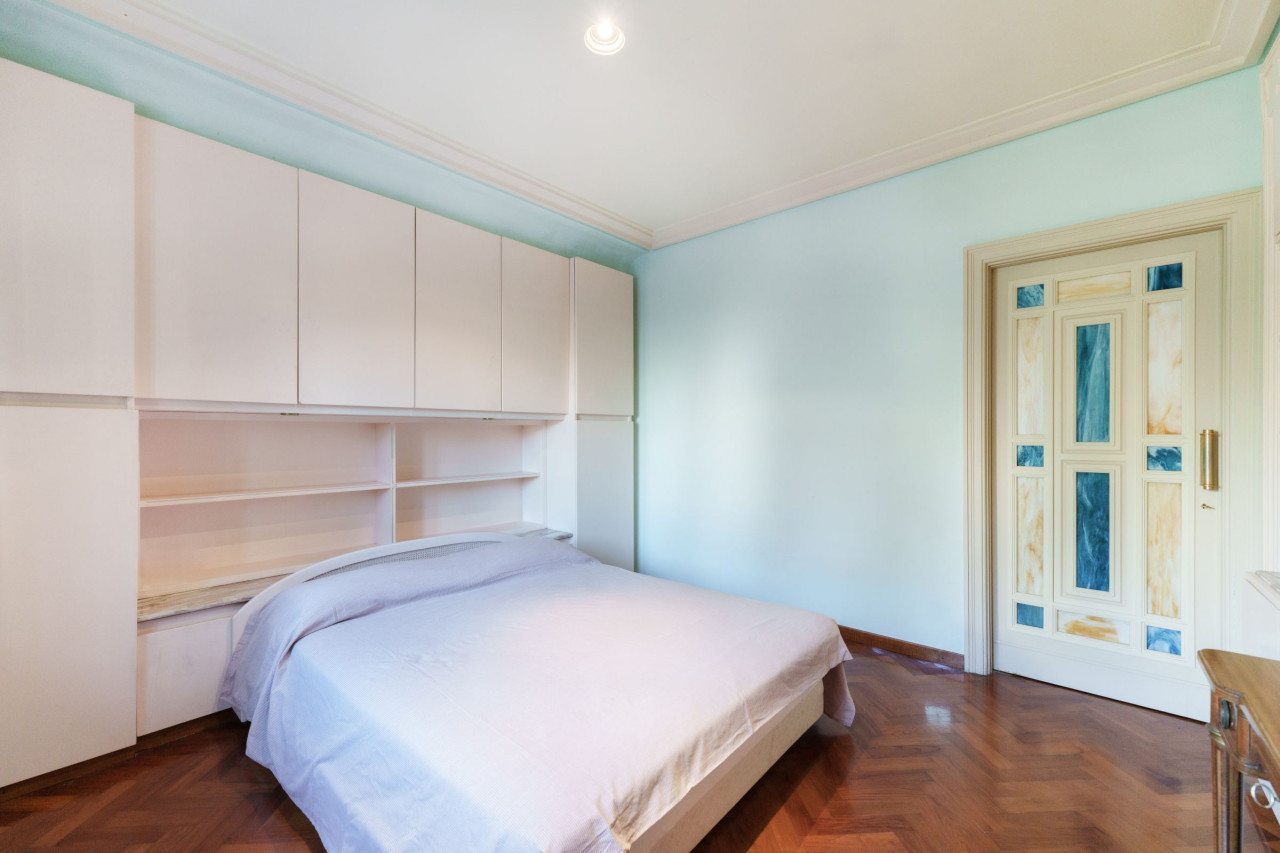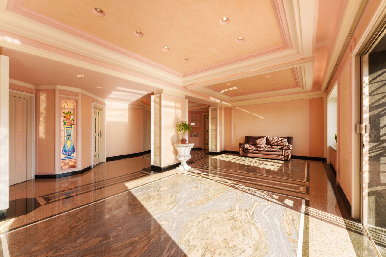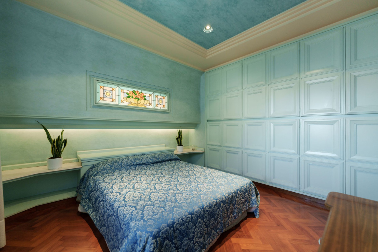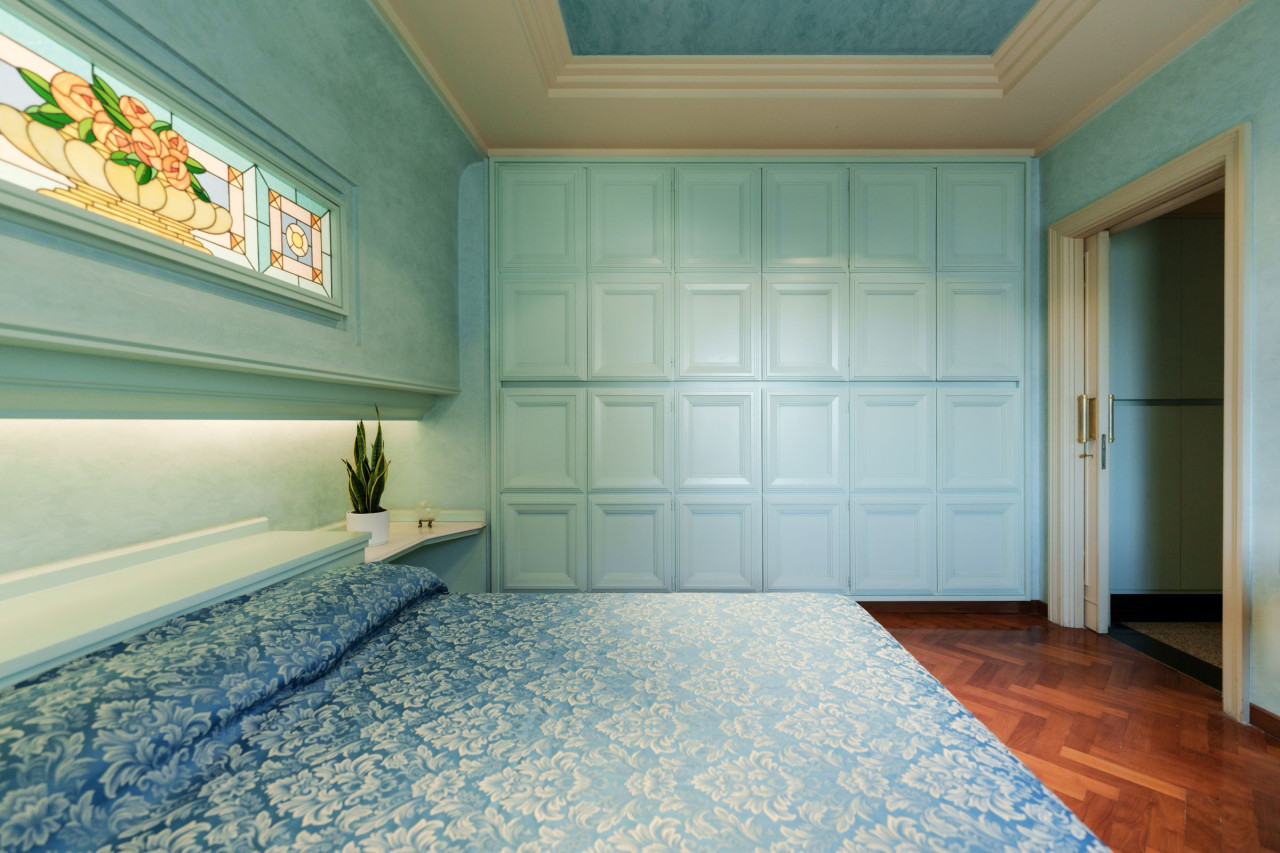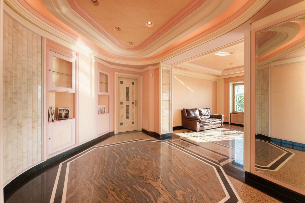 The expansive reception hall is a key feature, with elegant colors, fine wood finishes, and stunning retro-illuminated stained glass windows that create captivating light effects and a striking ambiance. The interiors include a functional kitchen, three bedrooms, and two bathrooms, all thoughtfully maintaining the authentic style of the era.