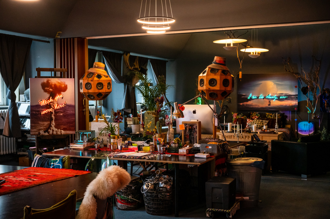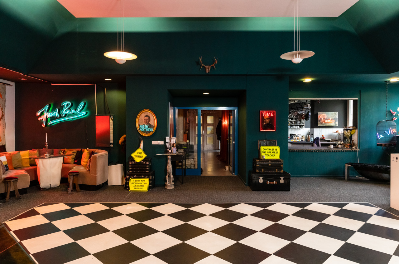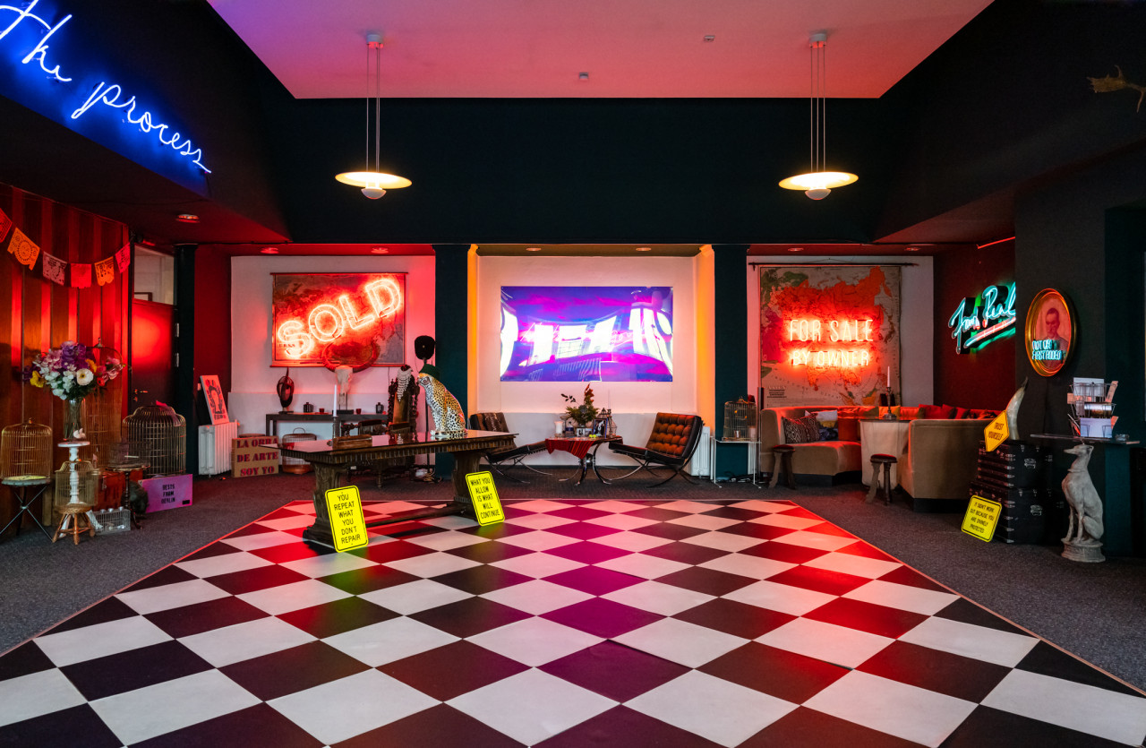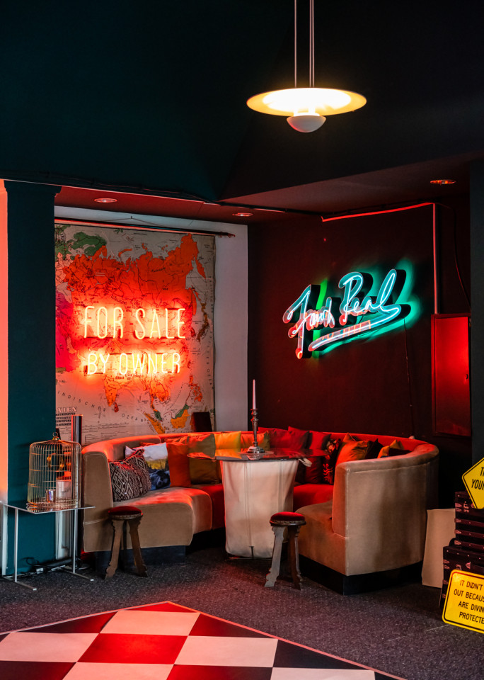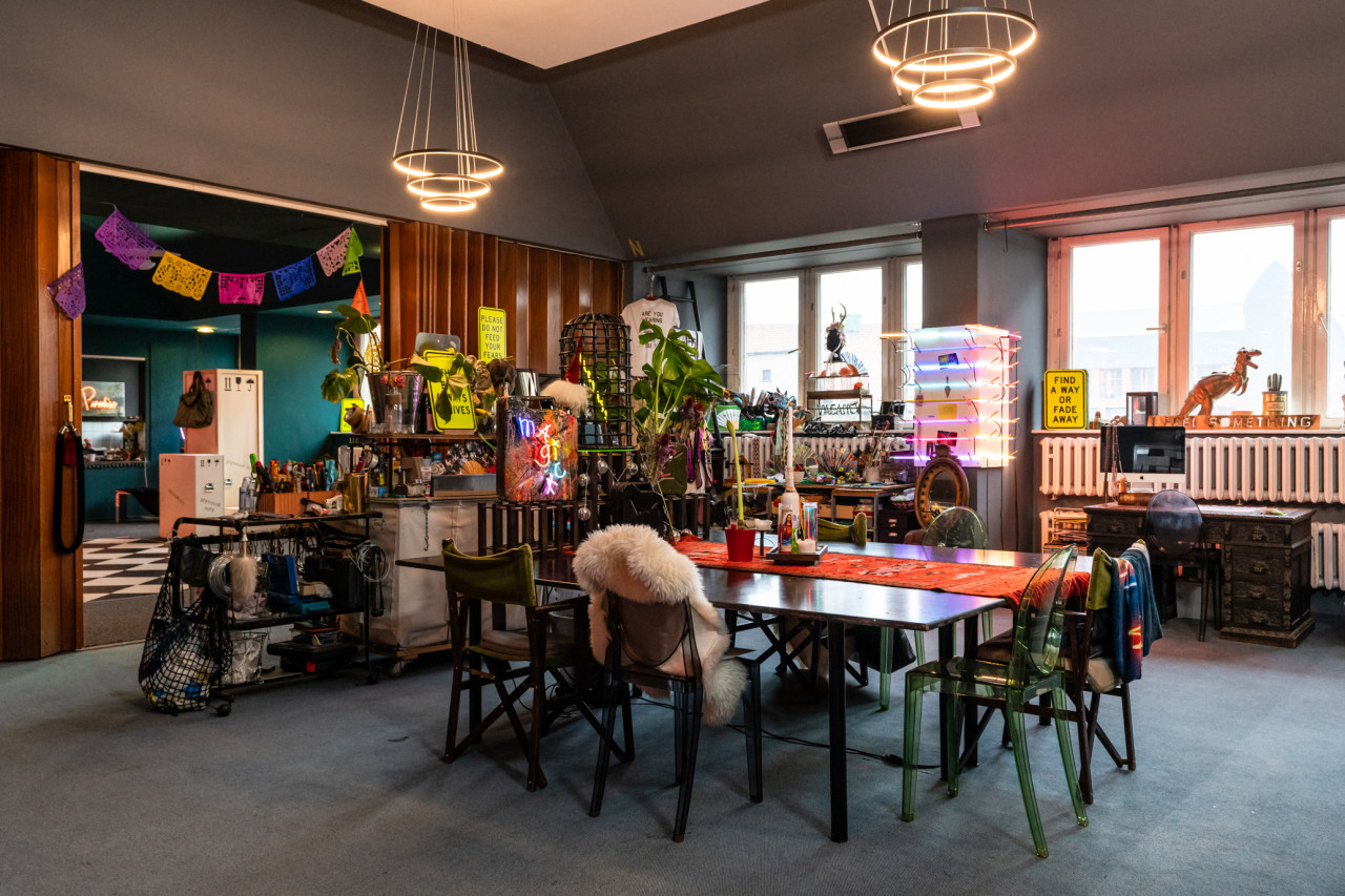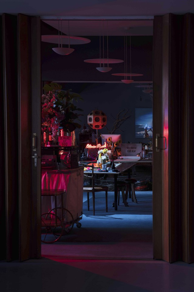 The beautifully curated studio of the artist is filled with iconic art and neon light installations making it a truly unique location. The versatile space can be divided into three rooms or opened up into a large communal area. There is also a large kitchen which is ideal for catering. The kitchen comes fully equipped with two sinks, ample preparation space, a service window and counter.