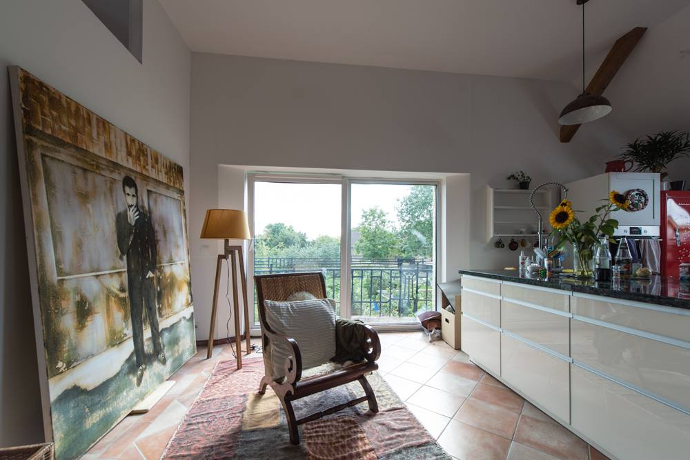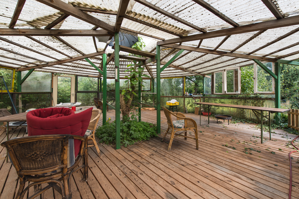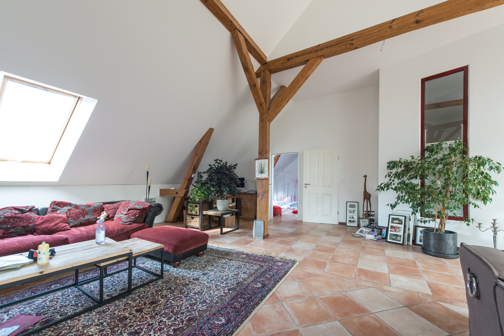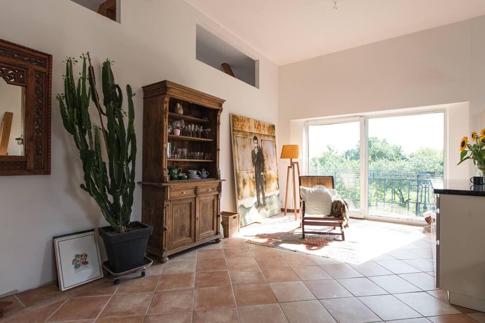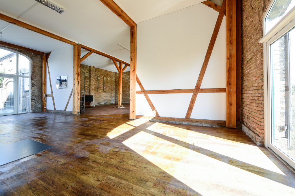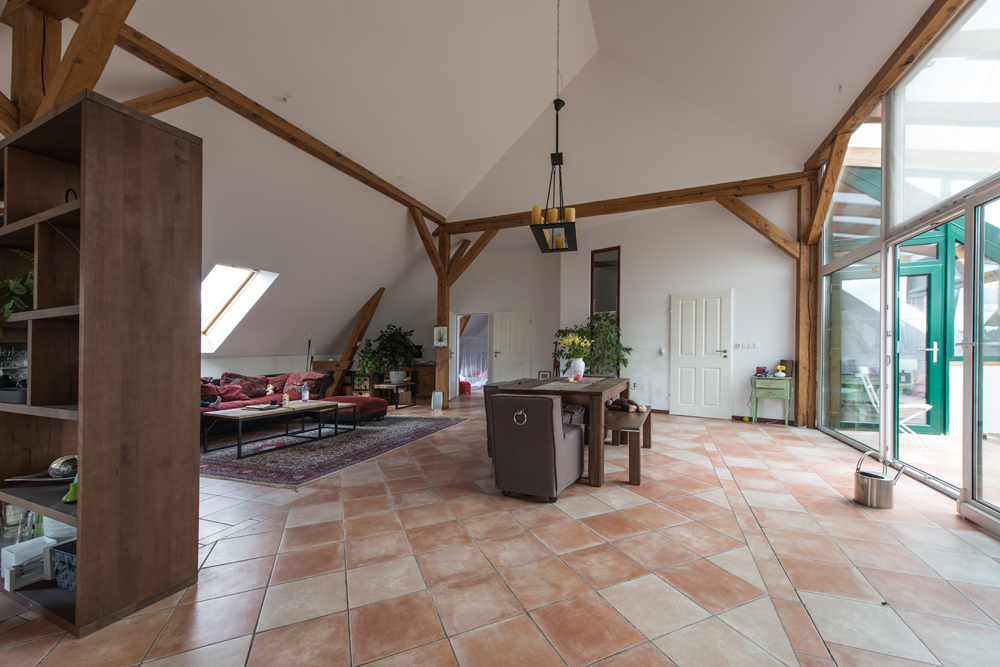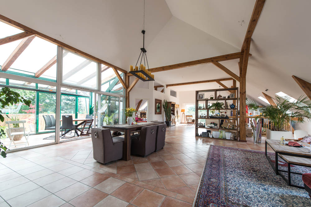 At ground level is the new room, 160sqm large with 5m high ceiling. Seating up to 25 people possible, in fine weather also in the garden. Organic catering and drinks can be ordered.