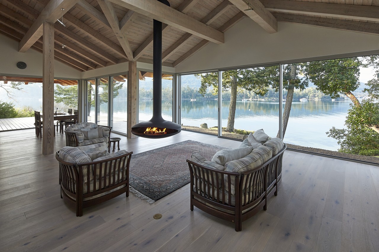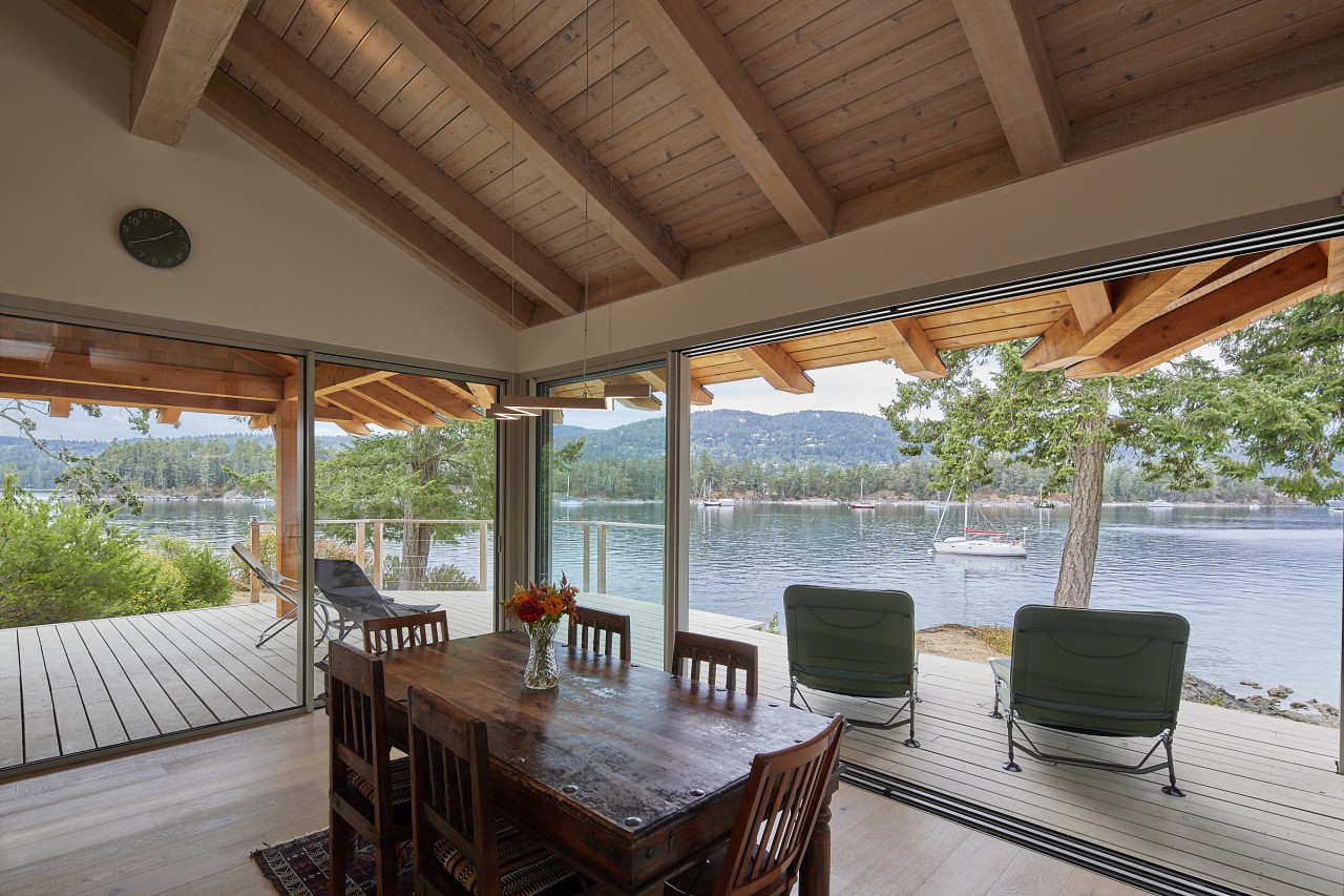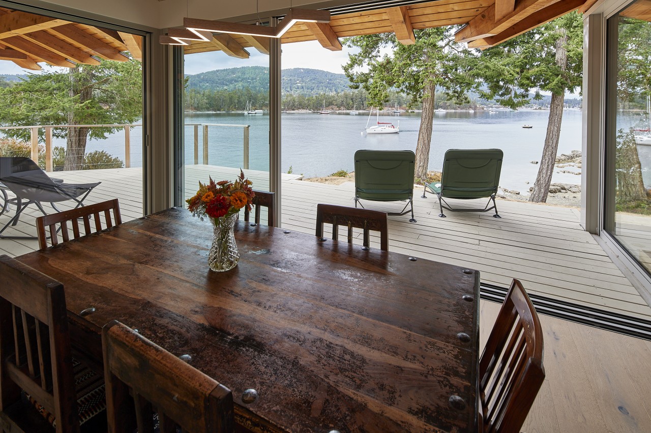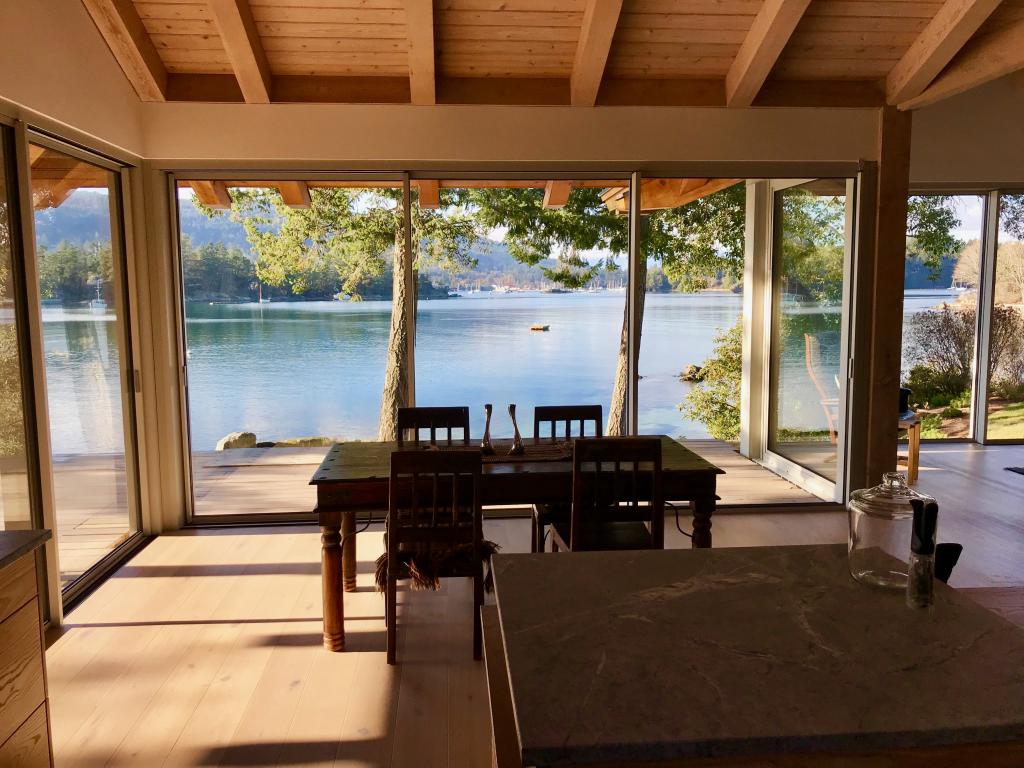 Northwest contemporary design, a post and beam home integrated with floor to ceiling sliding glass walls encompassing wide open views of the ocean and chain islands. Long Harbour house offers a Light and airy space. Long evening sunsets extend the day and at night the distant lights of Ganges across the water add a special magic.
