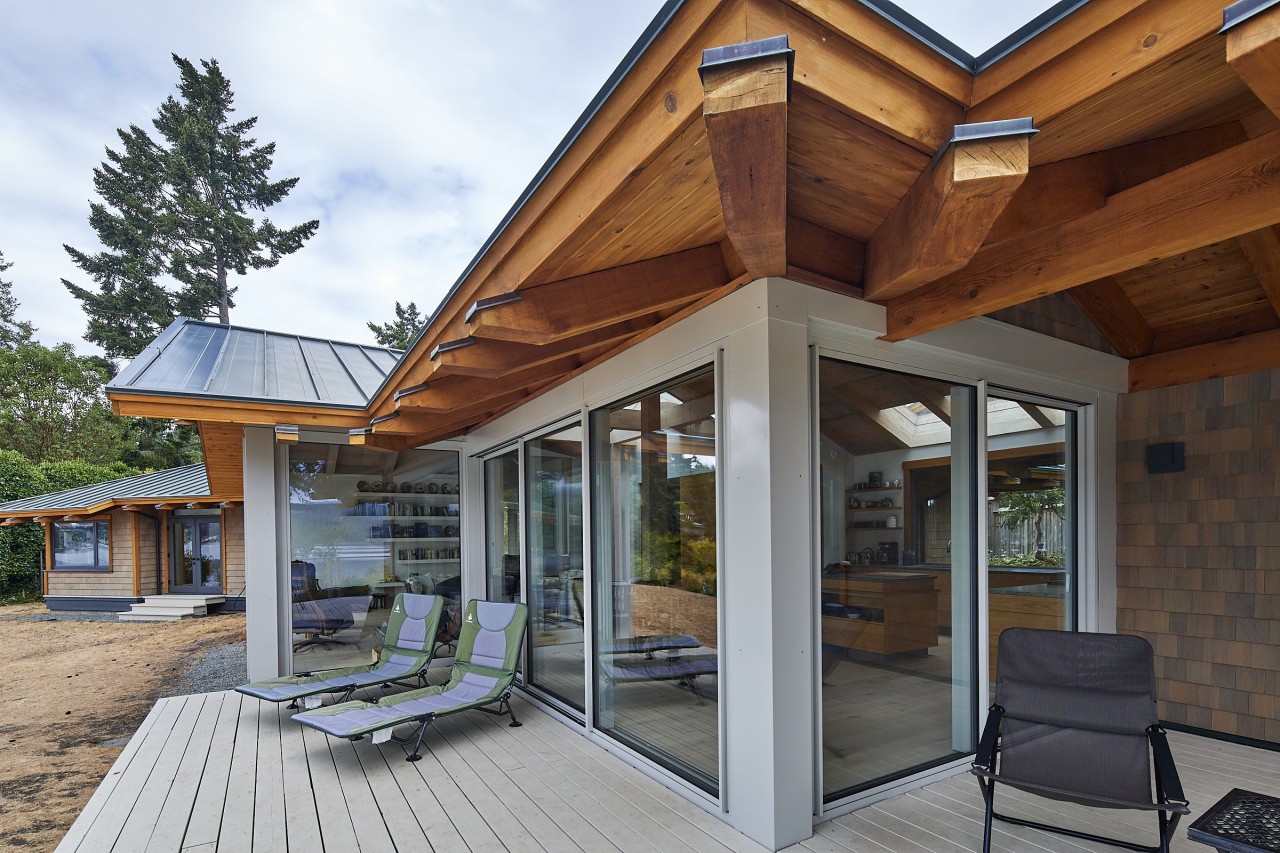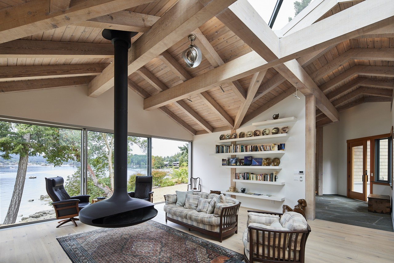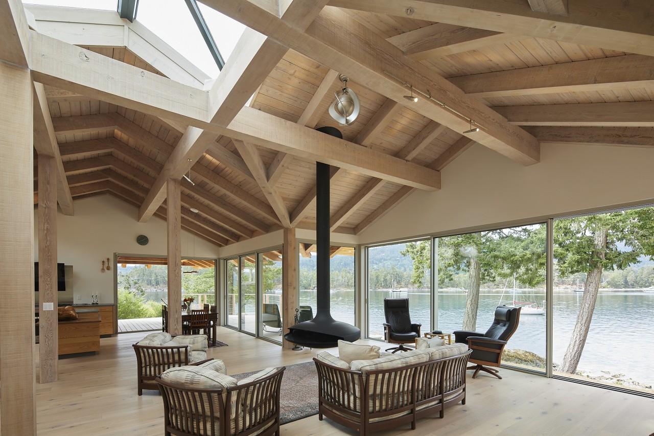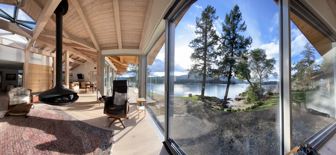 Northwest contemporary design, a post and beam home integrated with floor to ceiling sliding glass walls encompassing wide open views of the ocean and chain islands. Long Harbour house offers a Light and airy space. Long evening sunsets extend the day and at night the distant lights of Ganges across the water add a special magic.