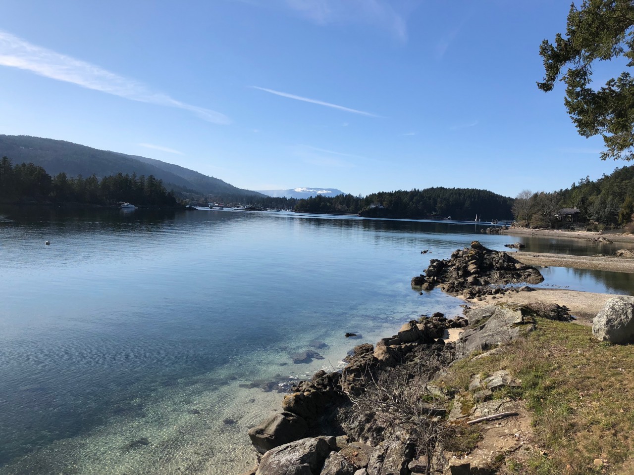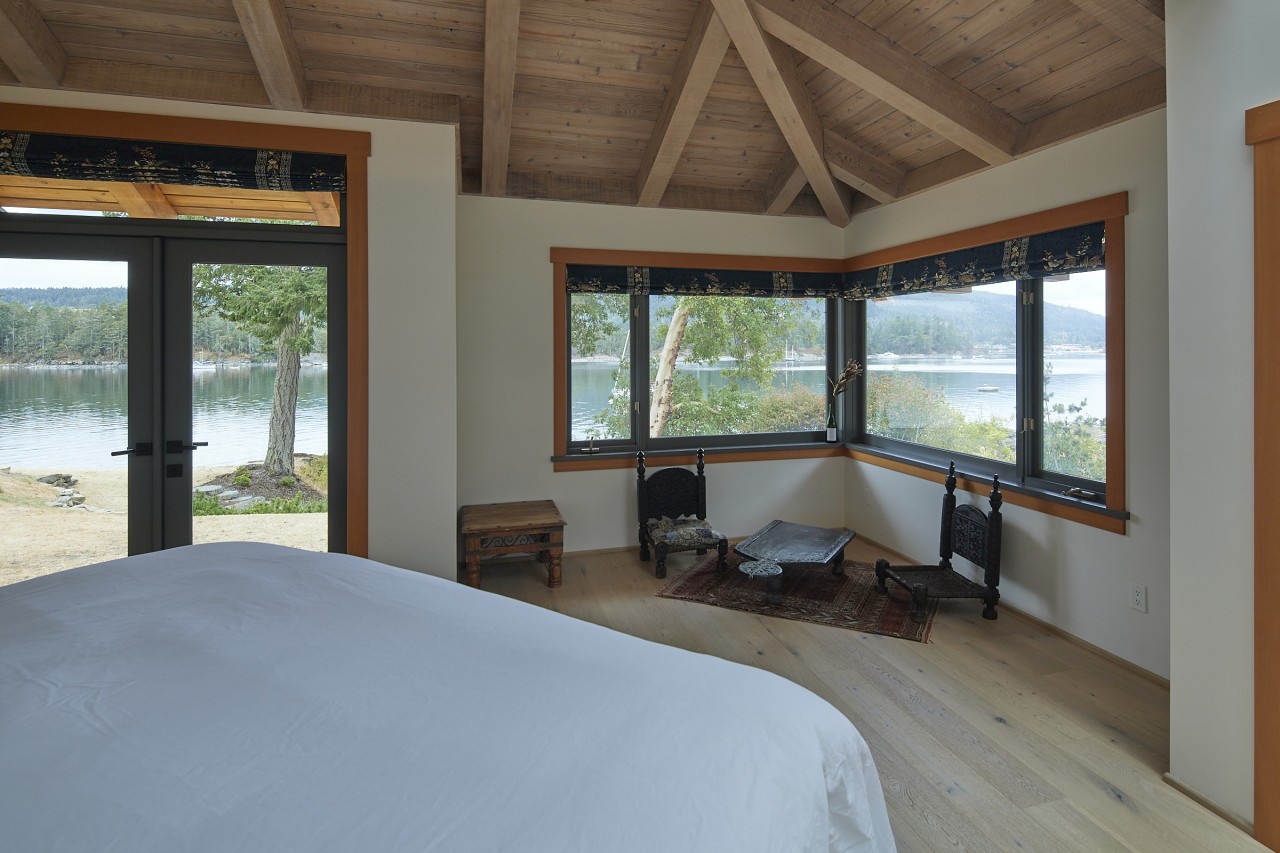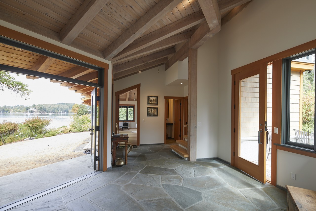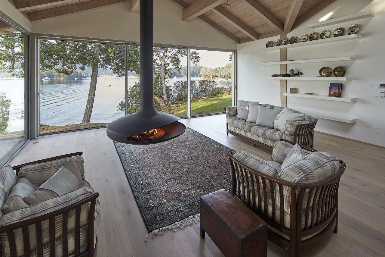 Northwest contemporary design, a post and beam home integrated with floor to ceiling sliding glass walls encompassing wide open views of the ocean and chain islands. Long Harbour house offers a Light and airy space. Long evening sunsets extend the day and at night the distant lights of Ganges across the water add a special magic.