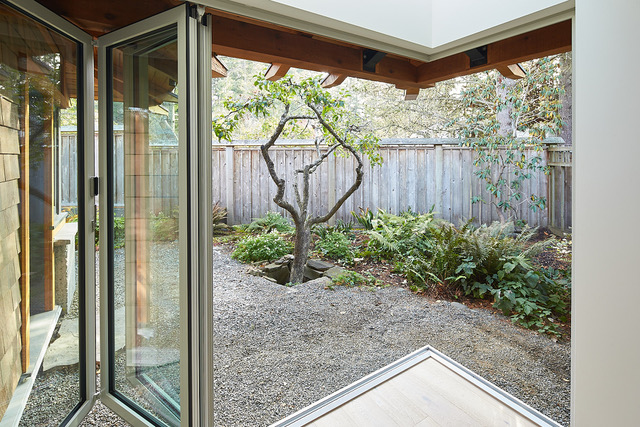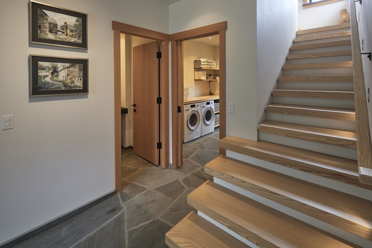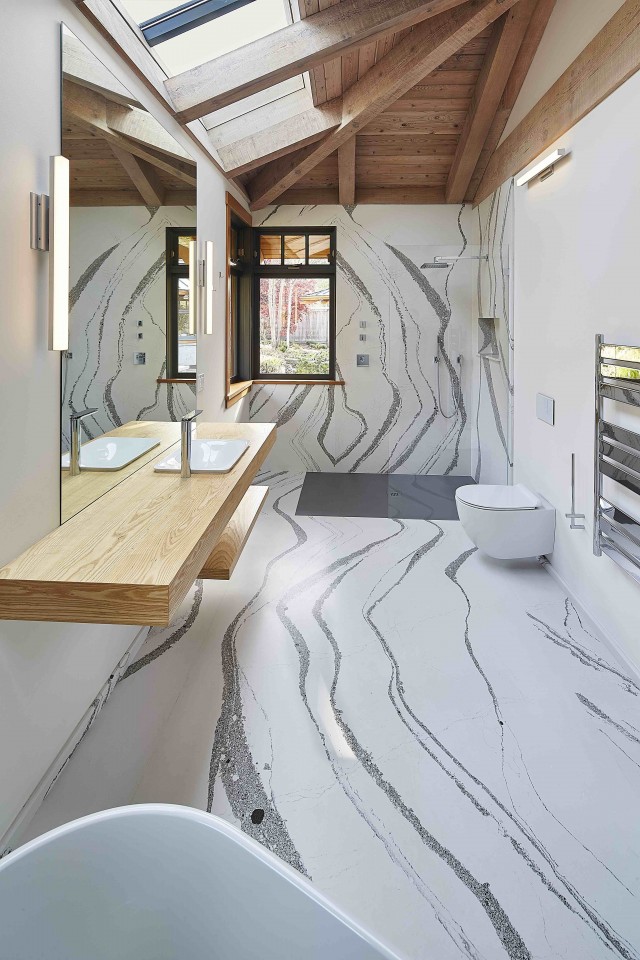 Natural stone and wood floors together with the unique floating Gyrofocus fireplace allow for the ocean to blend with the whole. Beyond a short walk from the deck takes you to a quiet sandy cove.