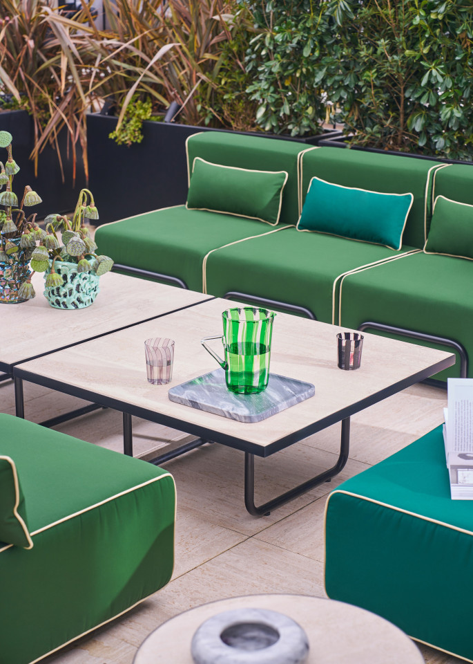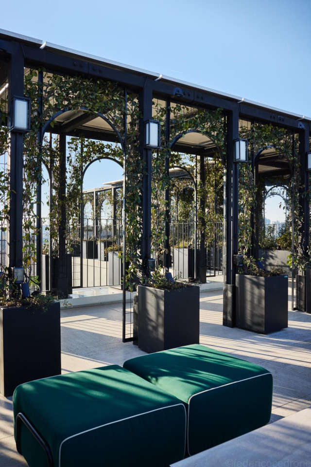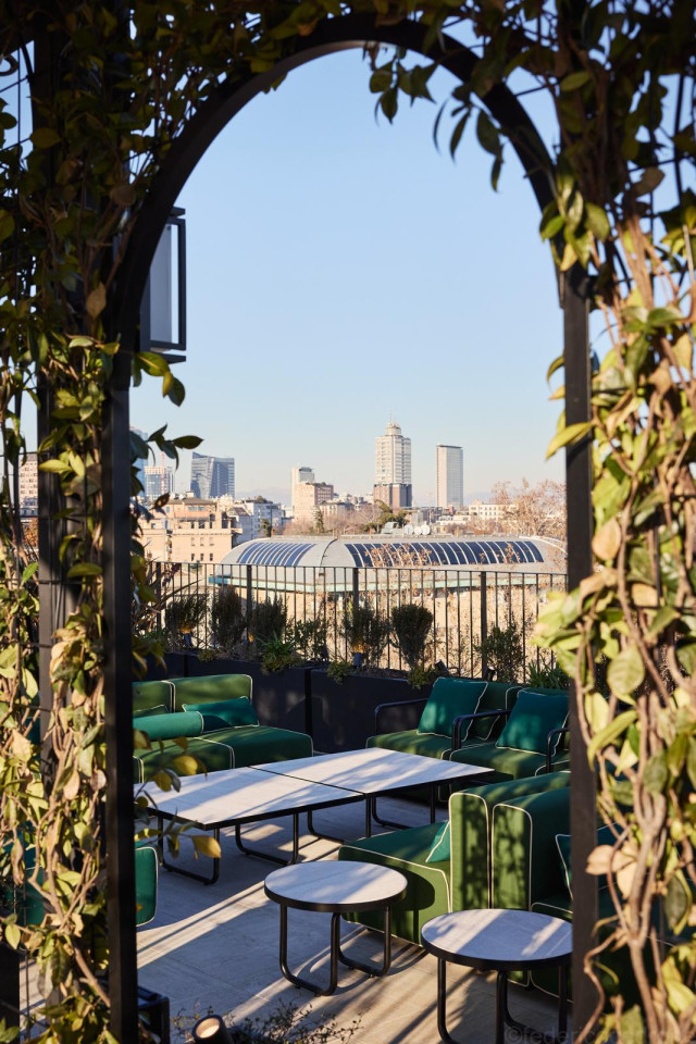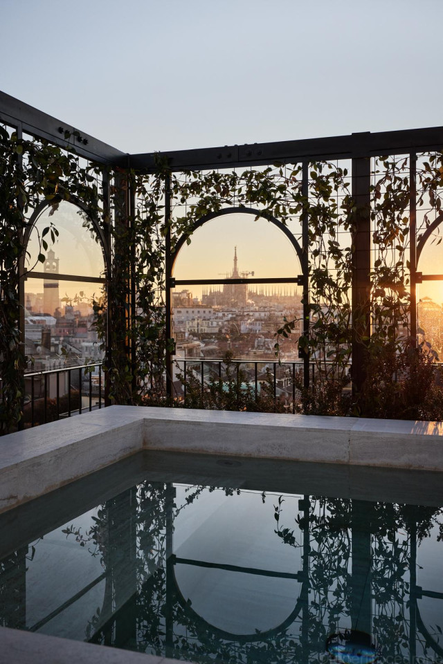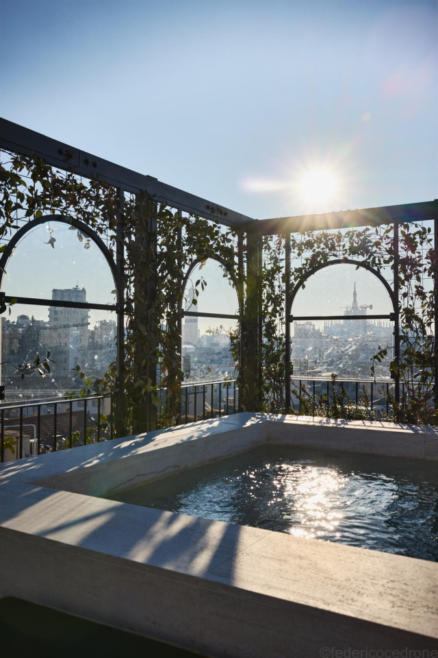 The rooftop terrace is a crown jewel of this location. Framed by wrought-iron archways draped in greenery, it offers panoramic views over the Milanese skyline. This space is set up with modular green seating, designer furniture, and an elegant, narrow pool that reflects the sunset and city lights, creating a dreamlike stage for golden hour captures and evening events. The rooftop flows seamlessly between day and night atmospheres, allowing productions to shift from sunlit editorial shots to moody, twilight scenes. Arched corridors, architectural details, and lush vertical gardens add timeless European elegance to the urban setting, making it equally suitable for exclusive brand activations, private dinners, or curated art installations.