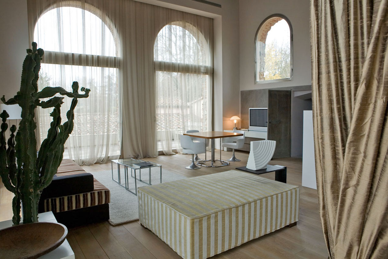 The space available for the guests, in addition to the 11 loft-style studios, includes the extensive garden with a charming, sandstone swimming pool, and the splendid lounge with its stone vaults and large windows overlooking the garden.