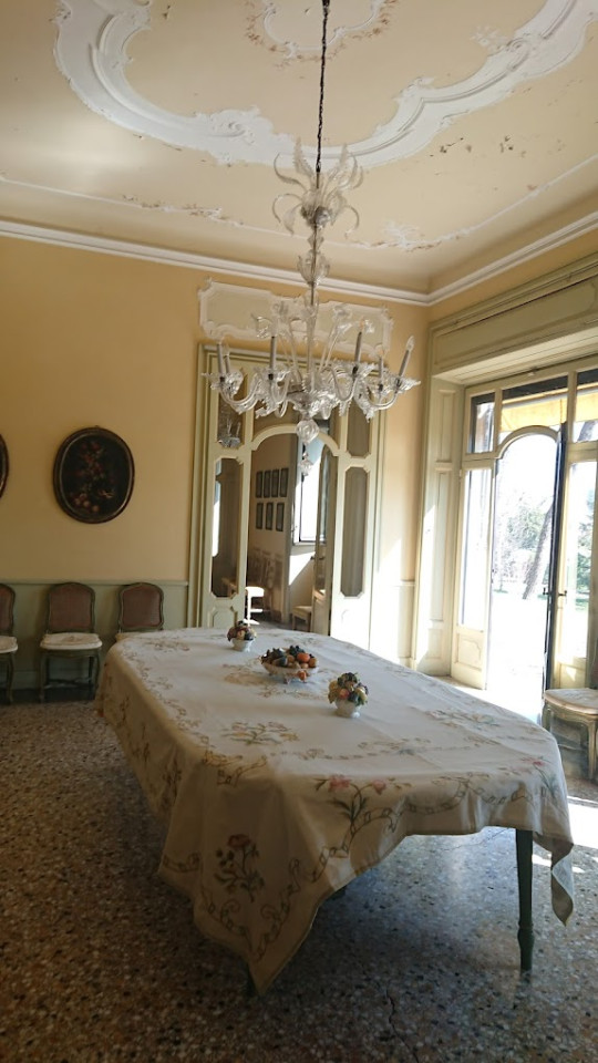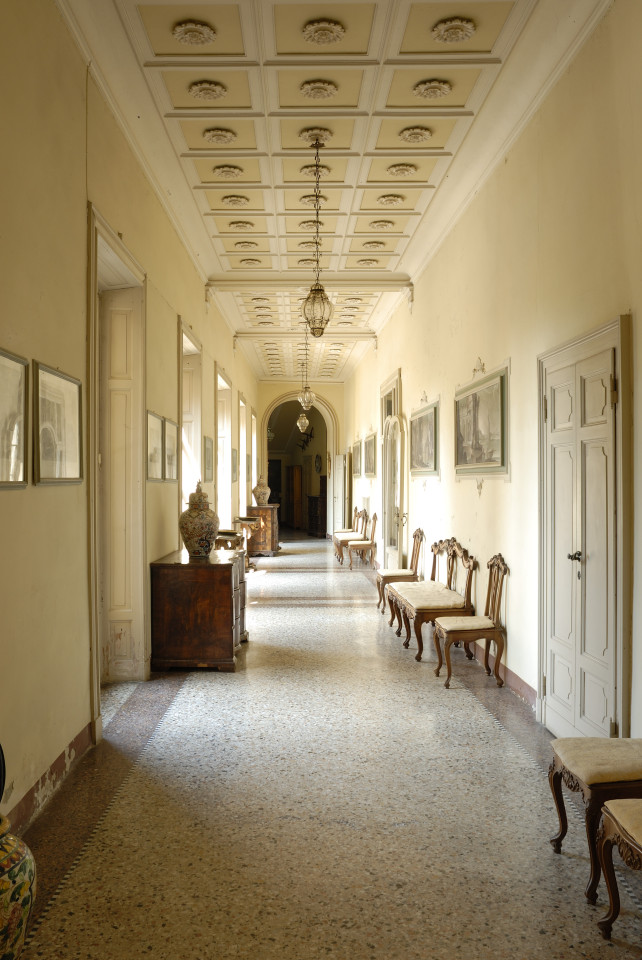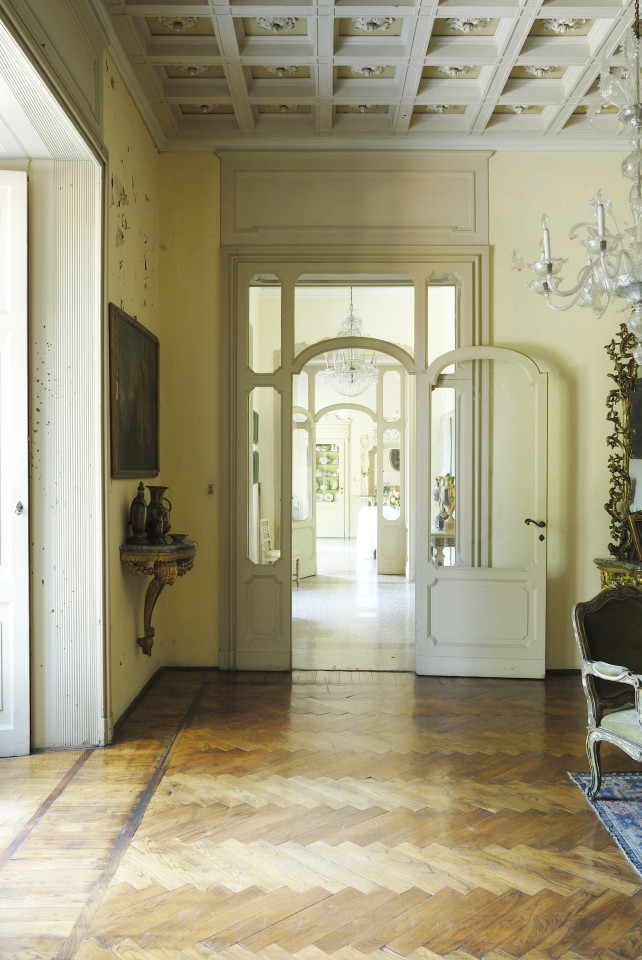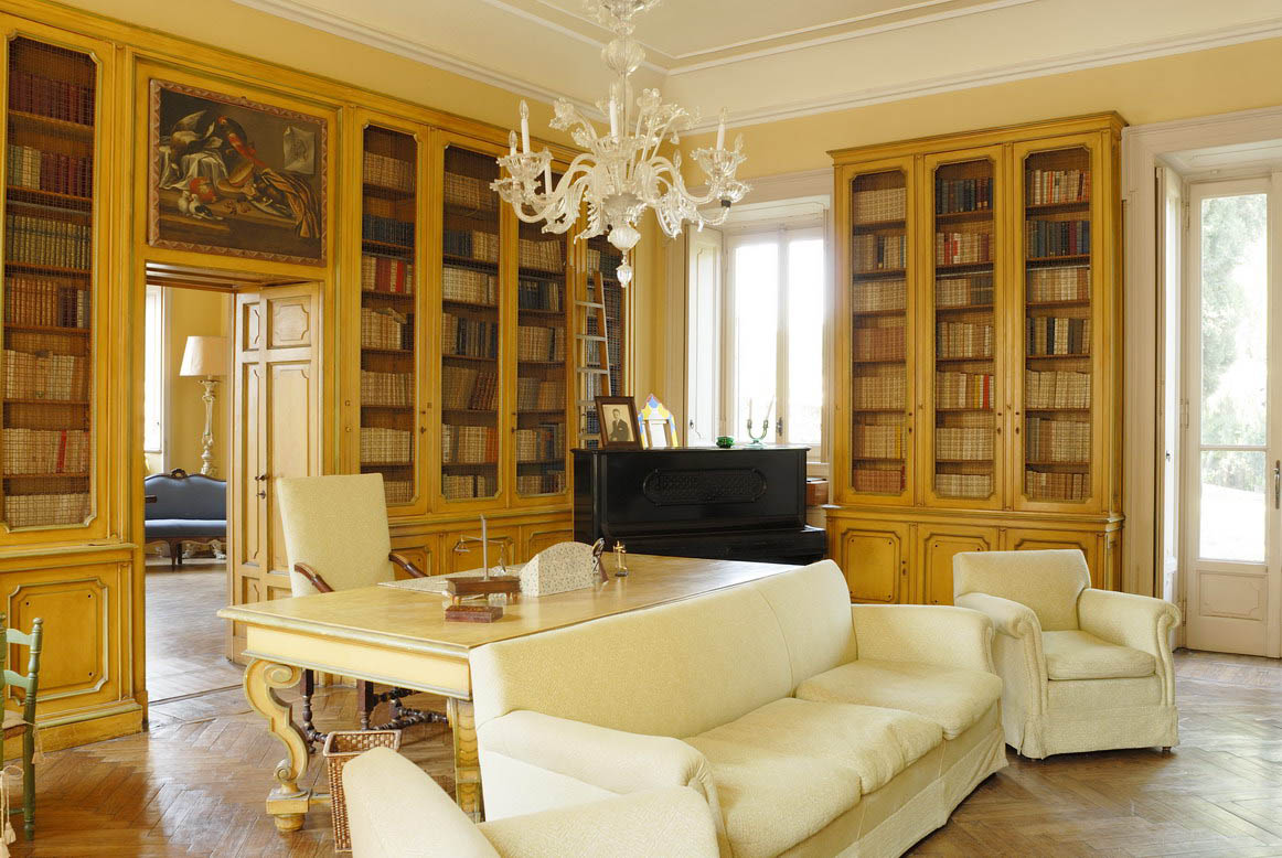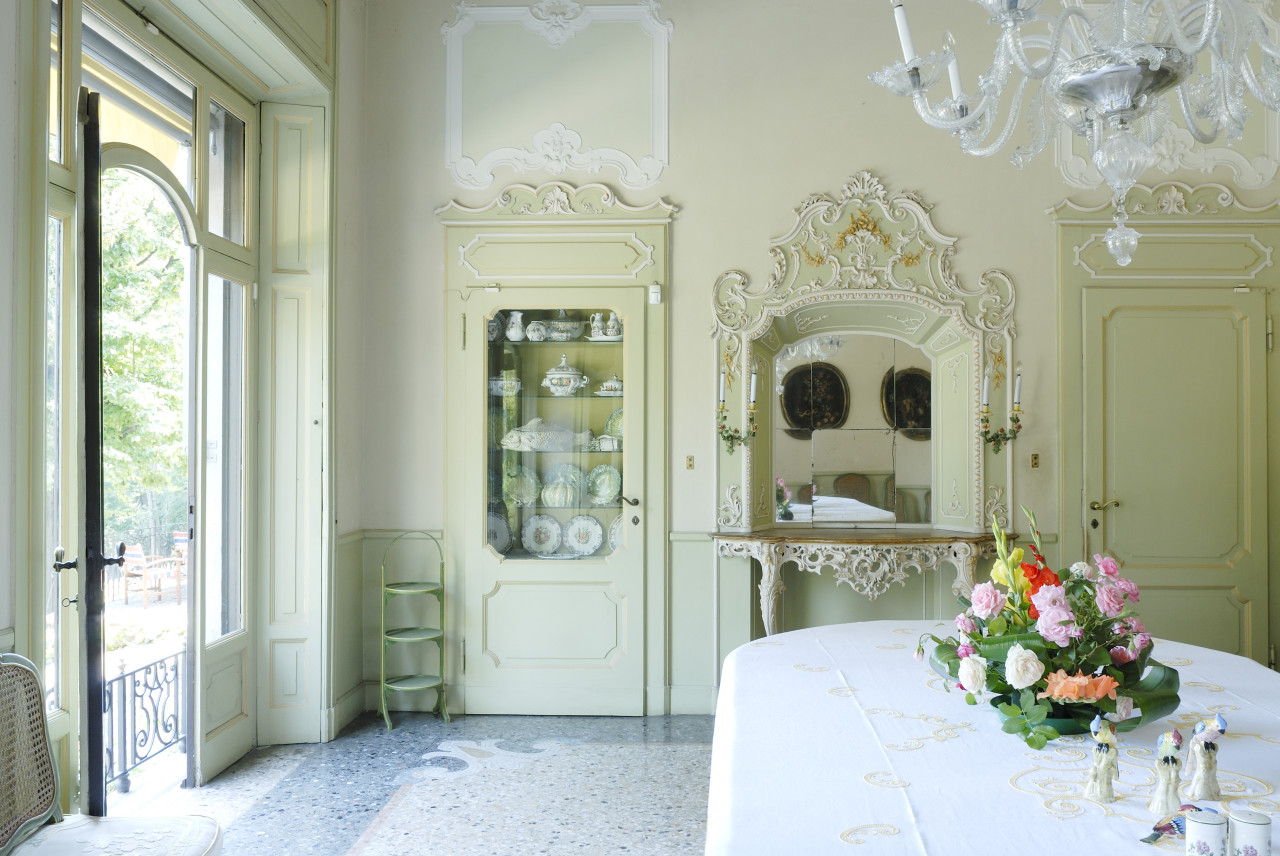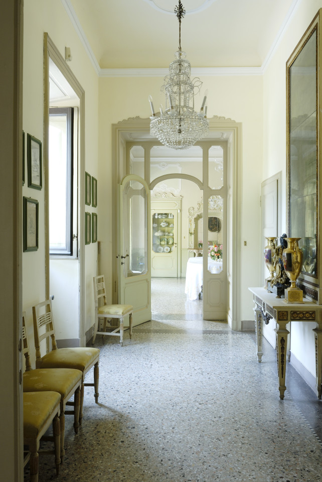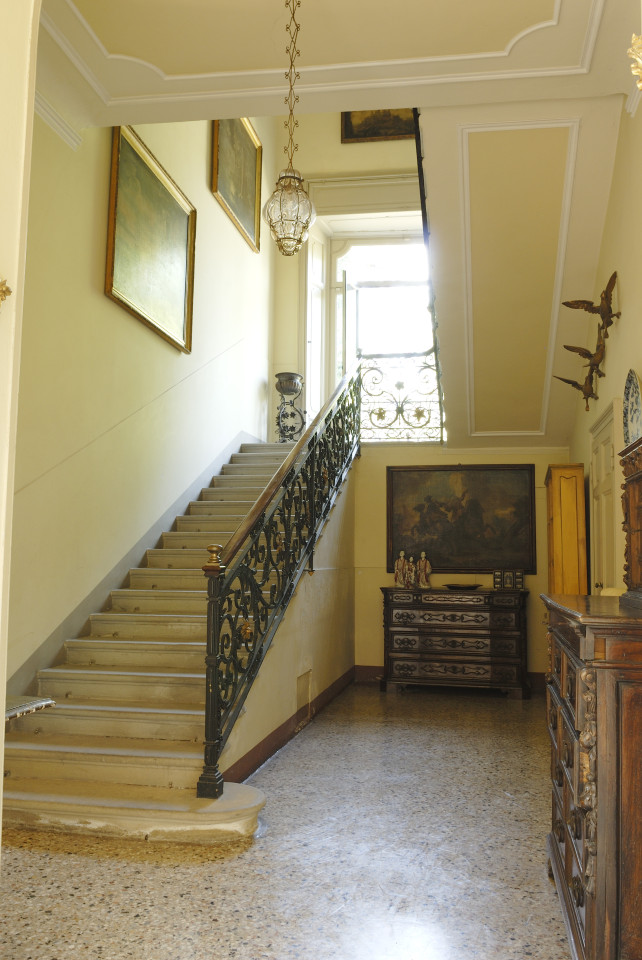 As you enter the villa, you are welcomed into a world of luminous interiors and artistic heritage. The high ceilings are adorned with original stucco detailing and hand-painted frescoes, creating a regal atmosphere throughout. Spacious salons and intimate sitting rooms are filled with natural light that flows through tall arched windows, highlighting polished wooden floors, antique furnishings, and gilded mirrors. Velvet-upholstered chairs and majestic crystal chandeliers add sophistication and warmth, capturing the essence of Italian luxury.