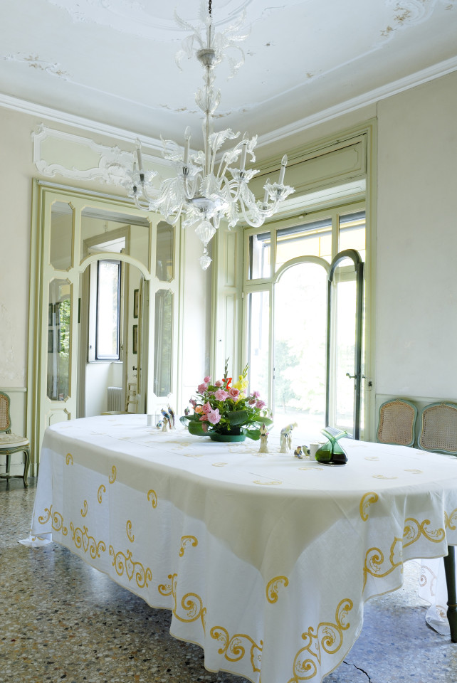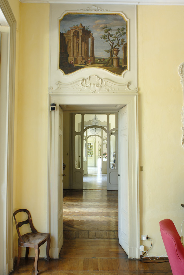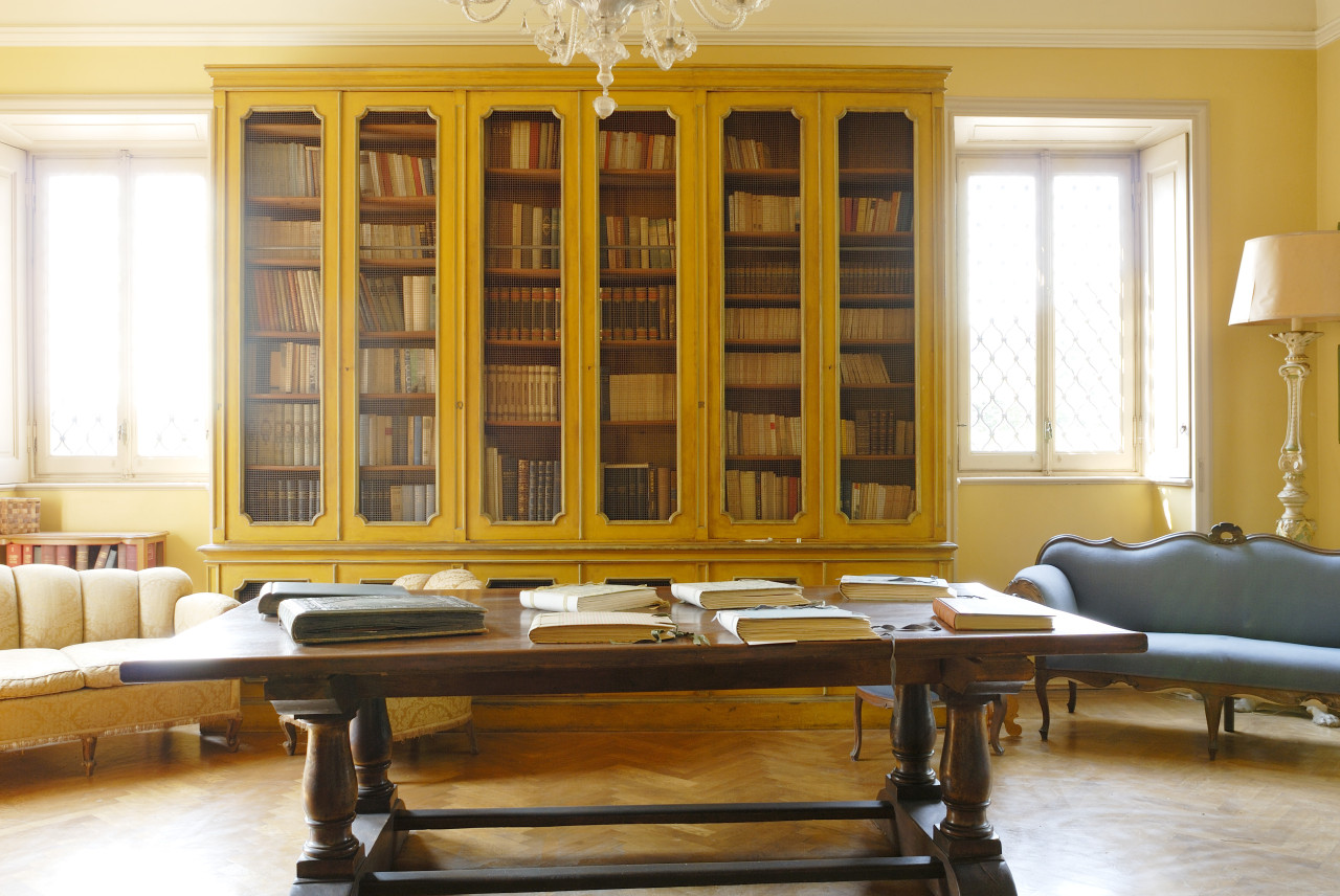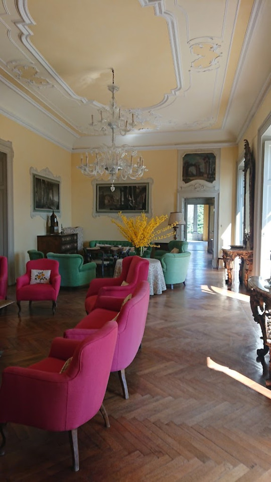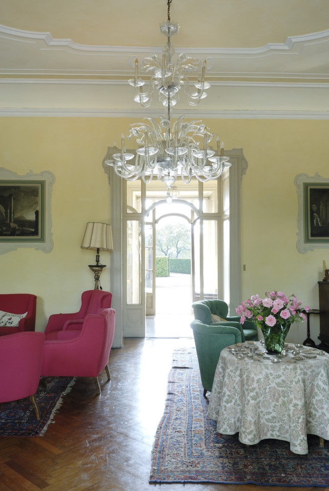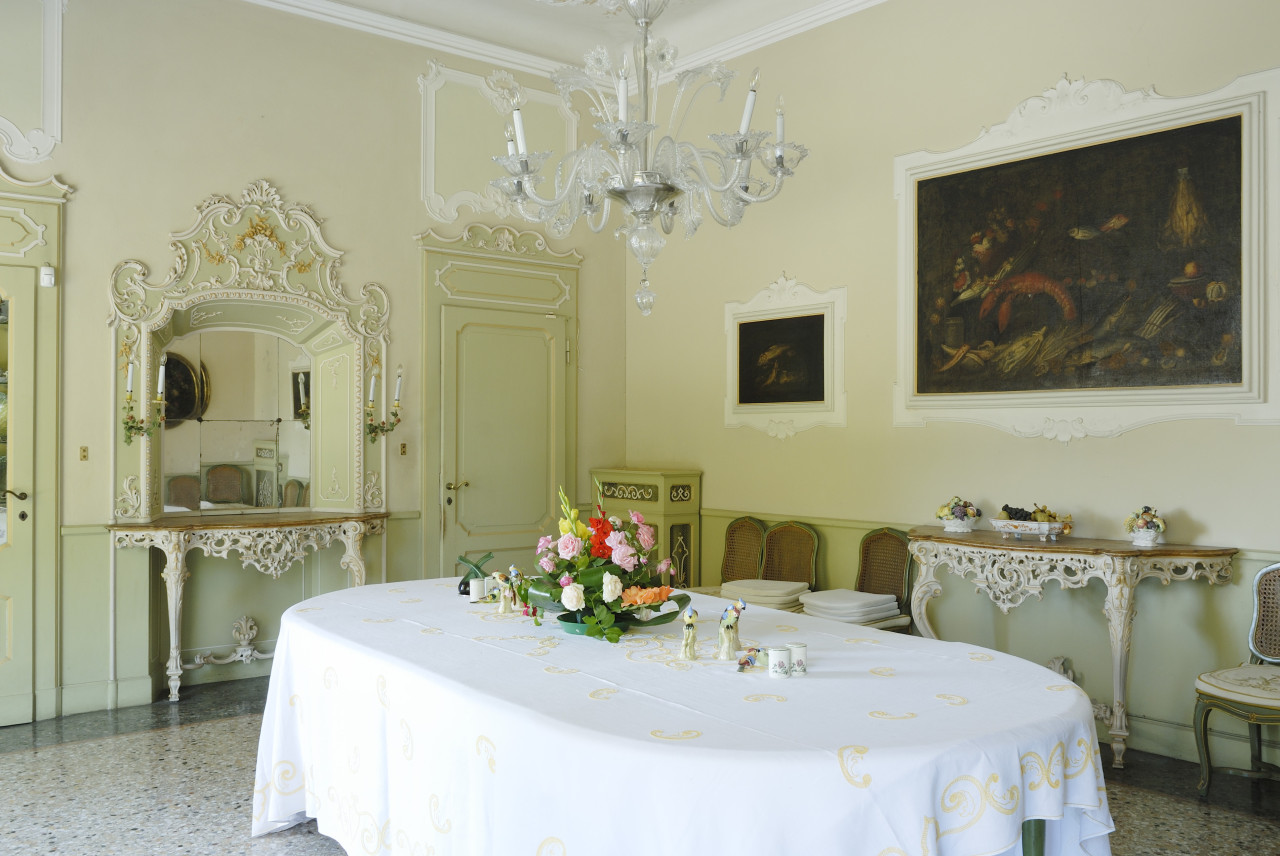 As you enter the villa, you are welcomed into a world of luminous interiors and artistic heritage. The high ceilings are adorned with original stucco detailing and hand-painted frescoes, creating a regal atmosphere throughout. Spacious salons and intimate sitting rooms are filled with natural light that flows through tall arched windows, highlighting polished wooden floors, antique furnishings, and gilded mirrors. Velvet-upholstered chairs and majestic crystal chandeliers add sophistication and warmth, capturing the essence of Italian luxury.