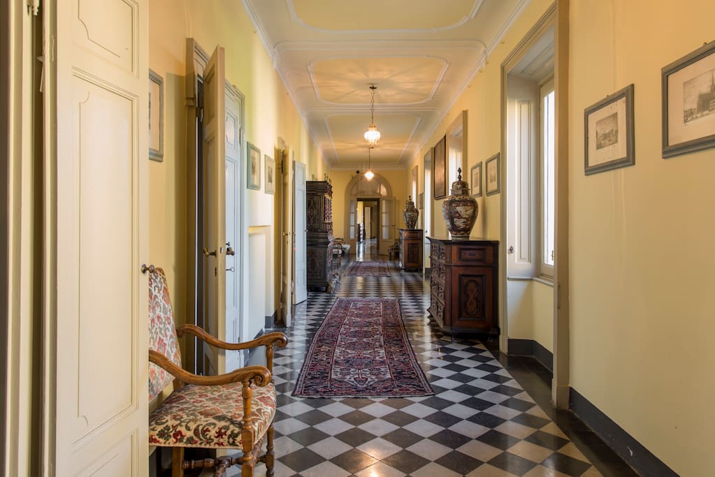 Connecting the spaces are striking corridors and staircases laid in checkerboard marble, framed by ornate wrought iron railings and illuminated by cascading chandeliers. Each passage offers a visual journey through authentic architectural detail, including decorative plaster medallions, arched doorways, and curated artwork that enhances the villa’s story.
