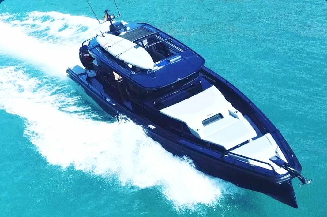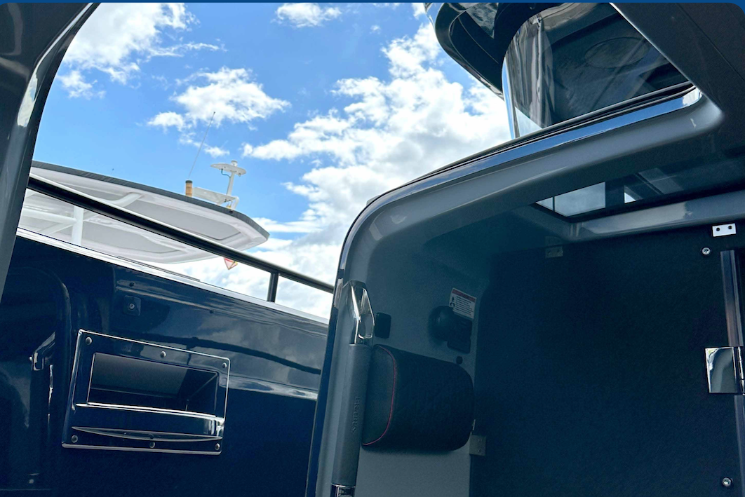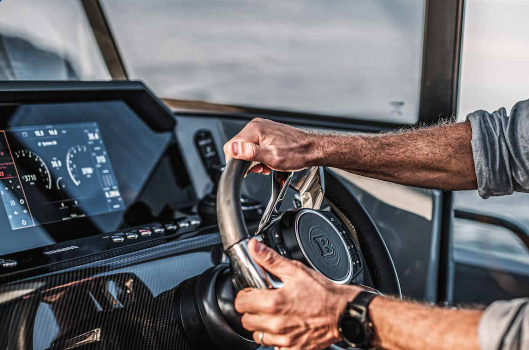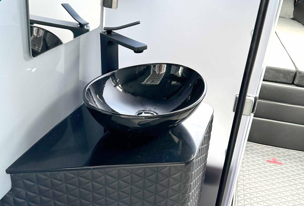 Within, the atmosphere is distinctly modernist and meticulously maintained. Interiors reveal a minimalist palette—matte and glossy contrasts, sleek cabinetry, and enveloping soft furnishings—anchored by expansive windows capturing light and horizon. Key touchpoints include a streamlined helm with a reflective dashboard, a striking black sink in a pared-back bathroom, and a restful bedroom furnished in textured bedding. Spaces transition seamlessly from privacy to openness, ideal for shoots, curated events, or immersive brand storytelling on a tranquil yet ever-dramatic marine stage.
