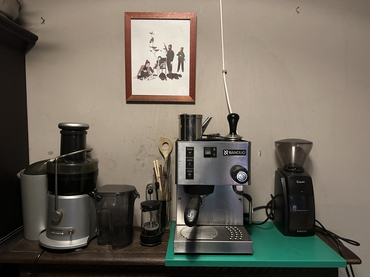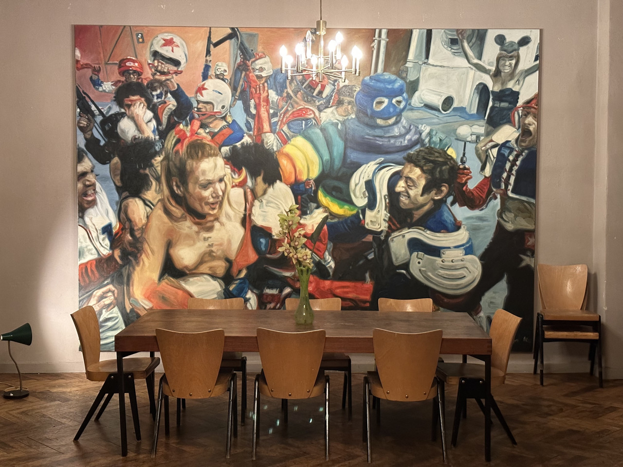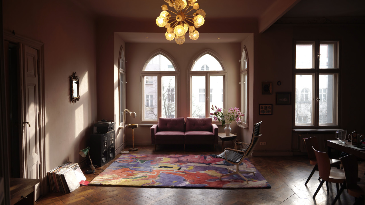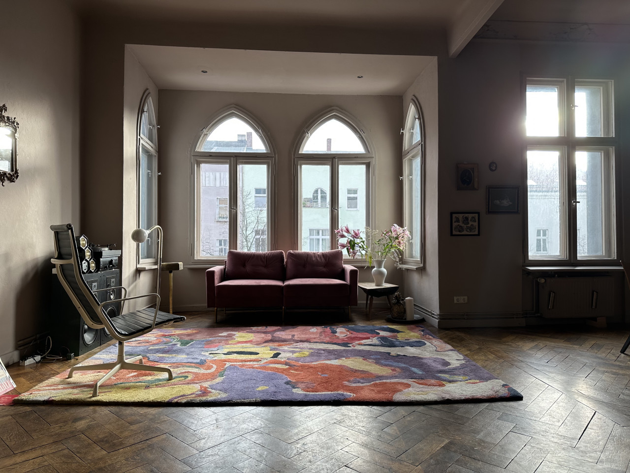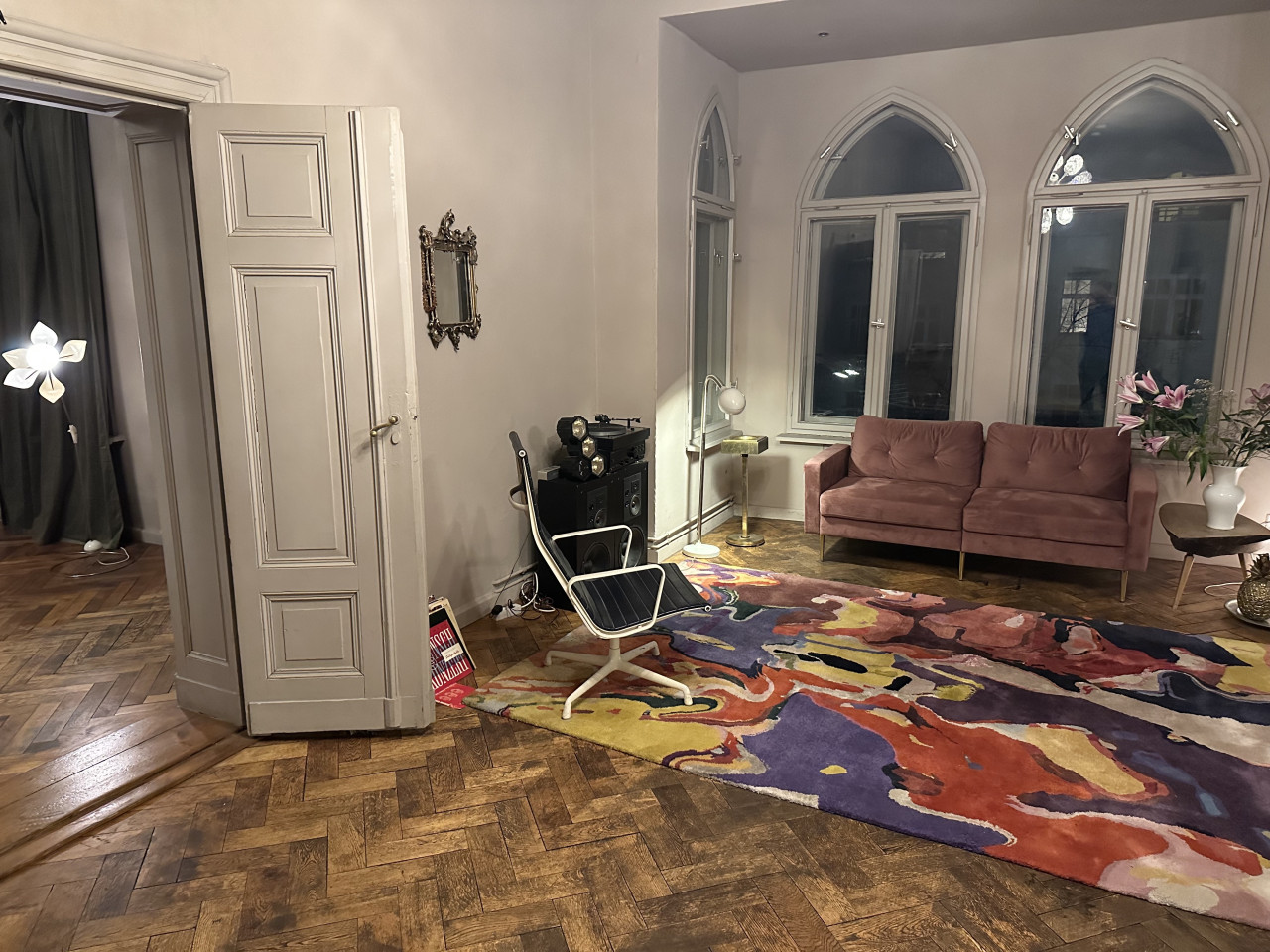 Experience the perfect blend of comfort and style with this impeccably designed home that caters to both relaxation and artistic flair. The residence features several elegant living areas, each styled with a unique ambiance. From the plush velvet sofa and vintage audio equipment beneath grand arched windows to a serenely chaotic dining room, underscored by a large, vivid painting and surrounded by rich wooden furniture and an ornate chandelier, every room tells a story. The drama and intensity of the interiors are balanced by peaceful, soft color palettes and soothing natural light, creating a truly serene living environment.