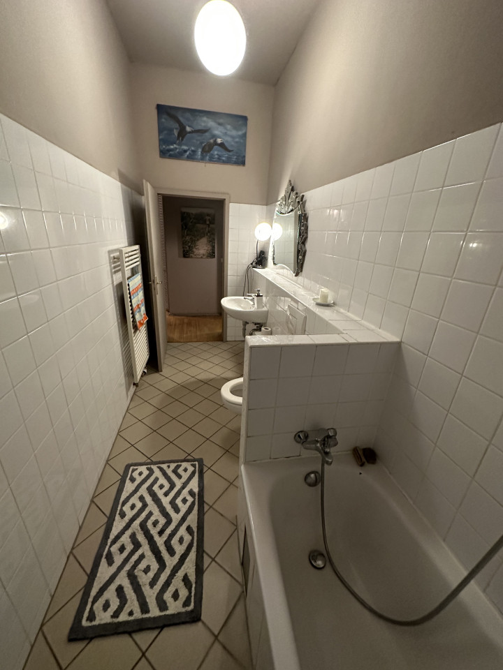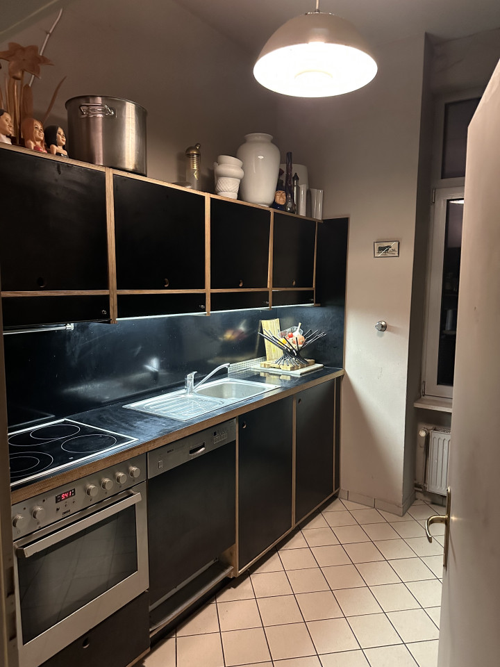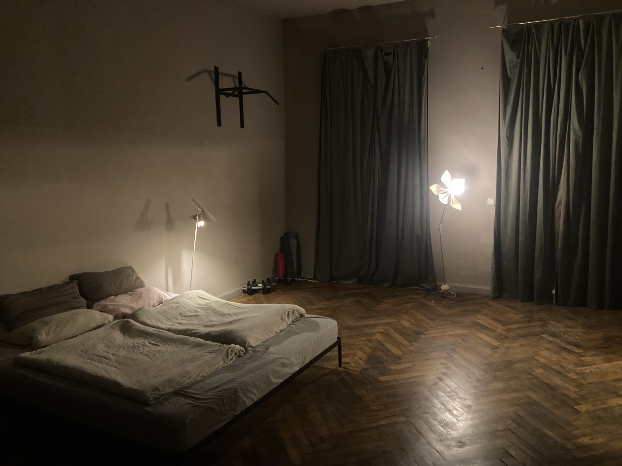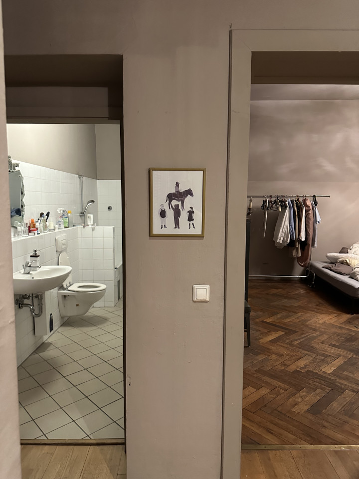 The bedrooms offer a retreat into personal solace with moody, dimly lit atmospheres, where simple yet stylish beds and unusual lamps converge with heavy curtains to craft spaces ideal for rest and contemplation. The kitchen and bathrooms seamlessly integrate modern convenience with elegance; featuring modern appliances set against black countertops and surrounded by soft, ambient lighting. The spacious white-tiled bathroom with decorative mirrors and charming accents adds a touch of luxury to everyday routines. This home not only caters to practical living with its thoughtful layout and sophisticated facilities but also nurtures the soul with its delightful interior design details.