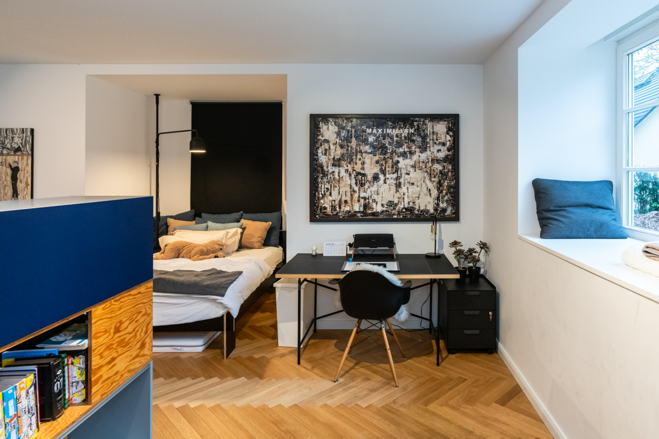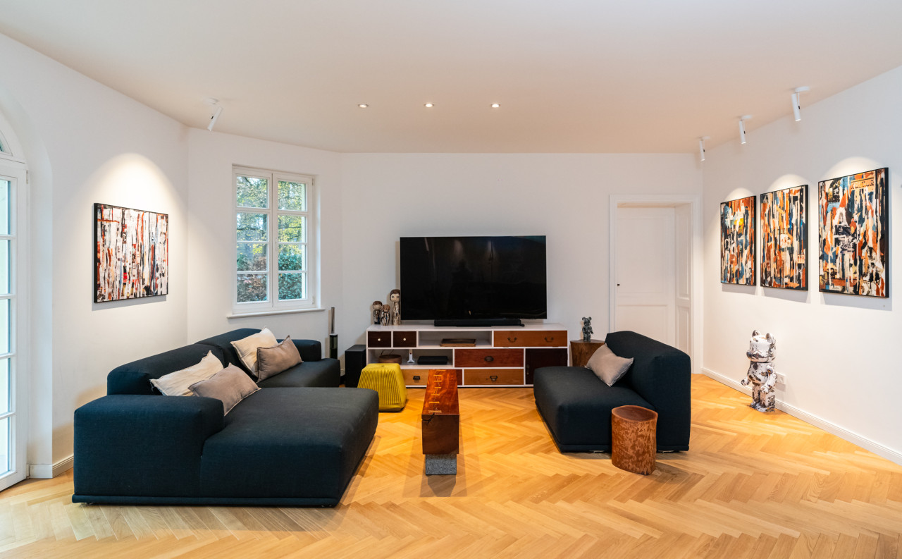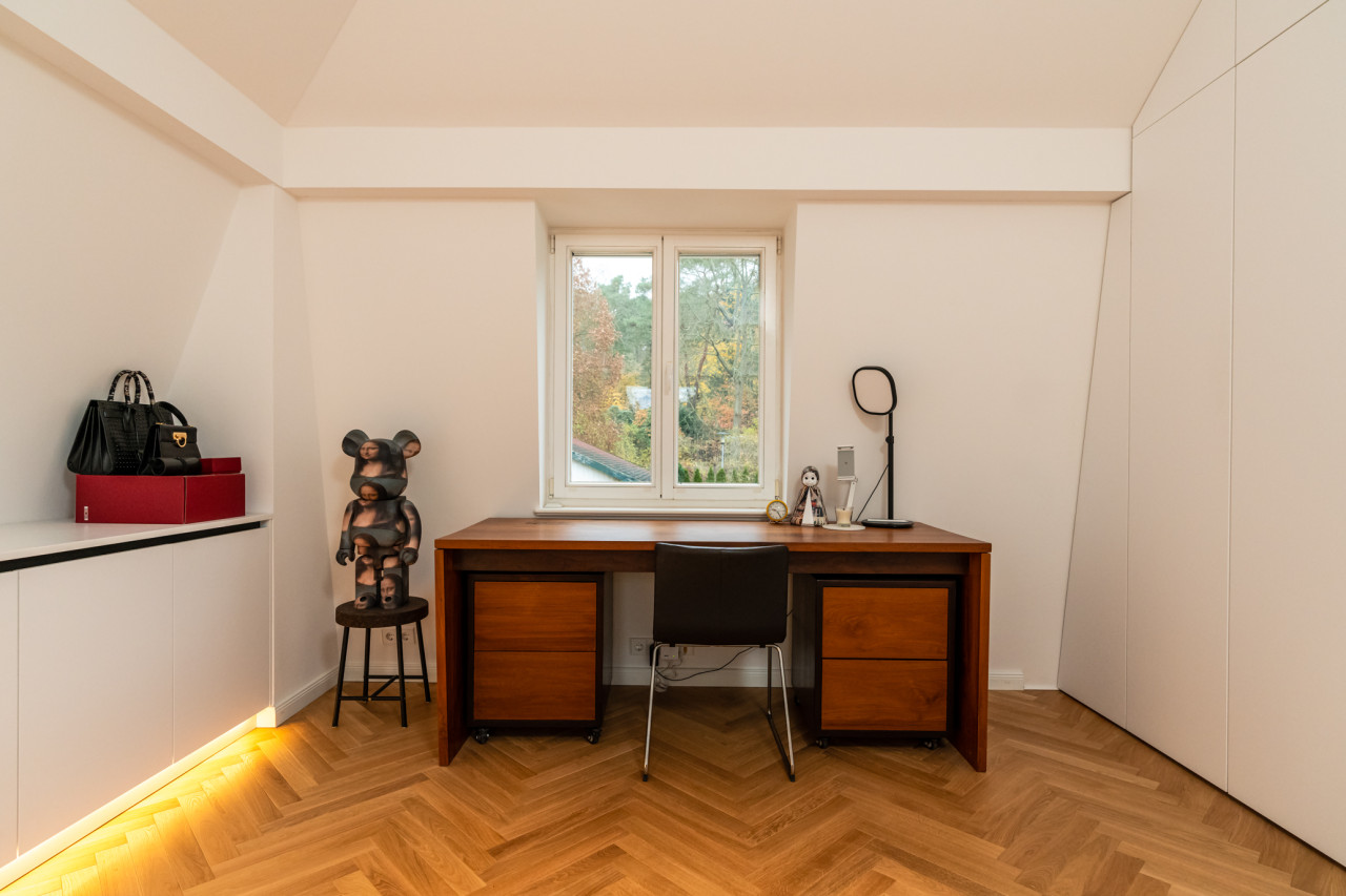 Furthermore, two home offices, three children's rooms and three bathrooms, including a sauna, a bathtub, a big shower and a guest wc. Two of the toilets are equipped with electric toilets from Japan with seat heating, hairdryer and bidet. This house is like a bed of roses...