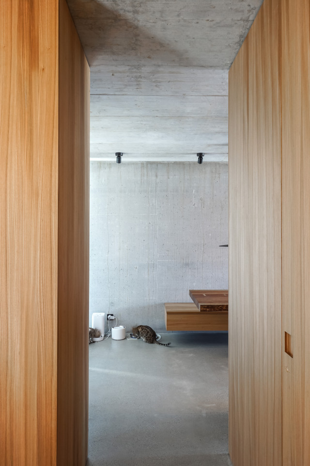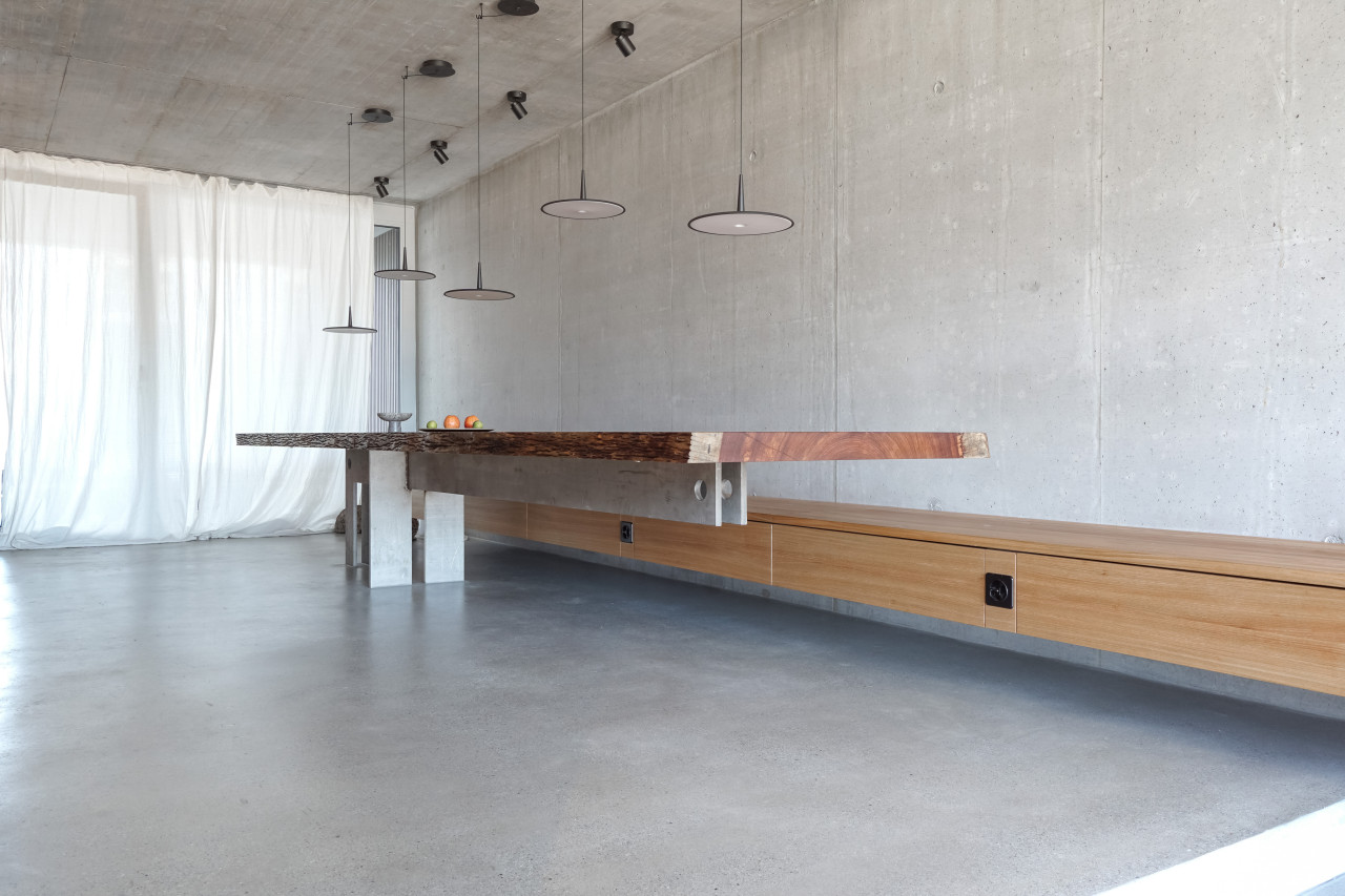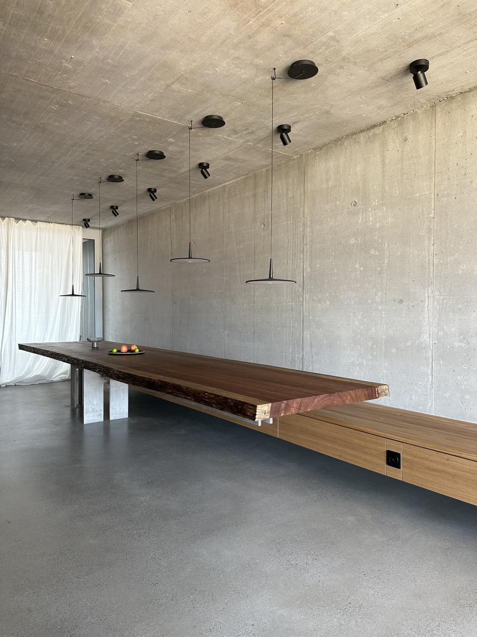 This hillside townhouse designed by Architekturstätte is perfect as an impressive photo and film location. The modern, minimalist design with clean lines, raw concrete and wood gives the house a contemporary and aesthetically pleasing backdrop. The architectural details, such as the structure of the concrete and the generous glass fronts, provide visually appealing elements for various scenes mirroring the impressive swiss alps and forests between which the house is located. The flexible interiors with open-plan layouts allow for versatile rotation options, while the well thought-out furnishings in a minimalist style open up the space for a wide variety of settings. The generous windows also allow for natural lighting, which creates the perfect atmosphere for film productions. Overall, the terraced single-family house presents itself as an ideal film location that not only impresses with its architecture, but also with its versatility and visual appeal with the alps as a backdrop.