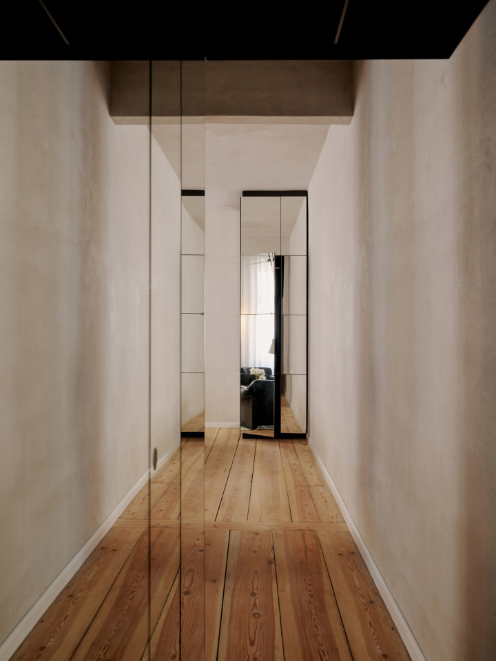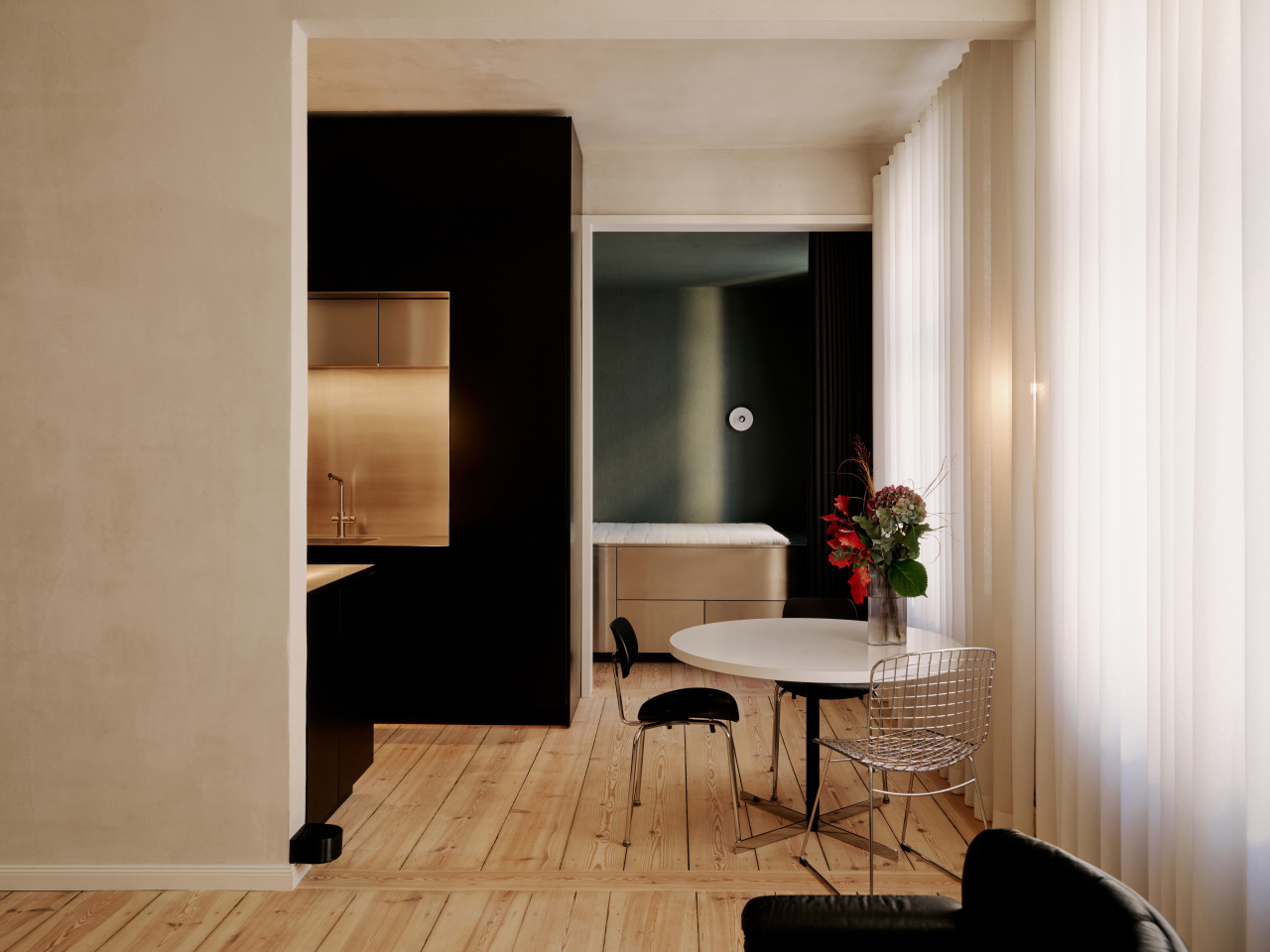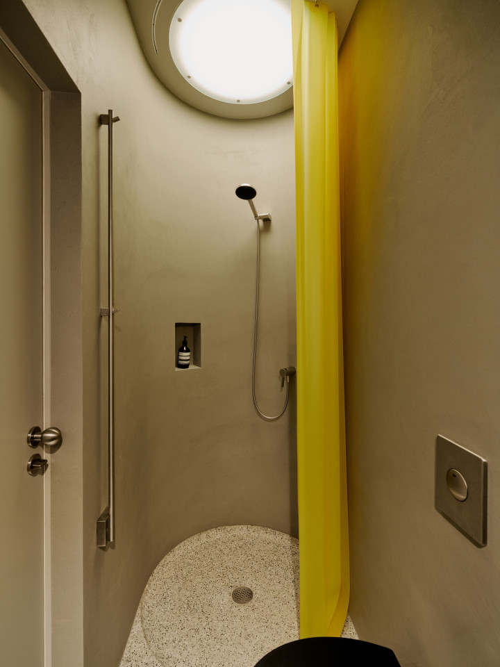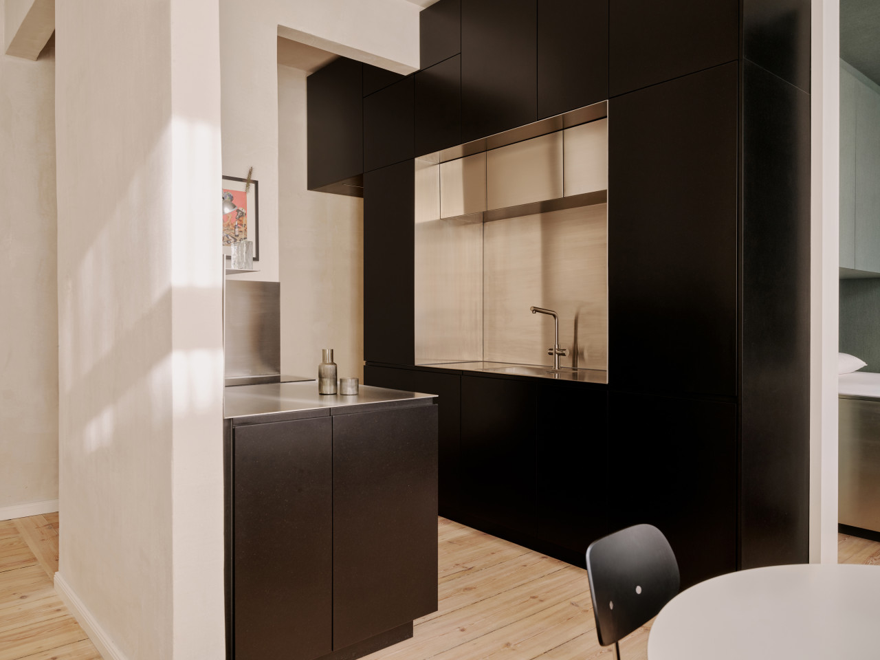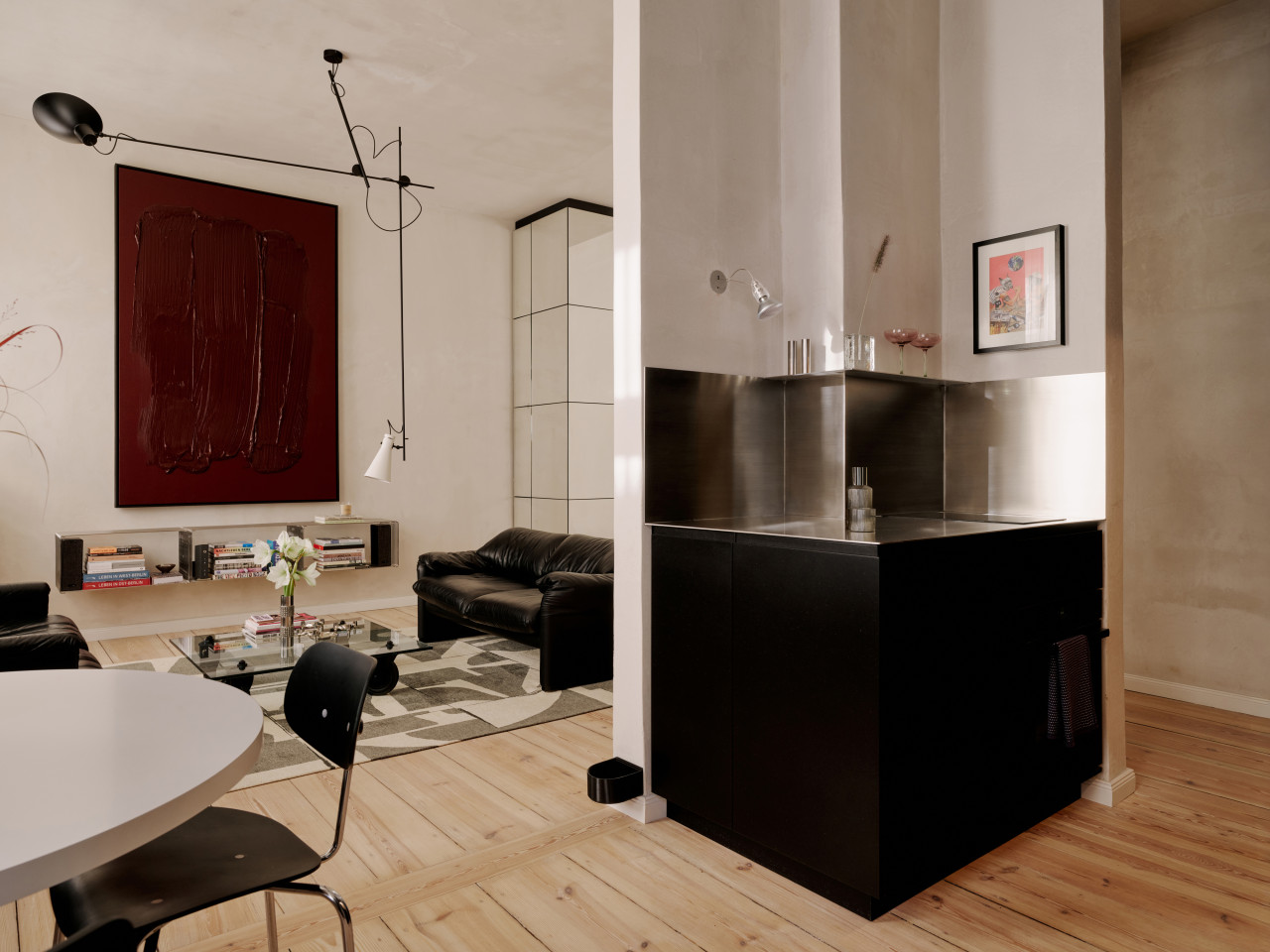 bright open plan apartment 49sqm high ceilings concrete walls modern fittings & furniture