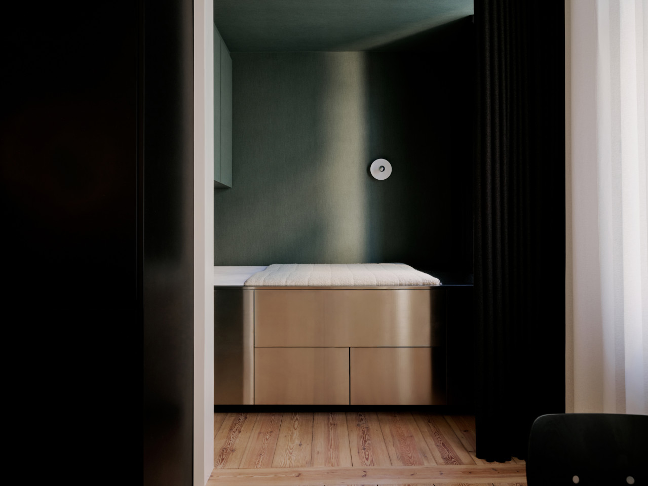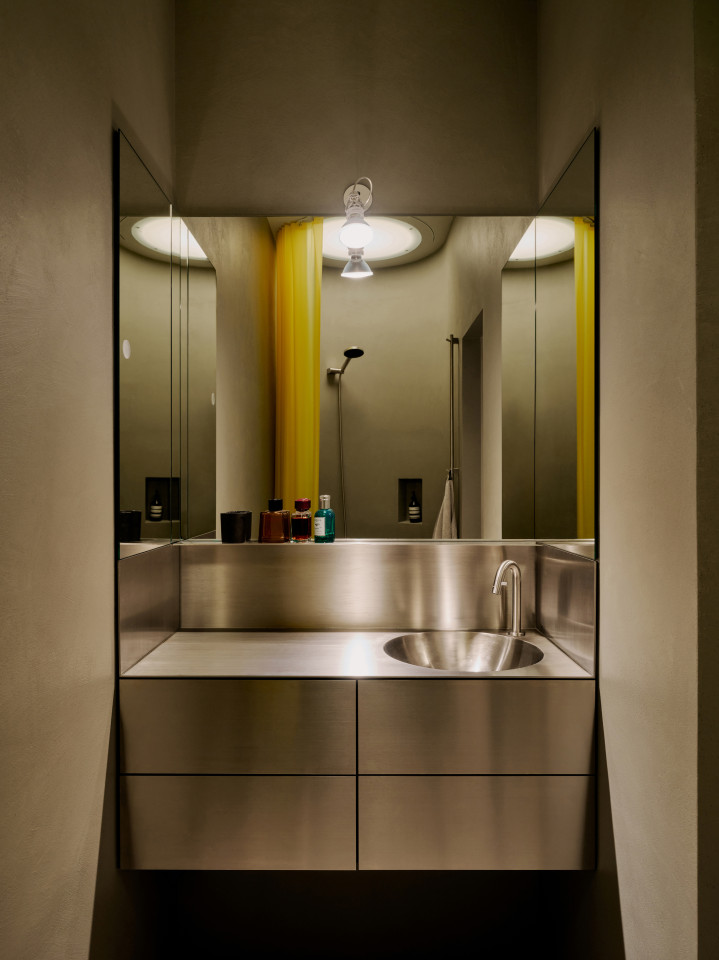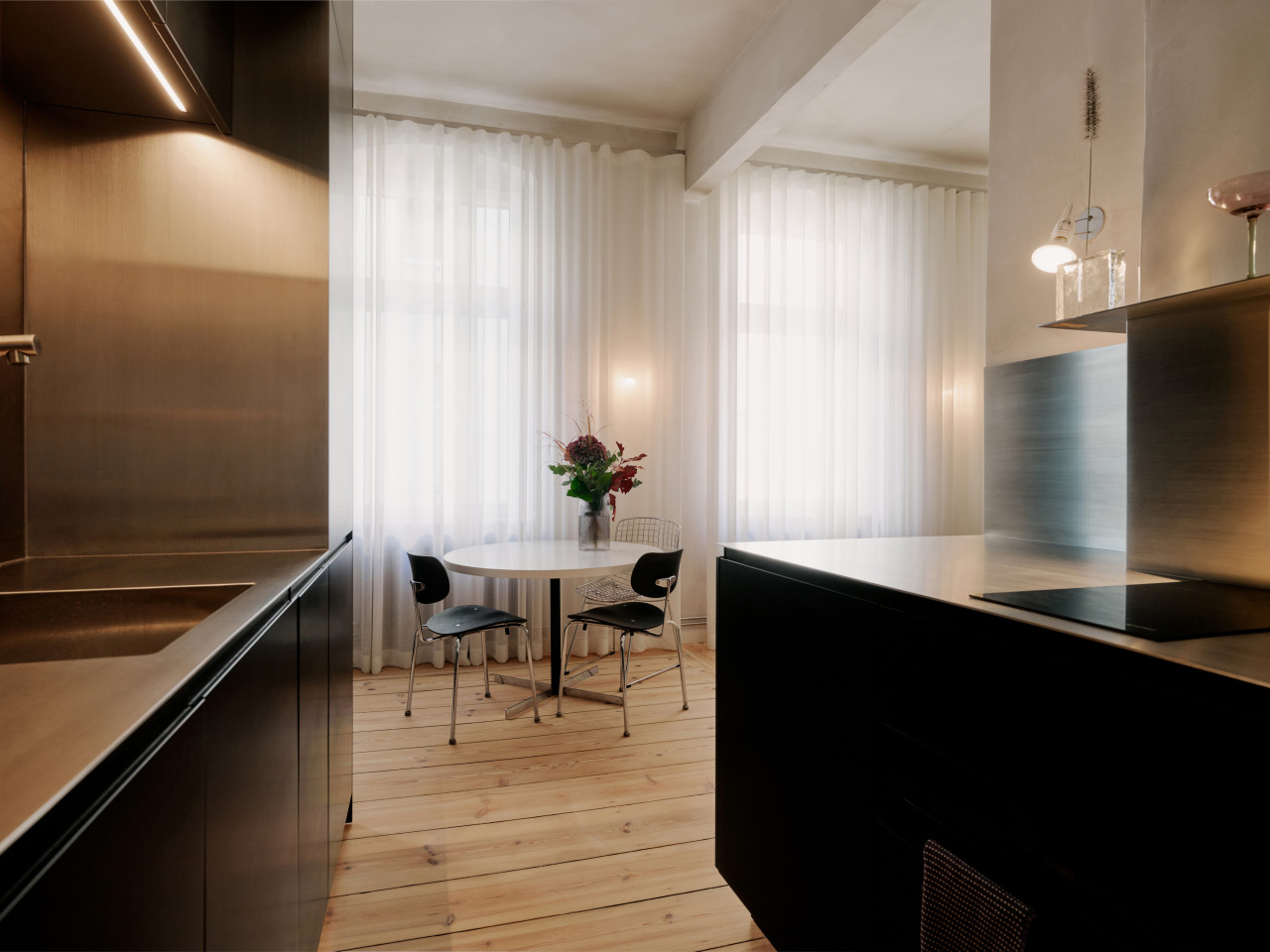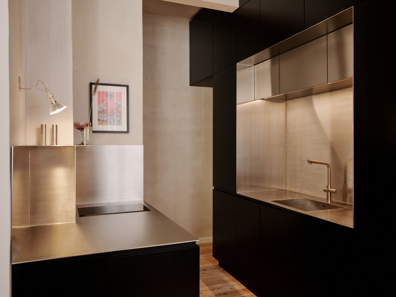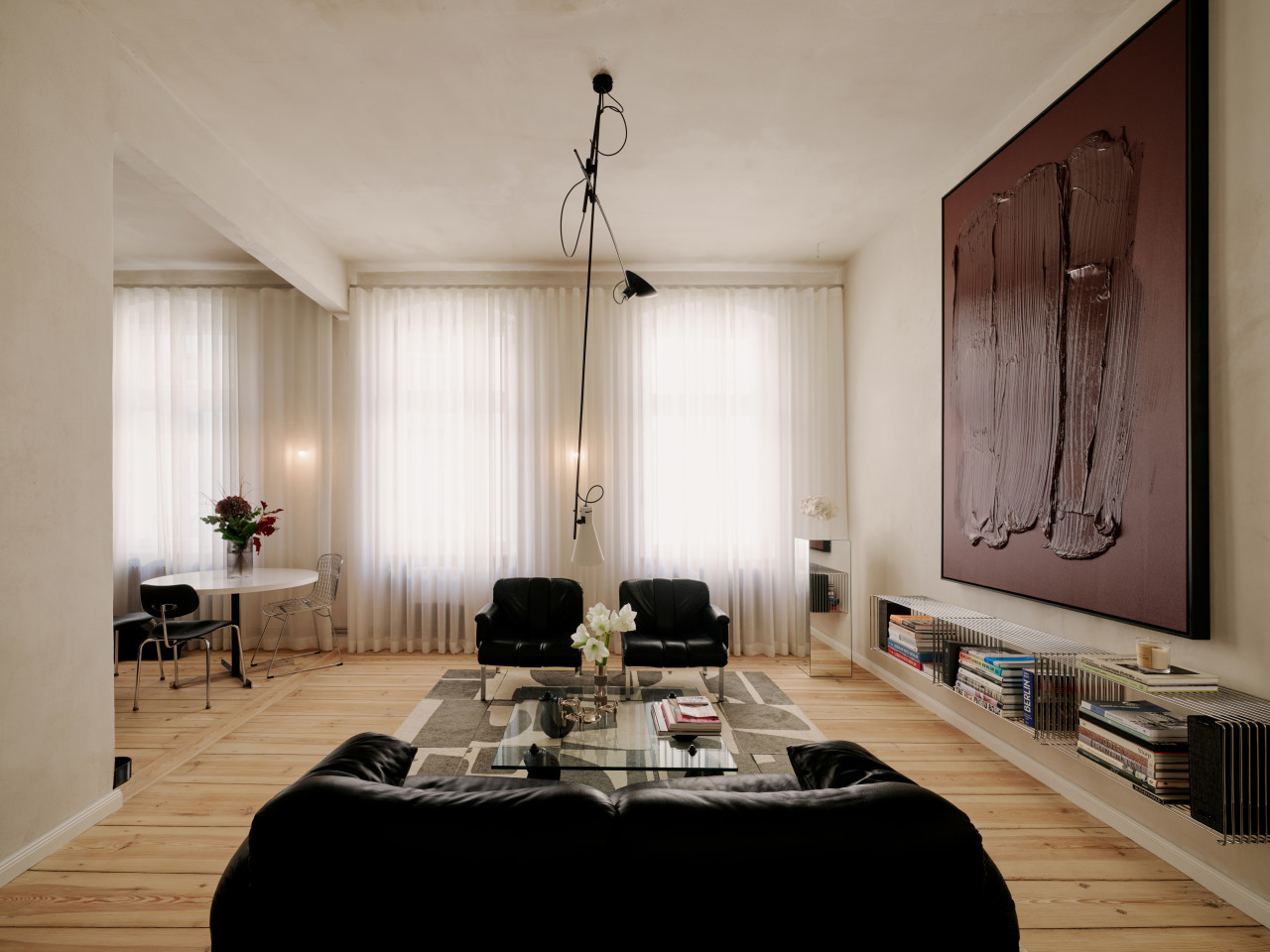 bright open plan apartment 49sqm high ceilings concrete walls modern fittings & furniture
