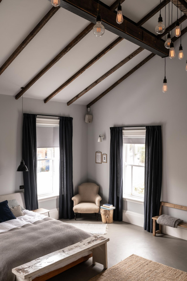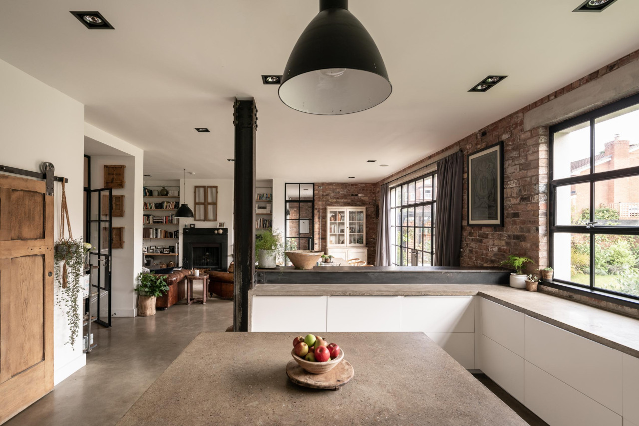The property is full of original details dating back to its Victorian era which have also been complimented by several industrial touches. Many of the rooms have exposed brick and wooden panelled walls. There are steel columns and fireplaces, concrete floors and worktops, and blue brick floors. All ceilings are 10 ft tall which give a real feeling of space and light. At the rear of the property there is a double height area which also has a balcony overlooking it. The master bedroom has a huge, vaulted ceiling with exposed beams and contains the mezzanine balcony.