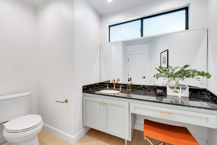 The master bathroom has a soaking tub, double sinks and glass walk in shower. The two guest bathrooms both have showers. The powder room has the original marble countertops