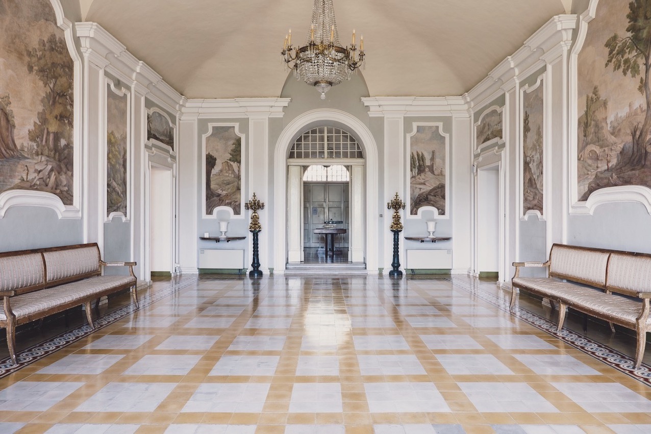 The muted tones and blushes of the frescoes on the noble floors, portraying the surrounding countryside, give a romantic richness and bucolic feel to the insides of the villa.