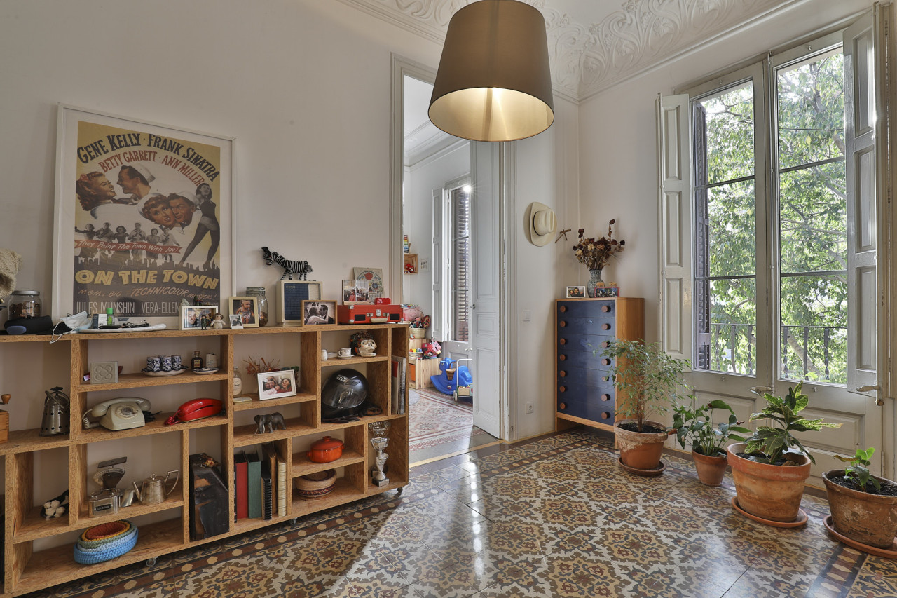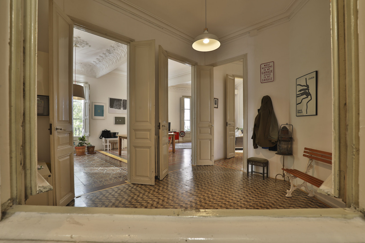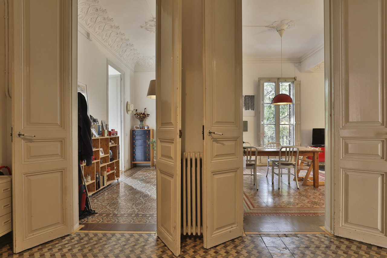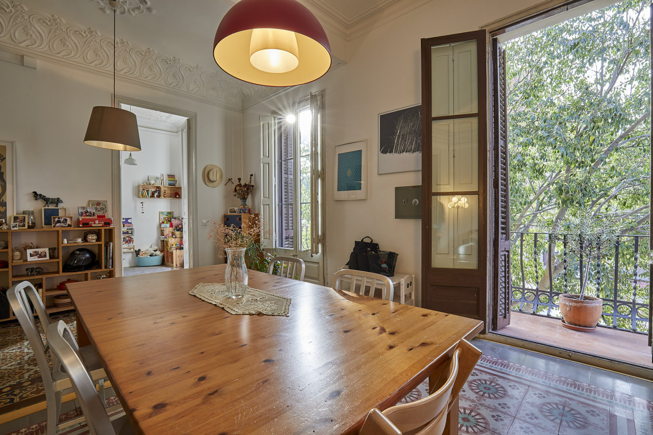 Piso Guillermo is a spacious, light-filled Eixample-style apartment in Barcelona with original hydraulic tiles, ornate ceilings and tall French doors opening onto a tree-lined balcony. The generous living and dining areas flow together, creating a large, continuous space that’s perfect for photo and film shoots needing an authentic, elegant Barcelona home.