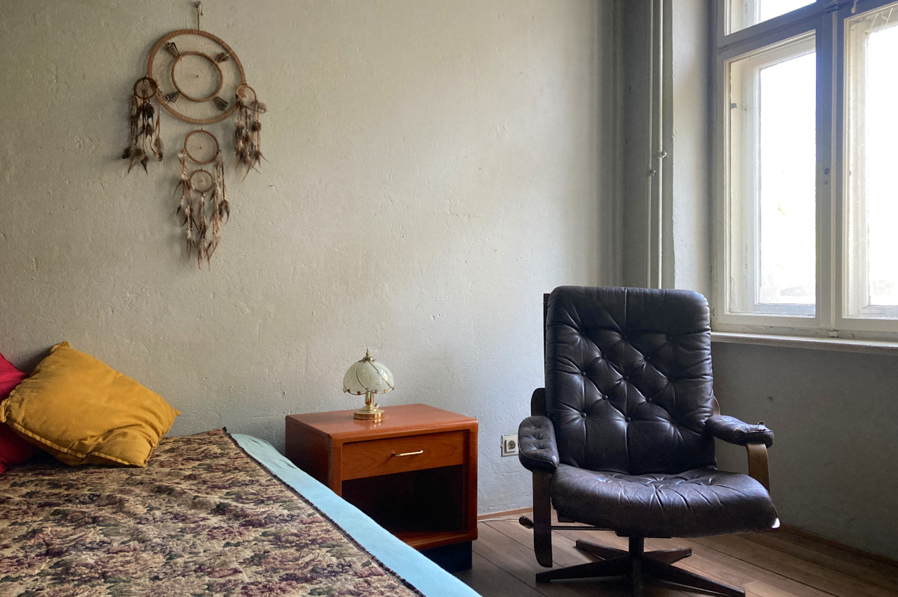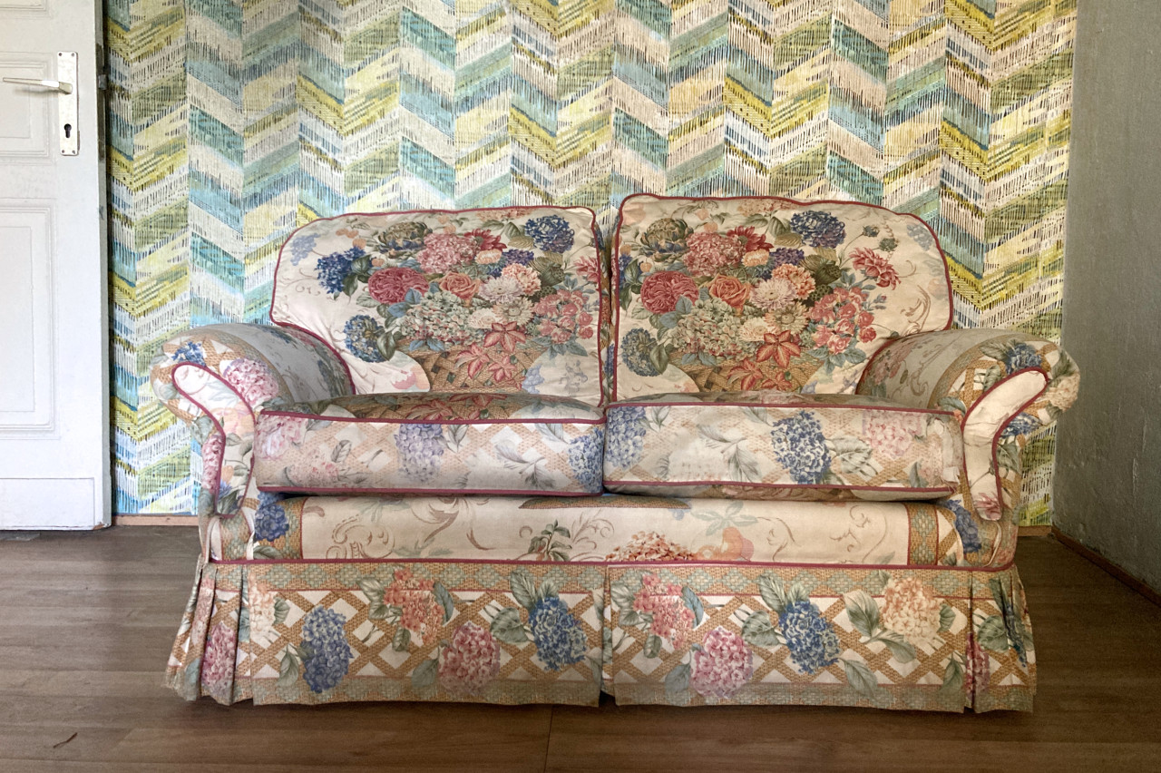 This charming bedroom combines nostalgic retro flair with a unique sense of style. The colorful yellow-green herringbone wallpaper adds vibrant accents and harmonizes in its own way with the floral patterns of the sofa and bed. Large, classic windows typical of historic buildings let in abundant natural light and emphasize the room’s airy atmosphere. Warm wooden floors and a vintage armchair create a cozy, inviting setting. A distinctive space full of playful details – ideal for stylish photo or film productions with a touch of the past.
