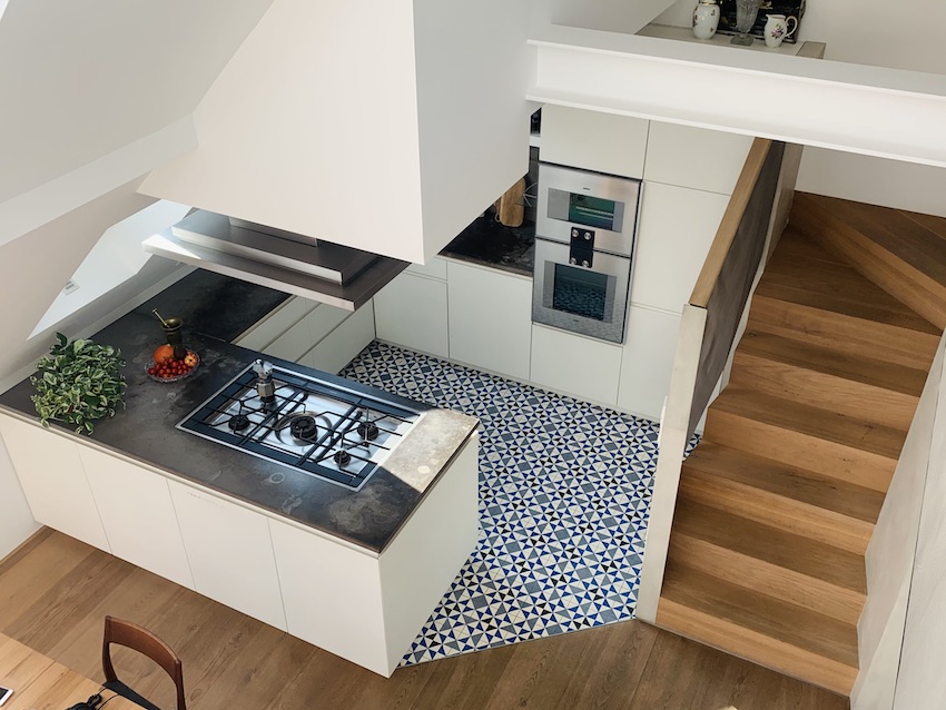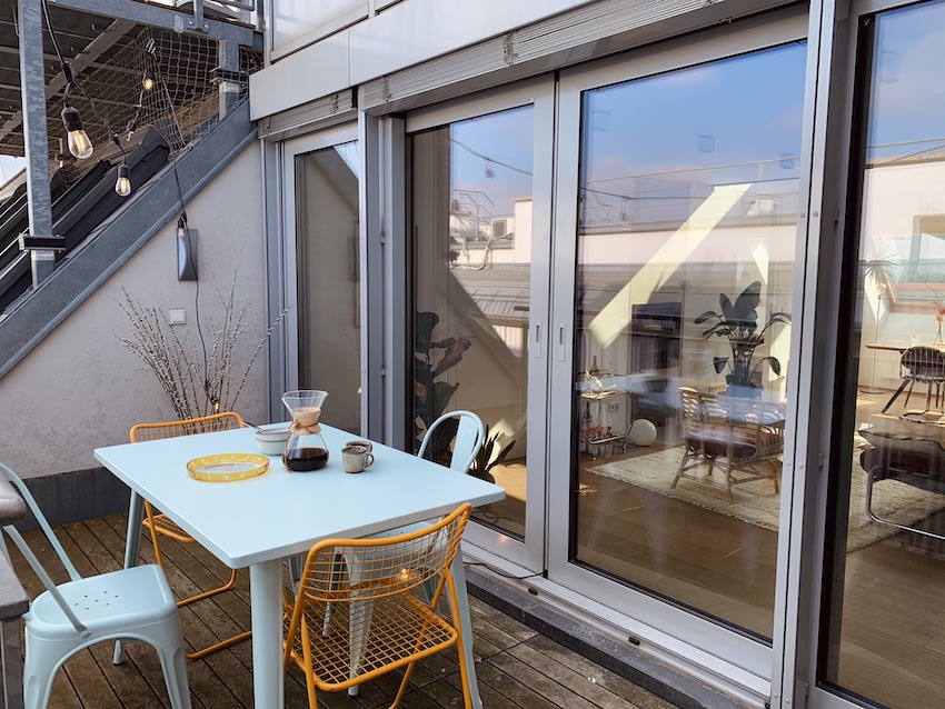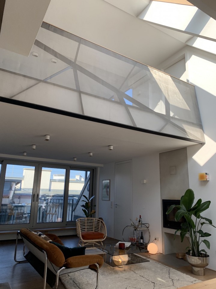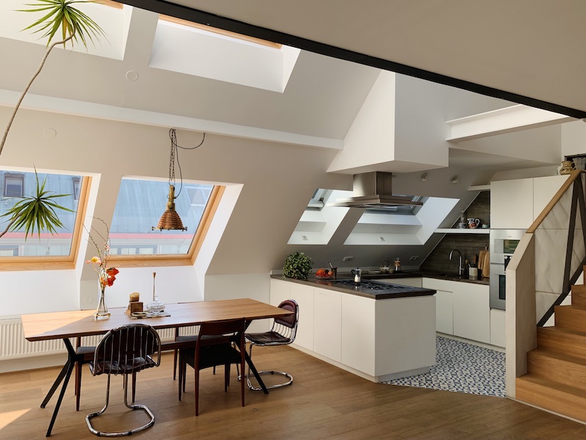 Experience modern urban living in this stunningly crafted home, designed to blend comfort with chic contemporary style across every corner. The heart of the home features a sunlit living room defined by its modern furniture, a cozy fireplace, and views framed by large windows that invite an abundance of natural light. The space is meticulously arranged with lush green plants and elegant decor elements such as a stylish wine table and velvety soft chairs, creating an inviting area for relaxation and entertaining. Adjacent to the living area, the open balcony doors reveal a serene outdoor balcony, perfect for morning coffees or evening wines under the city skyline. The dining and kitchen areas maintain a seamless flow, with a modern loft kitchen showcasing wooden dining furniture and stylish blue patterned tiles. The attic features airy, wooden dining setups surrounded by vibrant houseplants, offering a sense of tranquility and closeness to nature. The bedrooms epitomize calm and minimalism, with plush beddings, sleek design, and ample sunlight. The modern bathroom adds a touch of sophistication with contemporary fixtures set against gray tiles, ensuring both functionality and style. This residence makes no compromises on comfort or elegance, establishing itself as a perfect enclave for modern living.