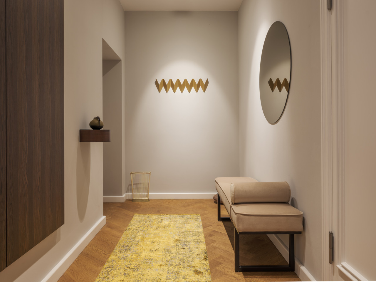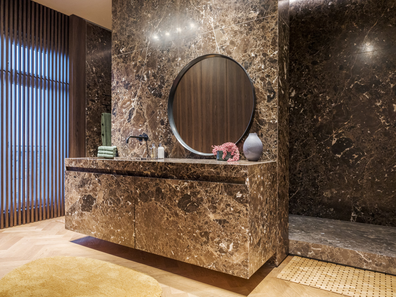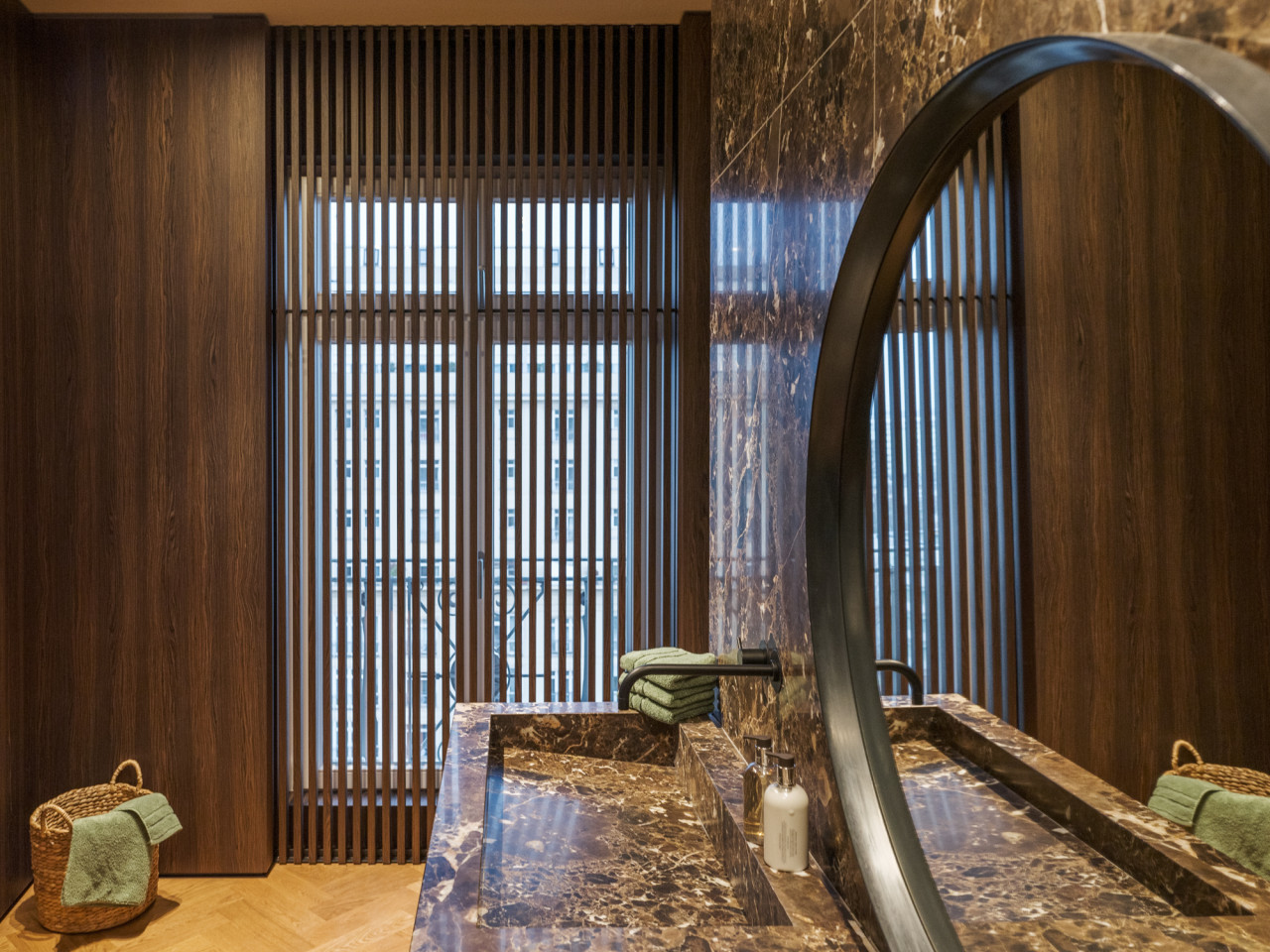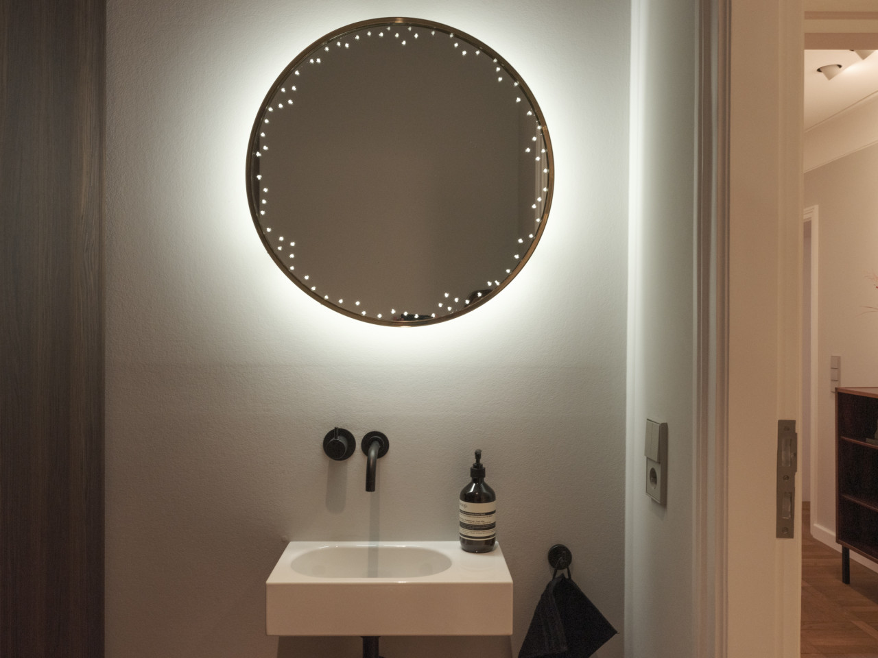 This stylish flat, located on the 11th floor in one of the Strausberger Platz apartment towers, impresses with its high-quality design. The floor of the bright and modern flat is laid with high-quality oak parquet. The living area is divided in a star shape into a study and the living room. The central and large dining area features an iconic tulip table. The floor-to-ceiling windows allow plenty of sunlight into the rooms. The modern kitchen is fitted with marble and wood panelling. The bedroom is furnished with a round designer bed. The bathroom is generously designed with brown marble and a walk-in shower.