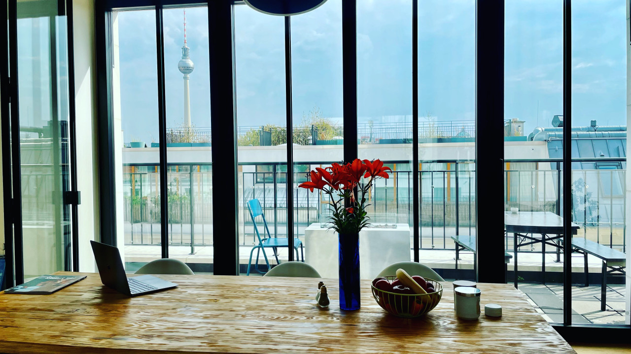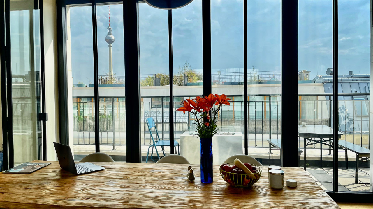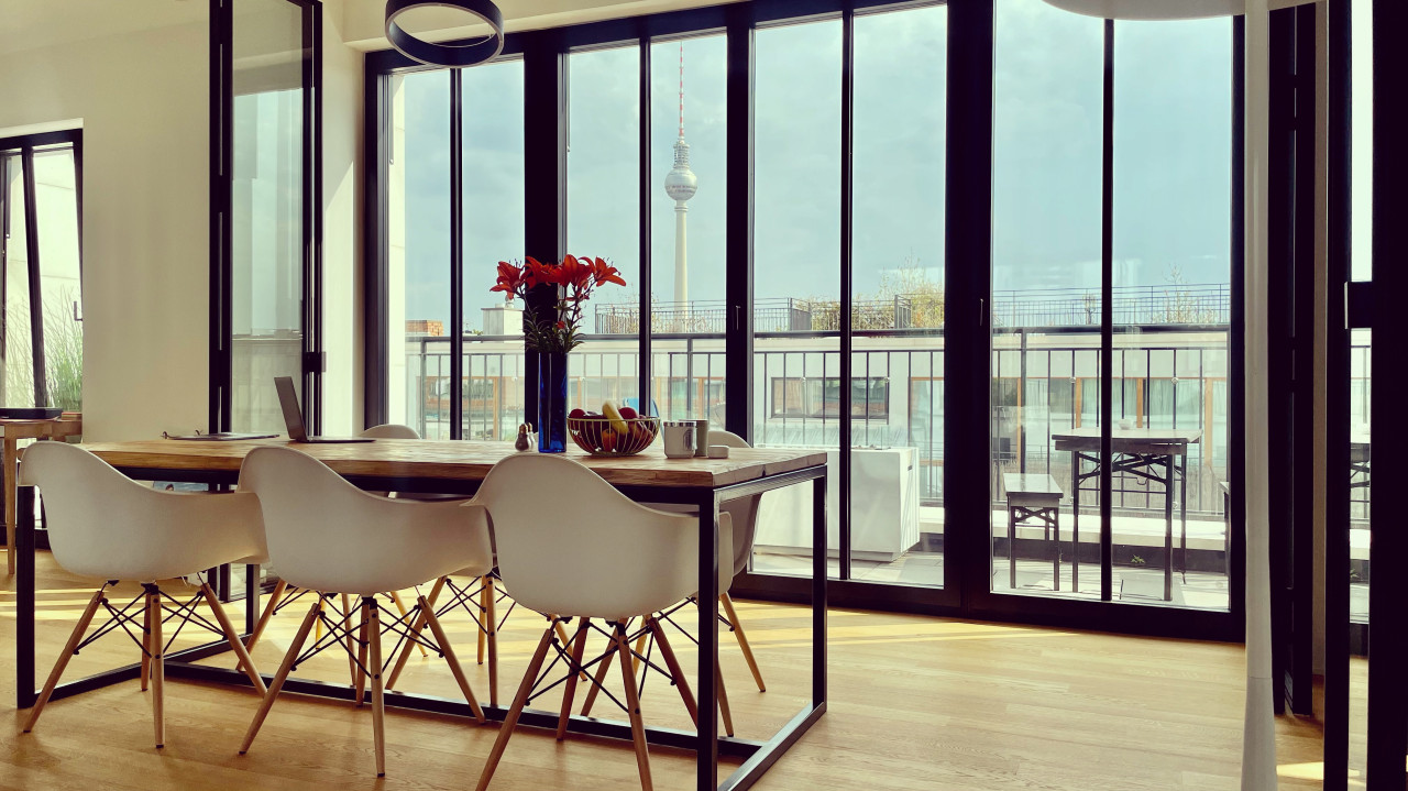 Luxury Penthouse with three terraces and a perfect view over Berlin. From the living room you see the iconic TV Tower right in front of the tall glass front.
